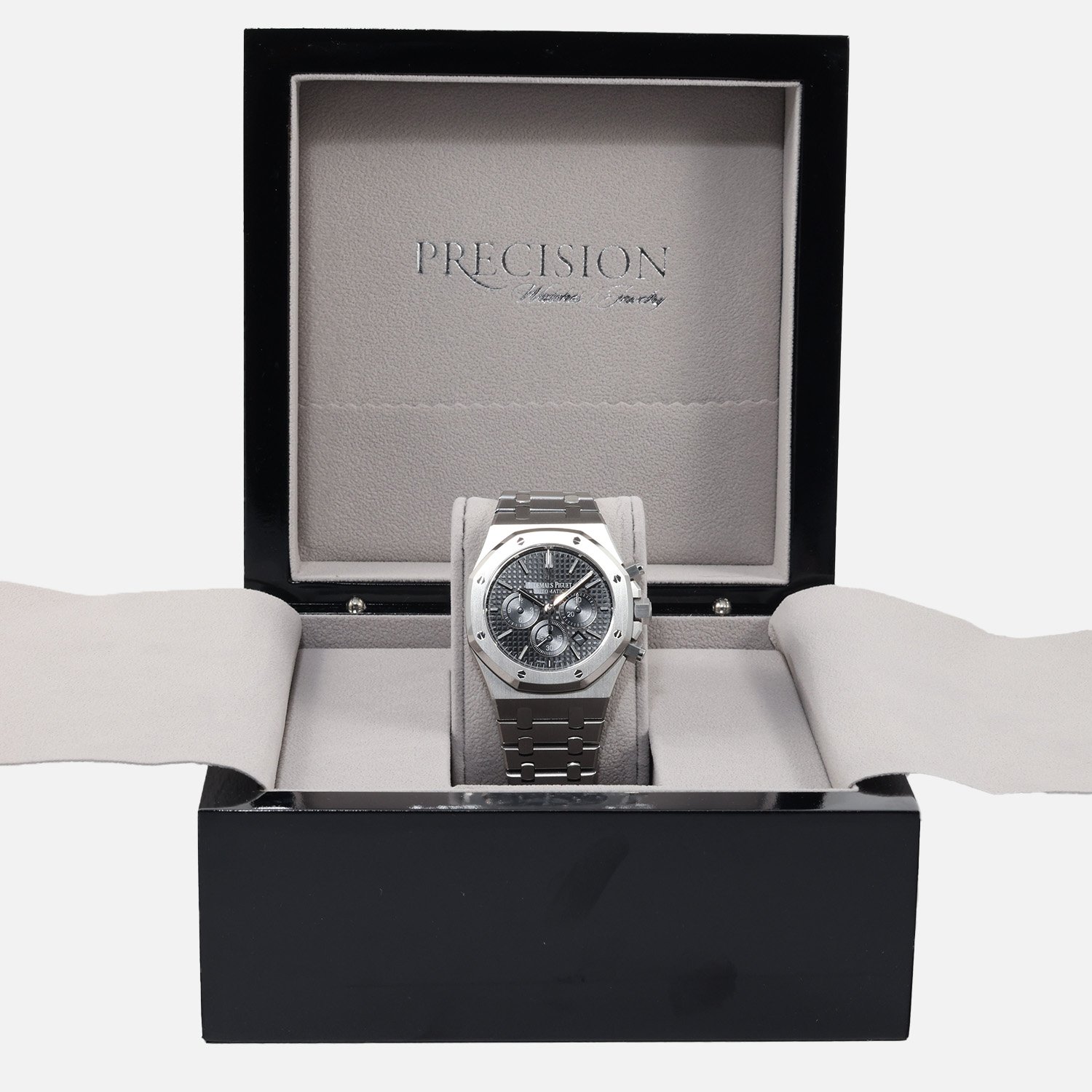 The stainless steel bracelet epitomizes both luxury and comfort, ensuring a smooth and comfortable fit on your wrist. The AP folding clasp secures the watch with ease, making it an ideal companion for all-day wear.