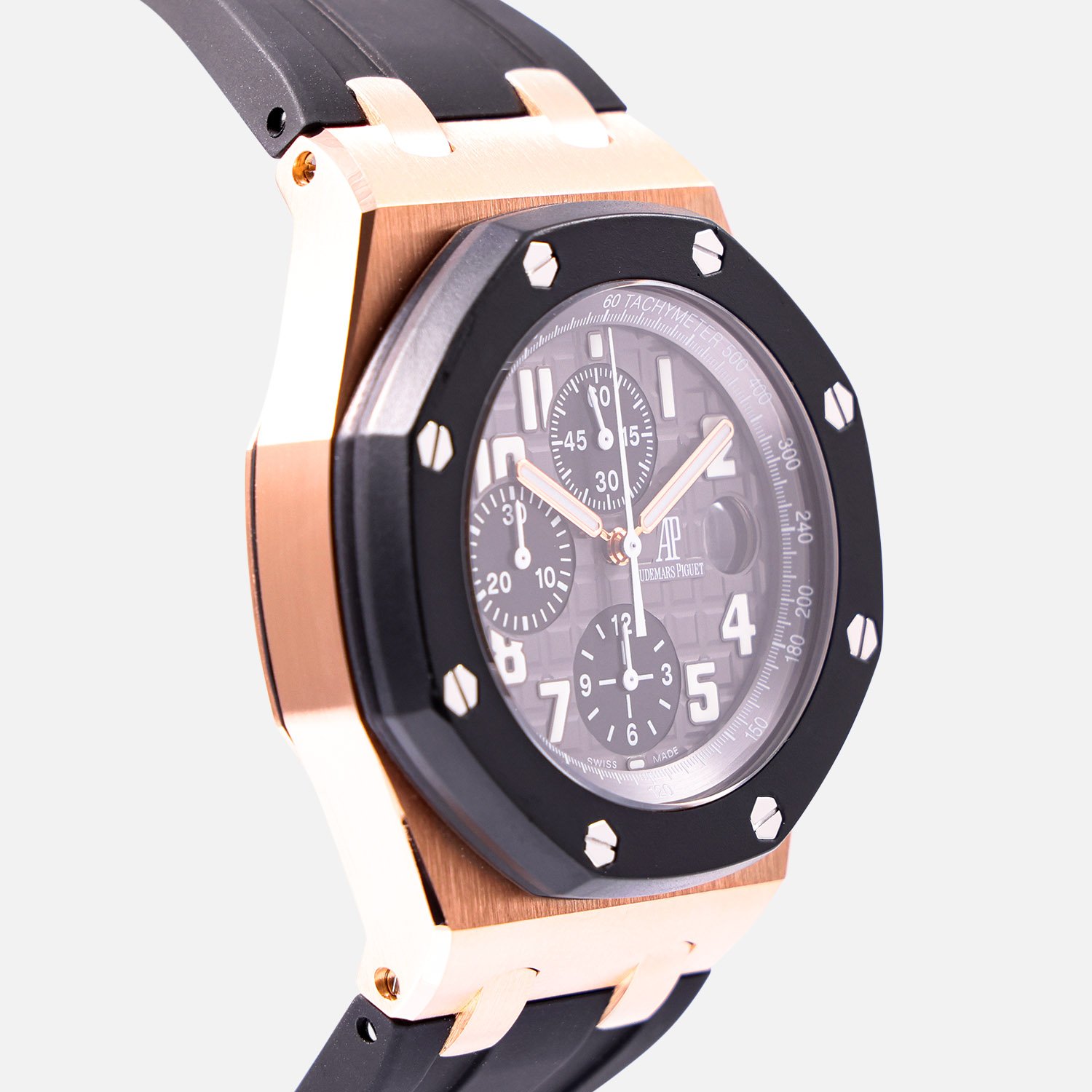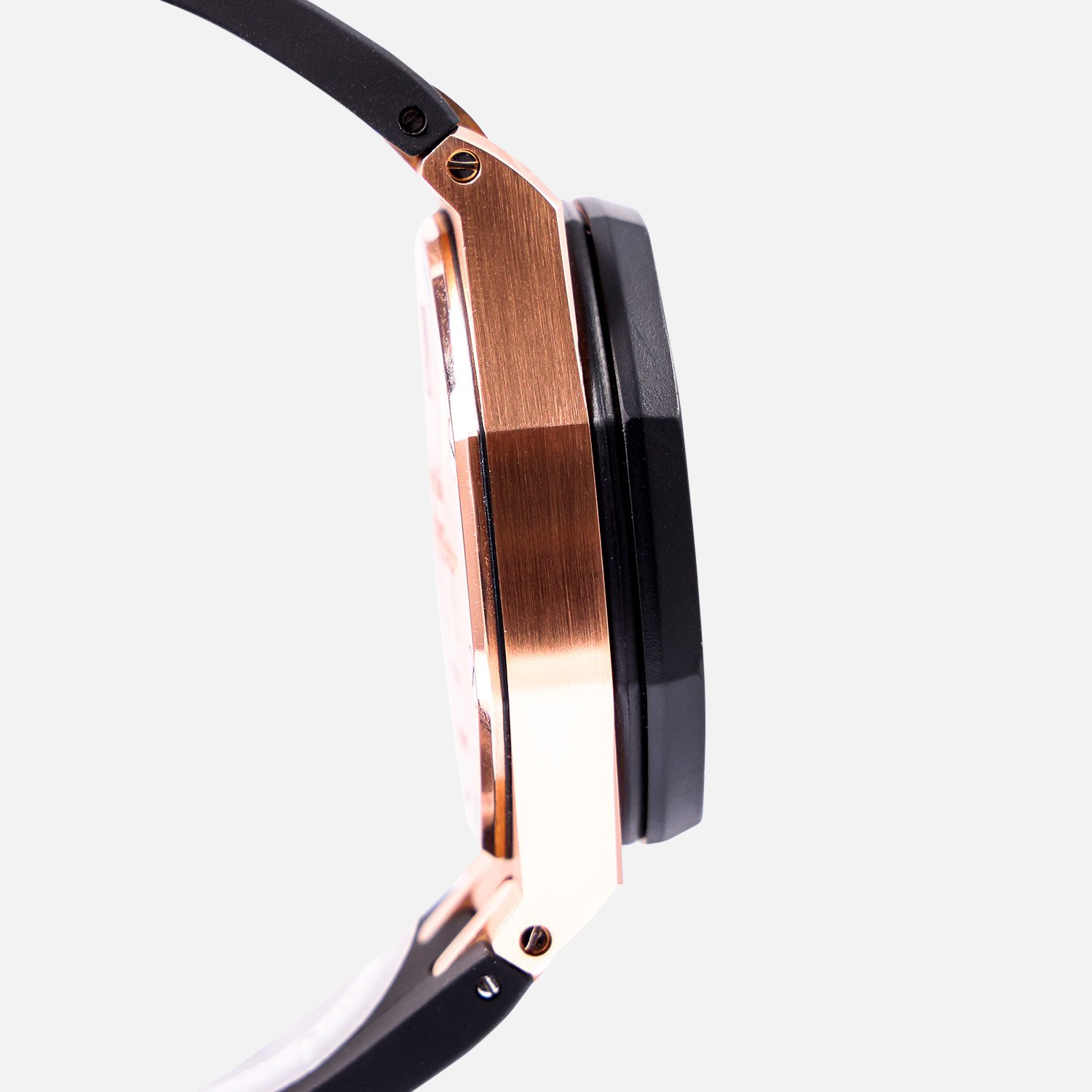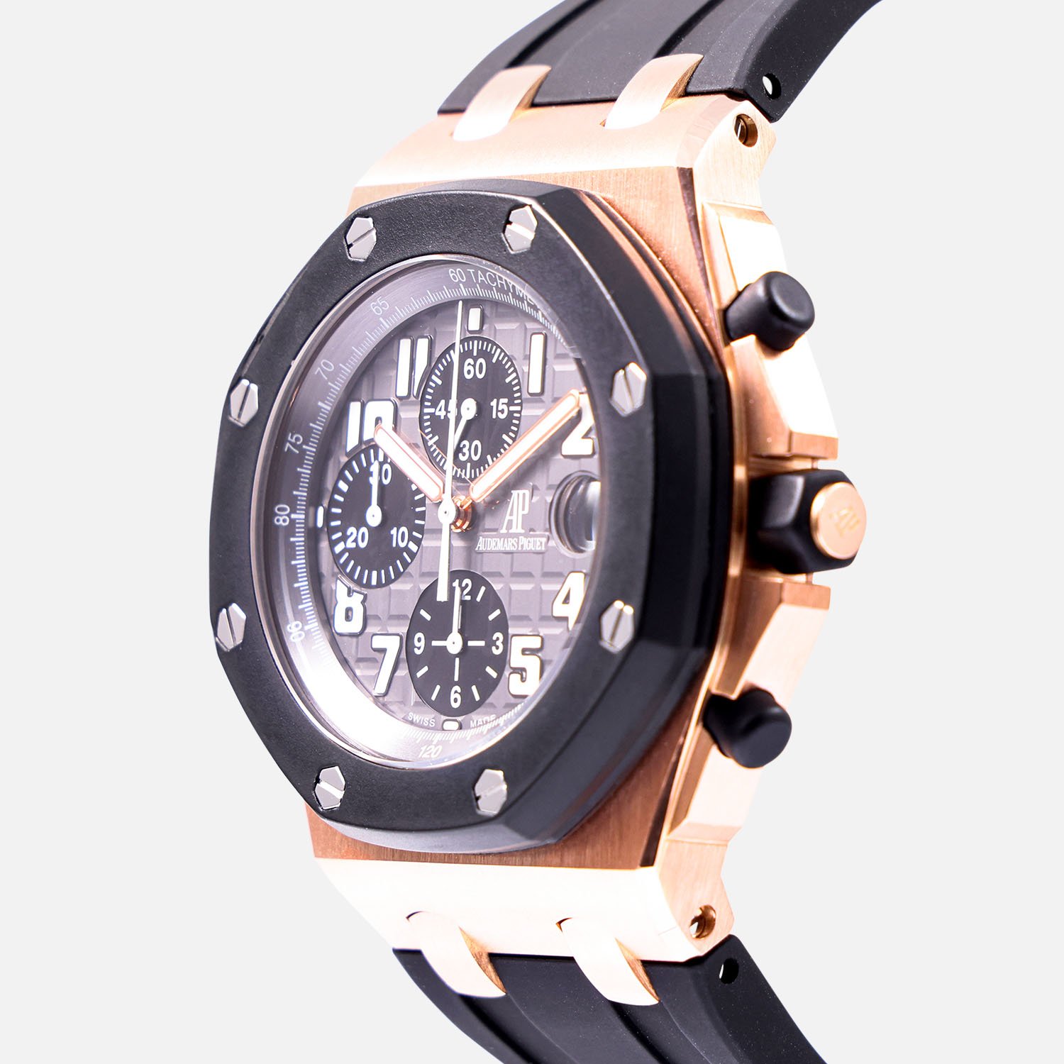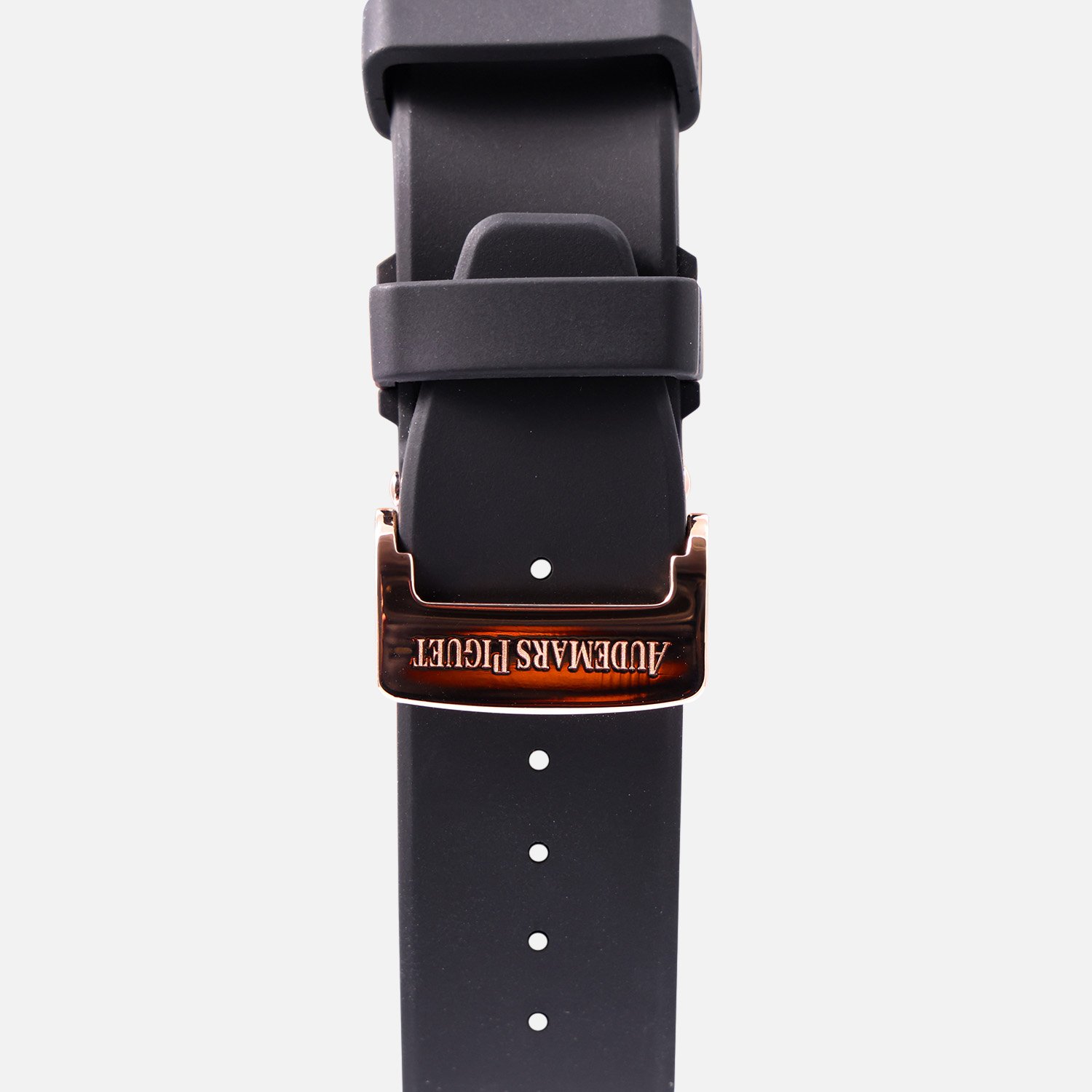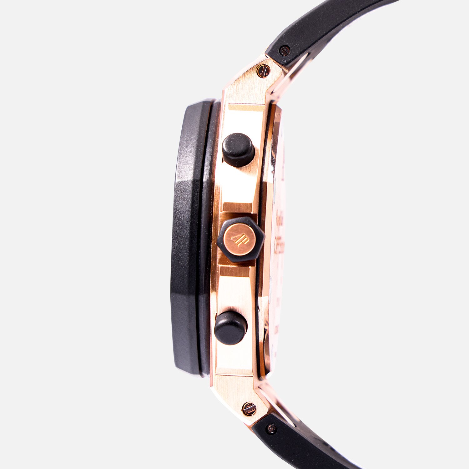 This Royal Oak Offshore model blends audacious aesthetics with technical sophistication. The 42 mm rose gold case is complemented by a rubber‑clad bezel, crown, and pushers for a bold “rubber clad” look. The grey Tapisserie dial features oversized Arabic numerals, rose gold hands with luminescent fill, a small seconds counter at 12 o’clock, and a 30‑minute chronograph at 9 o’clock.