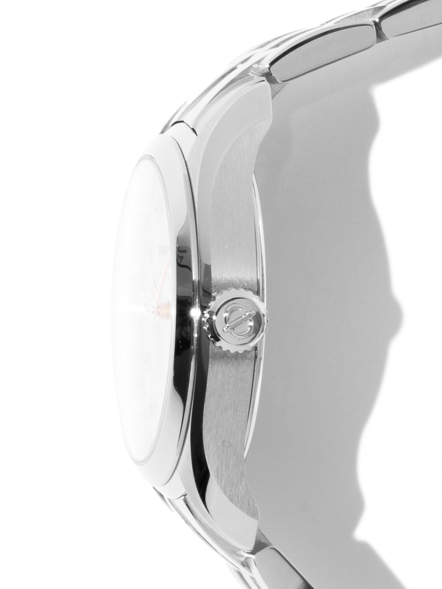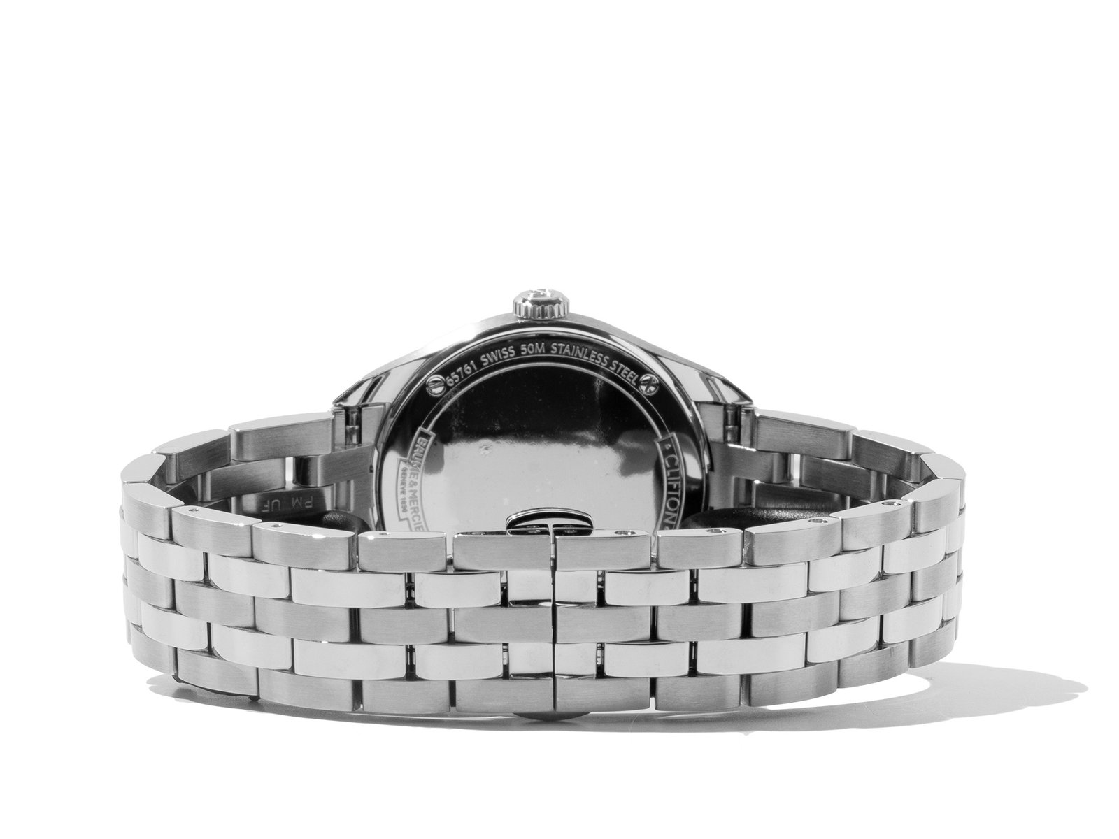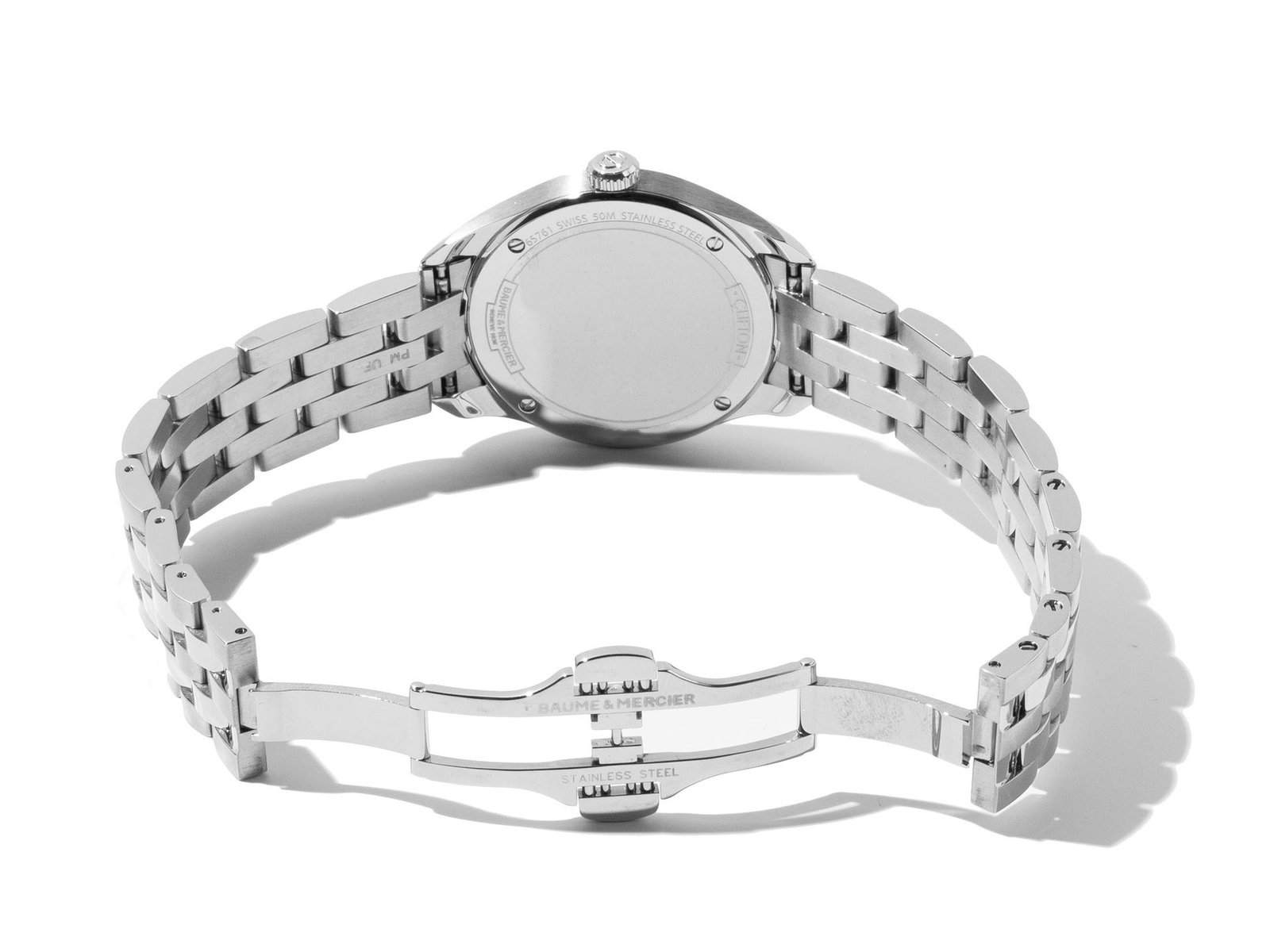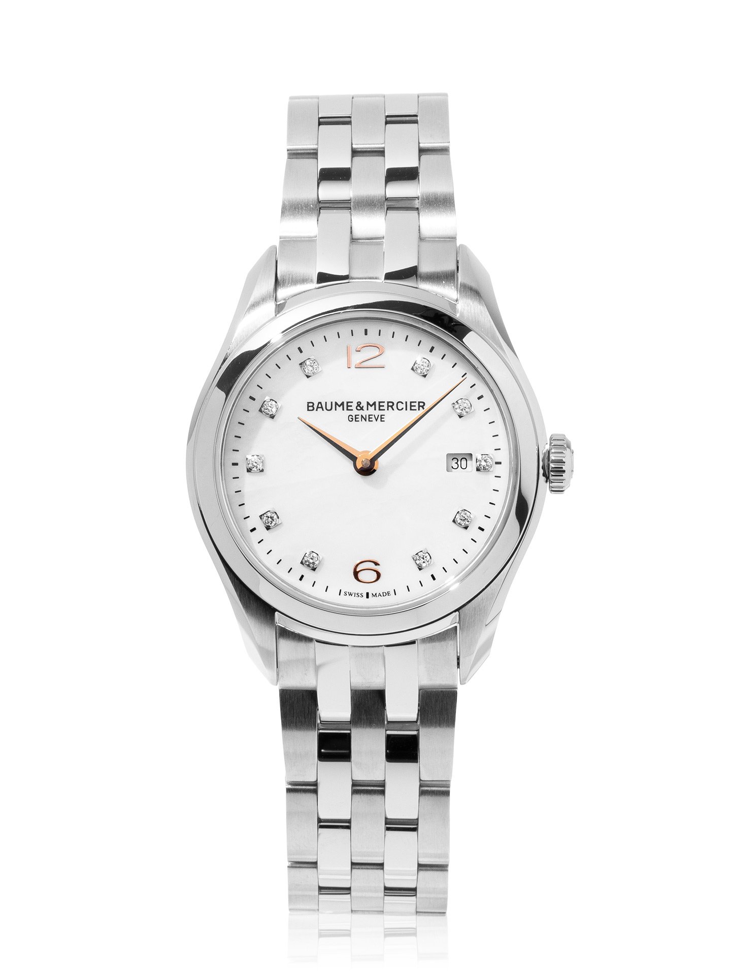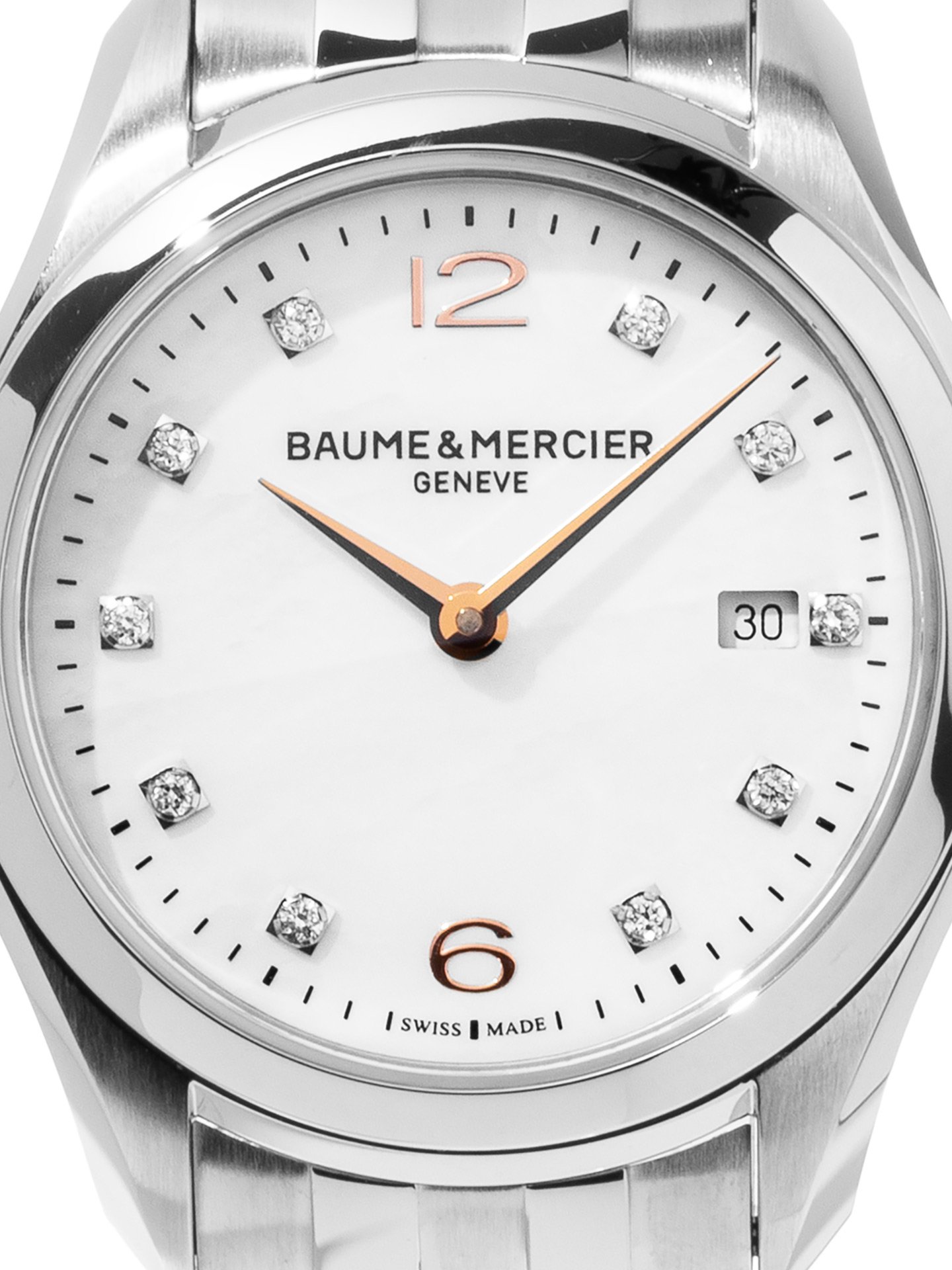 Stainless steel Baume & Mercier Clifton MOA10176 watch, water resistance to 50m, with date and diamond indexes.