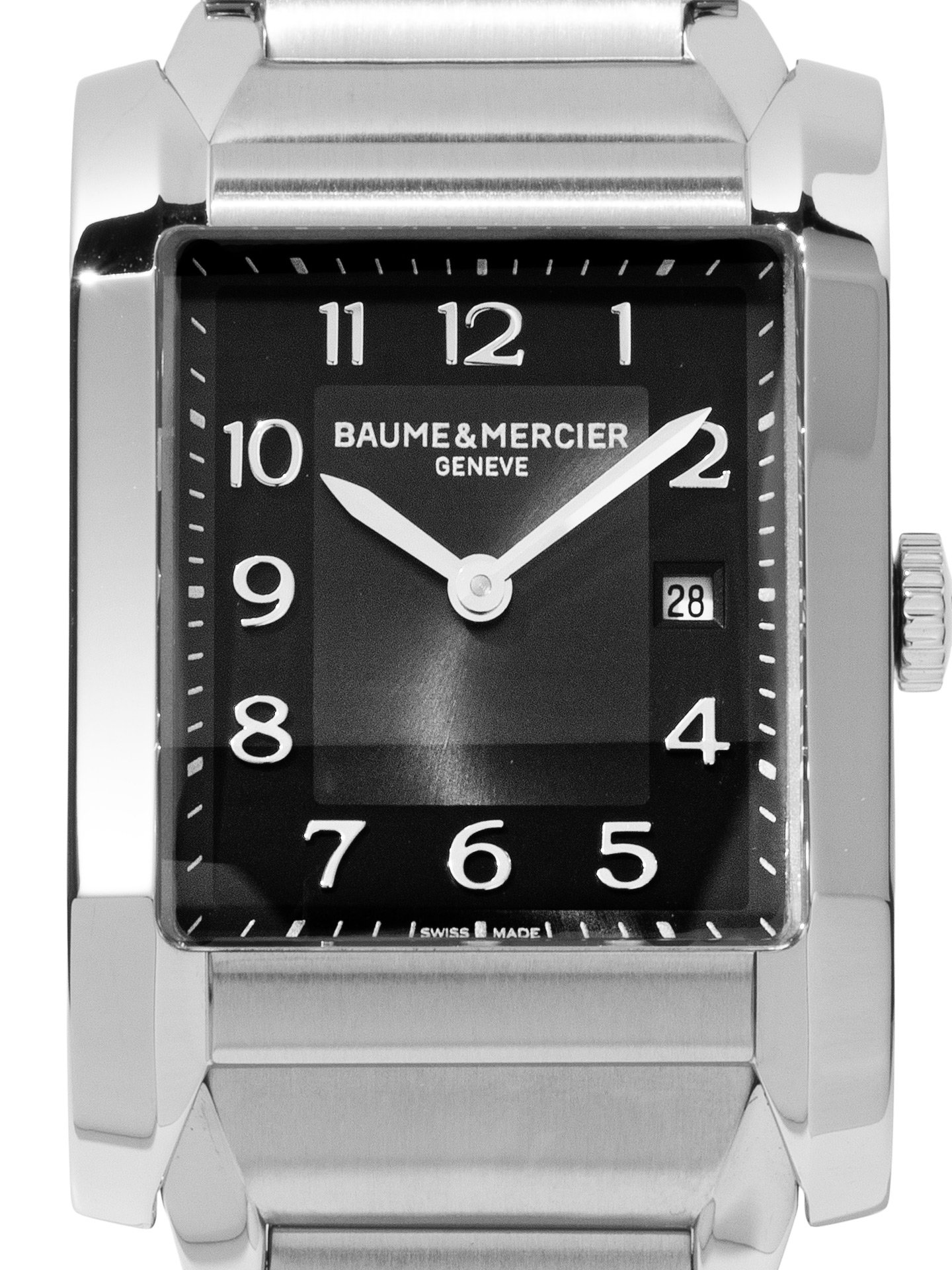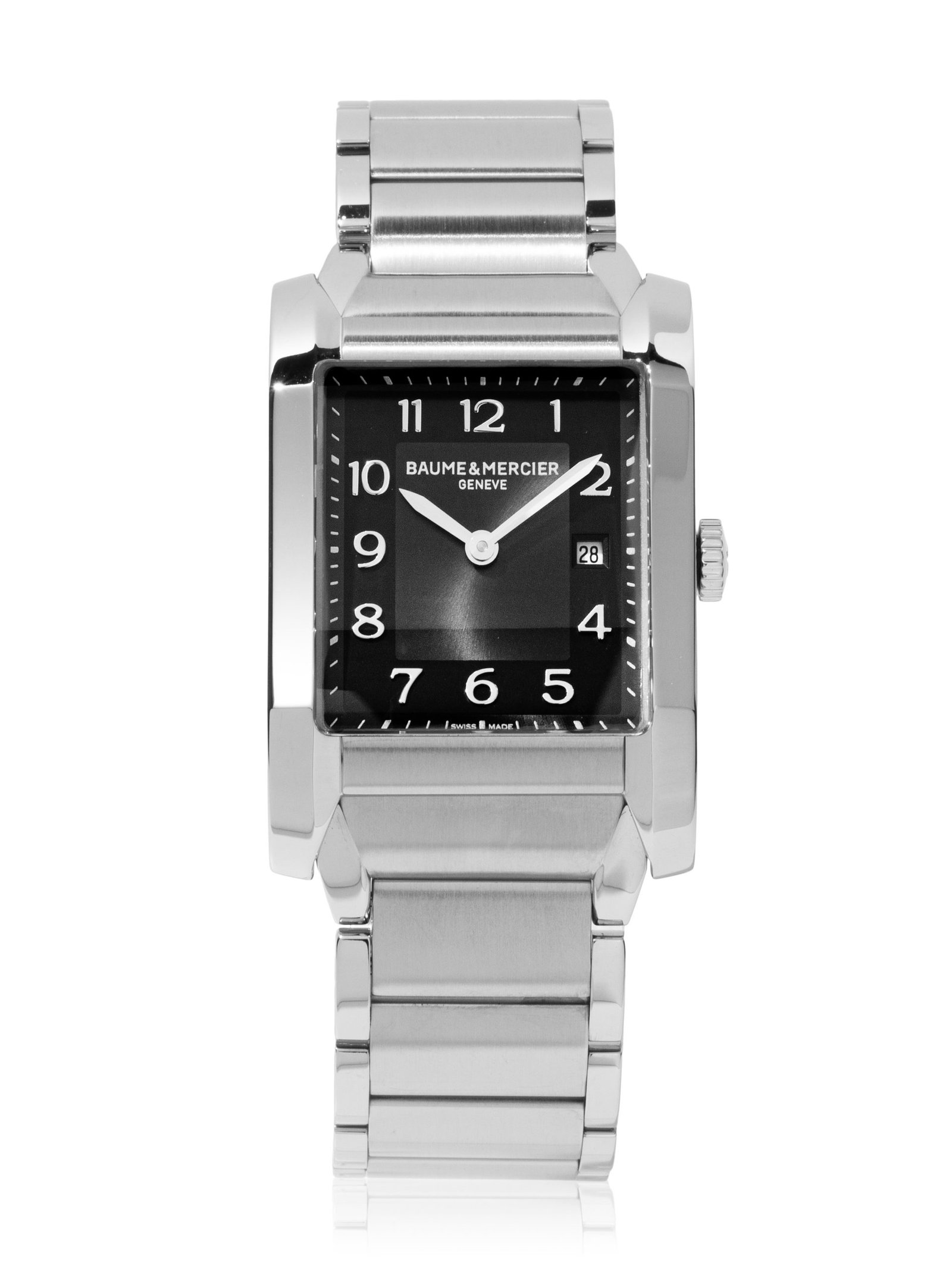 Stainless steel Baume & Mercier Hampton quartz watch with a 27mm x 40mm case, black dial, and bracelet with folding clasp. Features include hours, minutes, and date. Comes with a Deluxe Gift Box and 2 Year Precision Watches Store Warranty.​