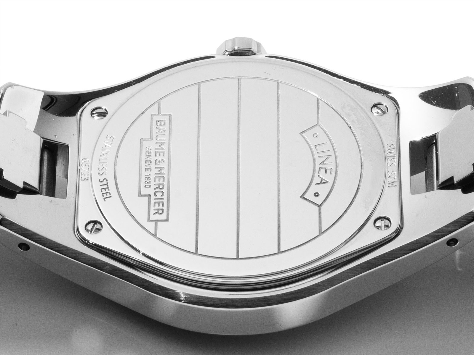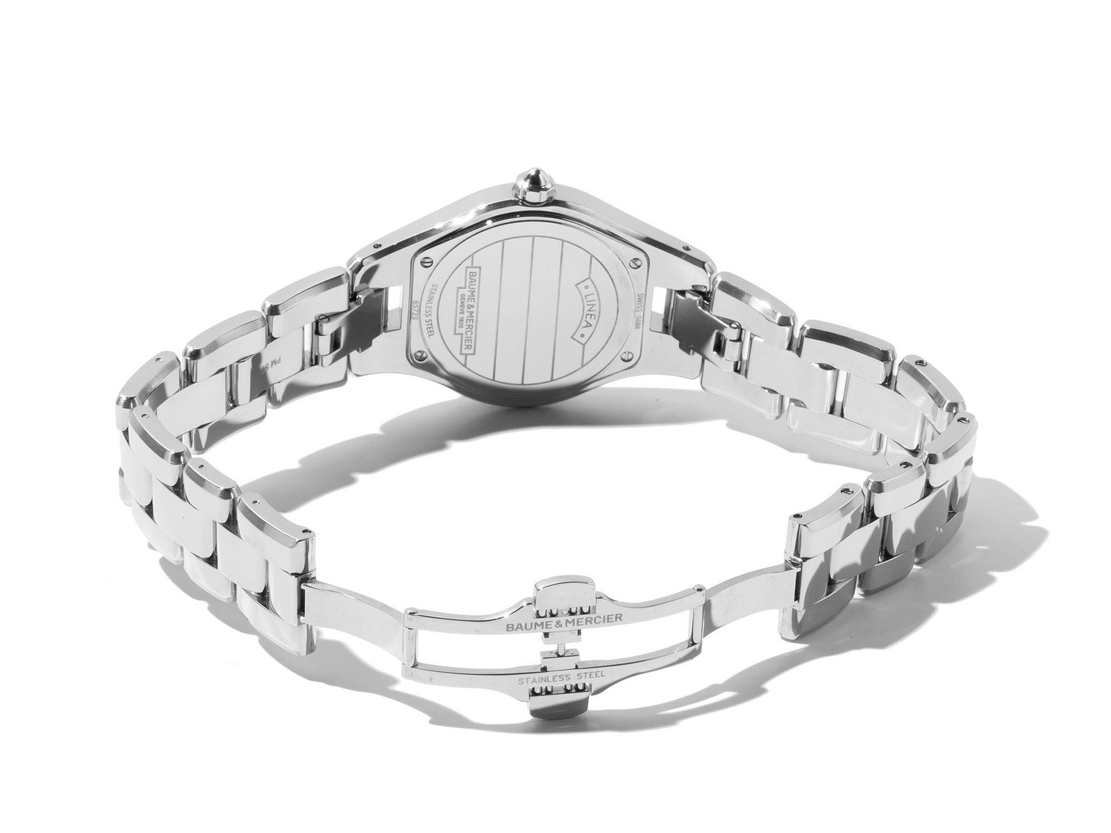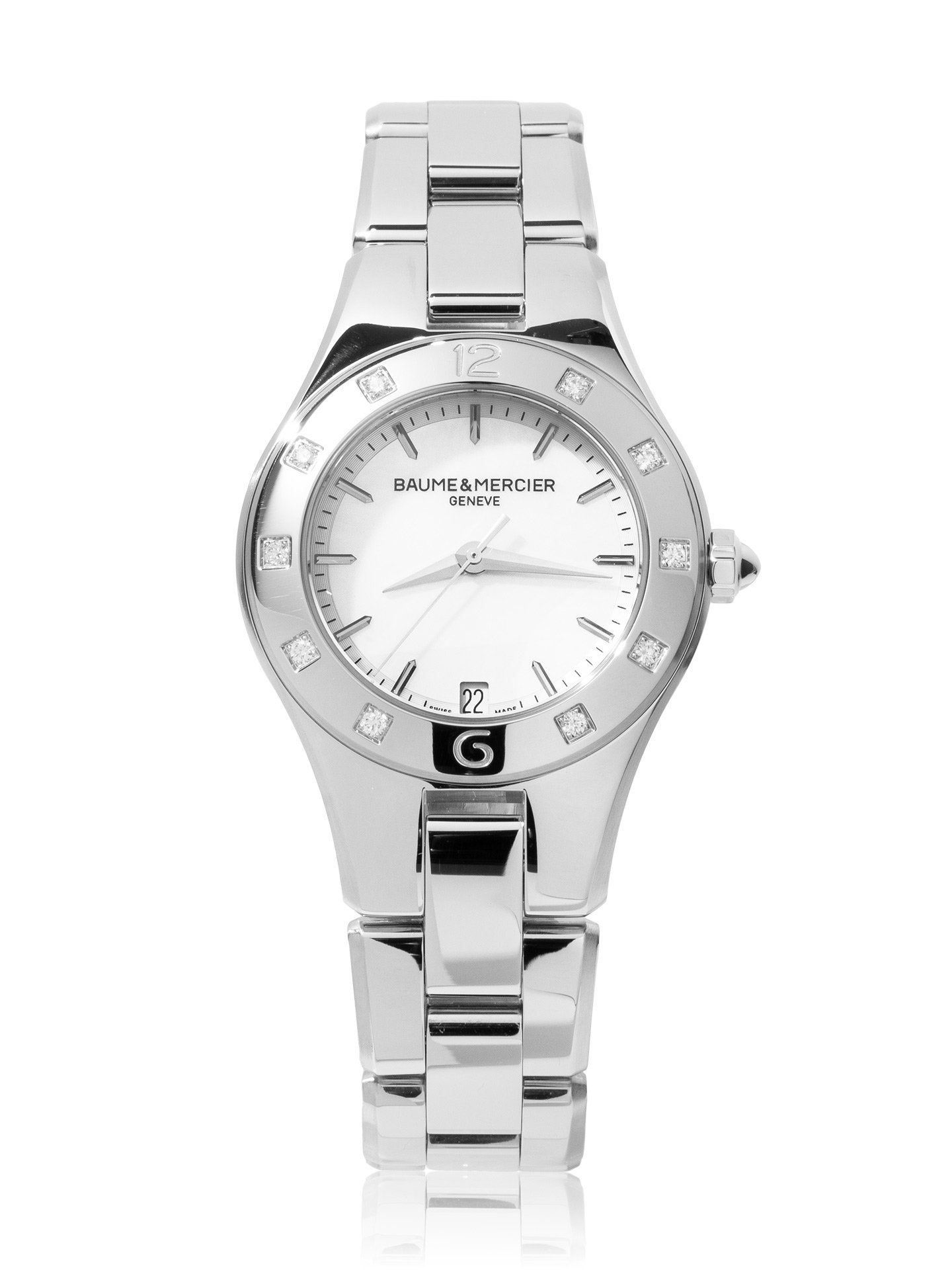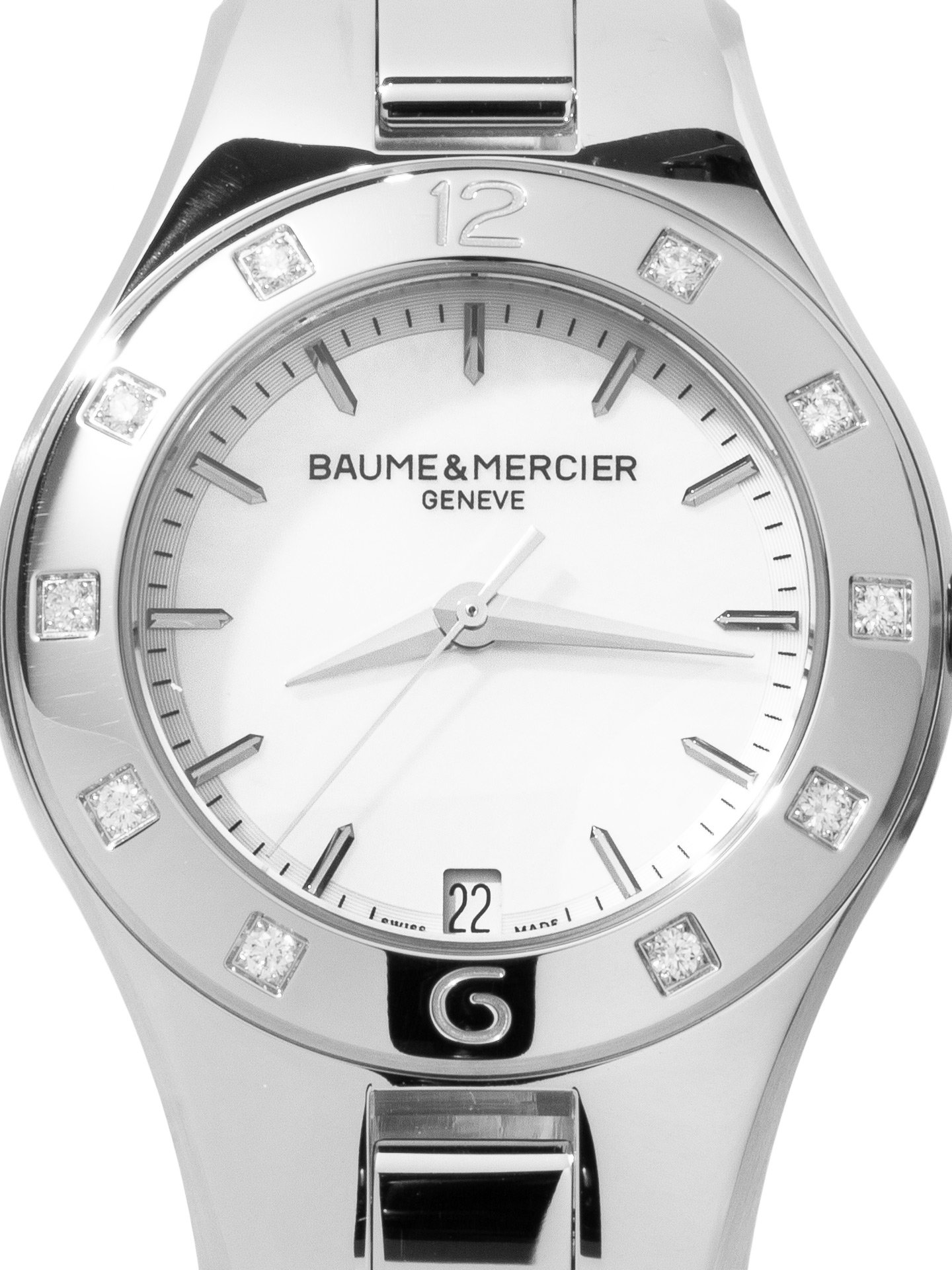 Stainless steel Baume & Mercier Linea MOA10071 watch, water resistant to 50m, with date and diamond bezel.