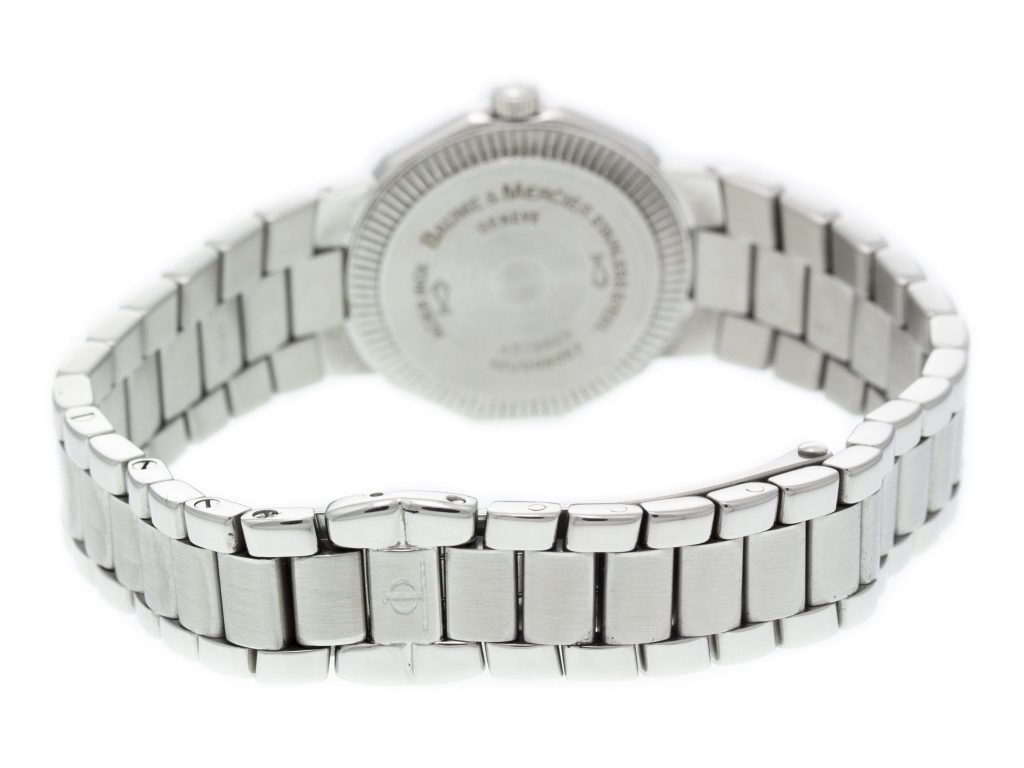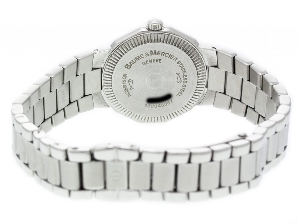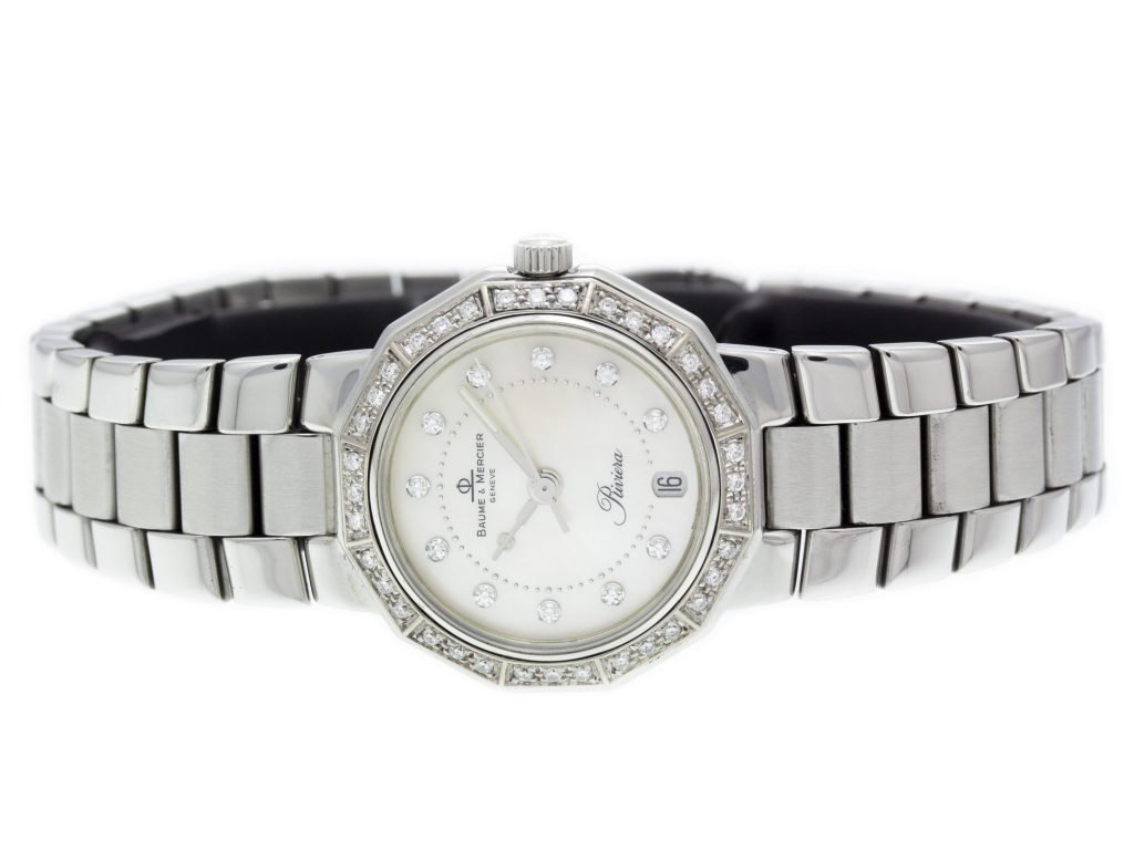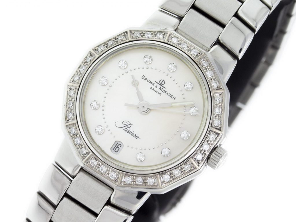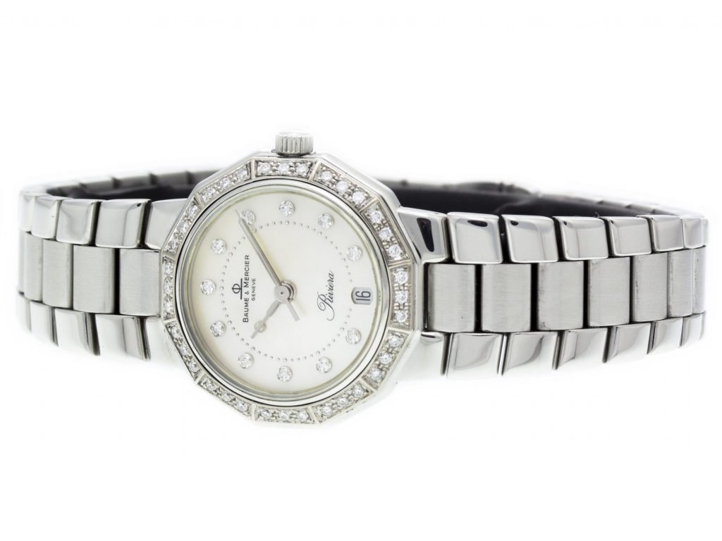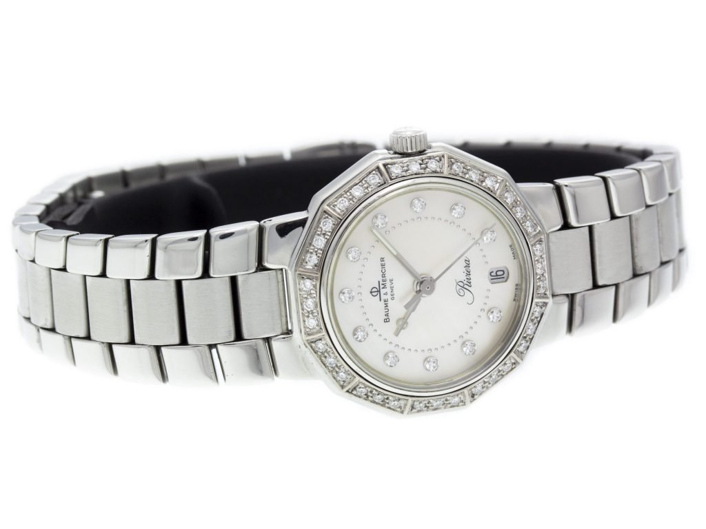 Stainless steel Baume & Mercier Riviera quartz watch with a 24.5mm case, mother of pearl diamond dial, and bracelet with folding clasp. Features include hours, minutes, seconds, and date. Comes with a Deluxe Gift Box and 2 Year Precision Watches Store Warranty.​
