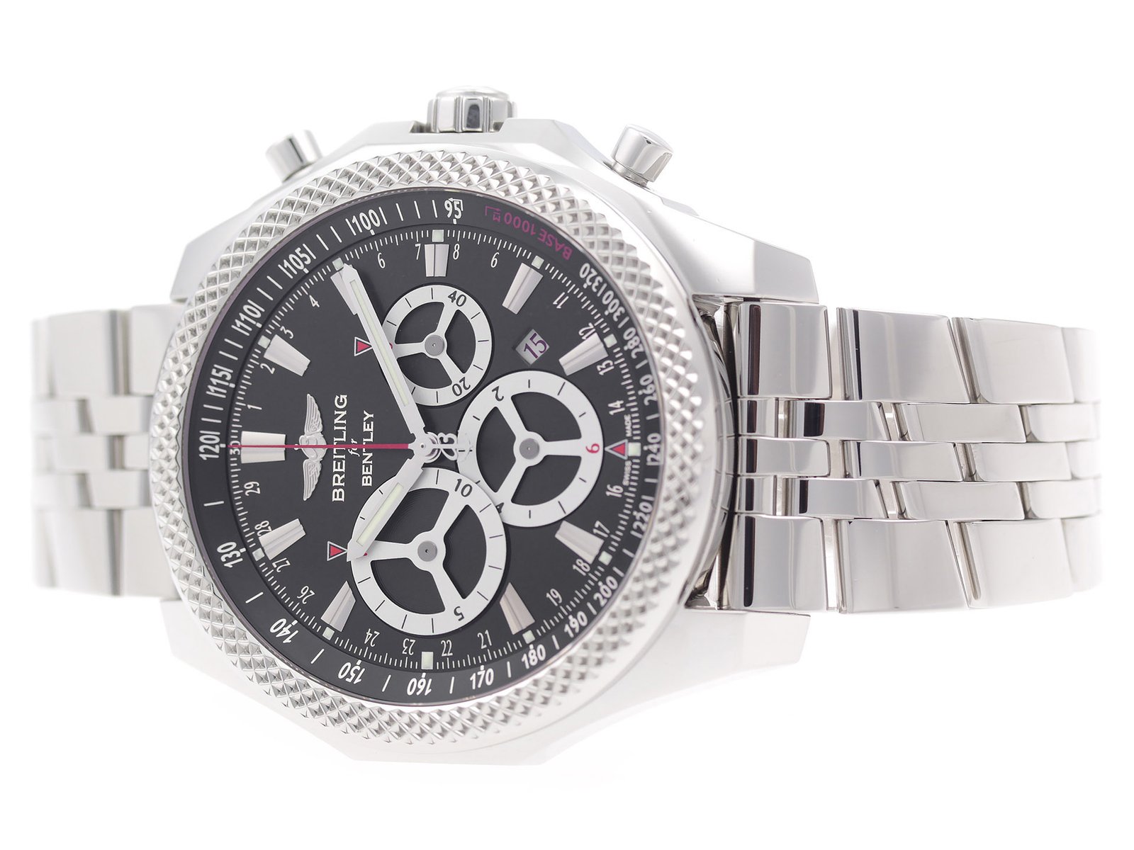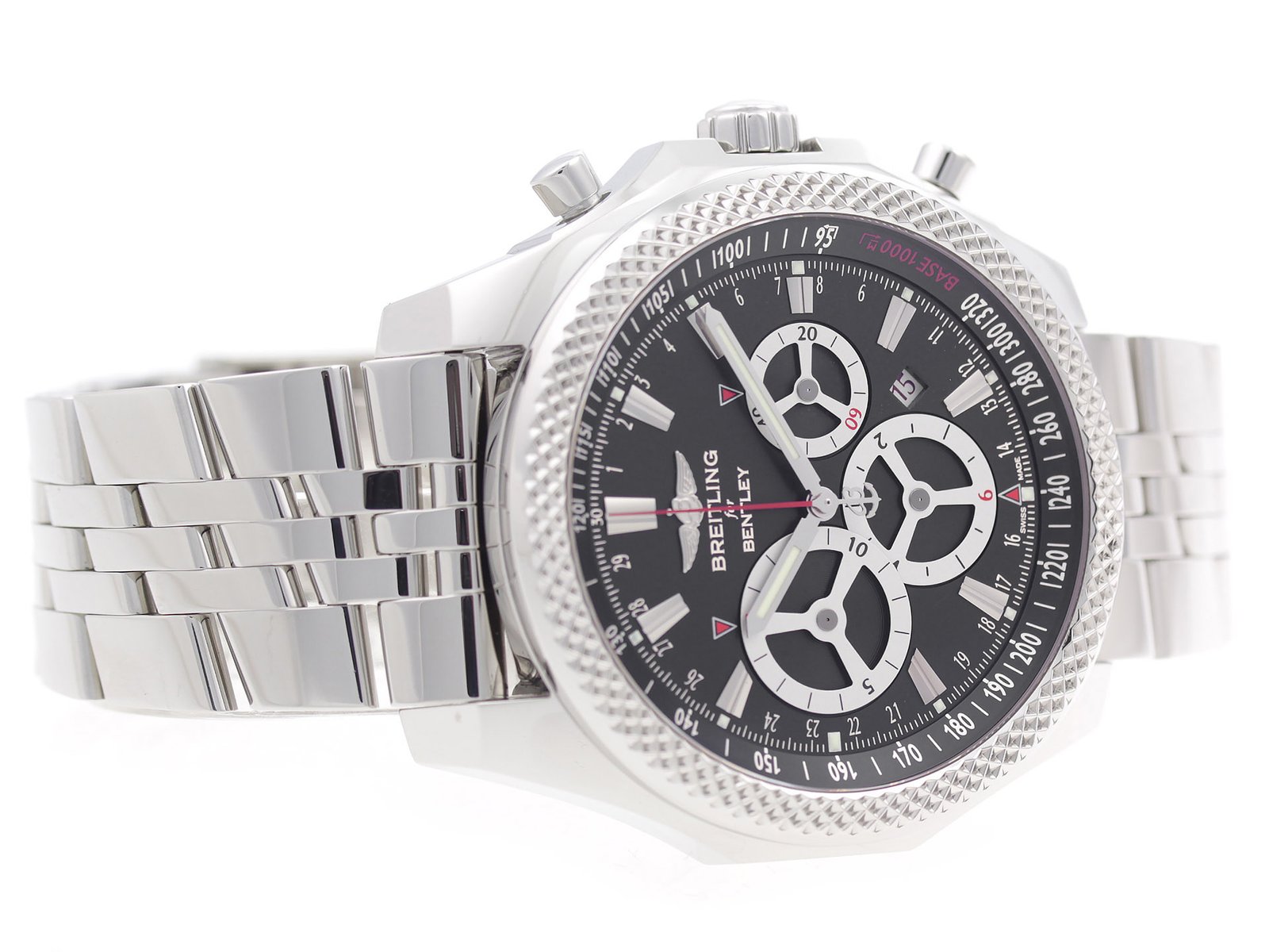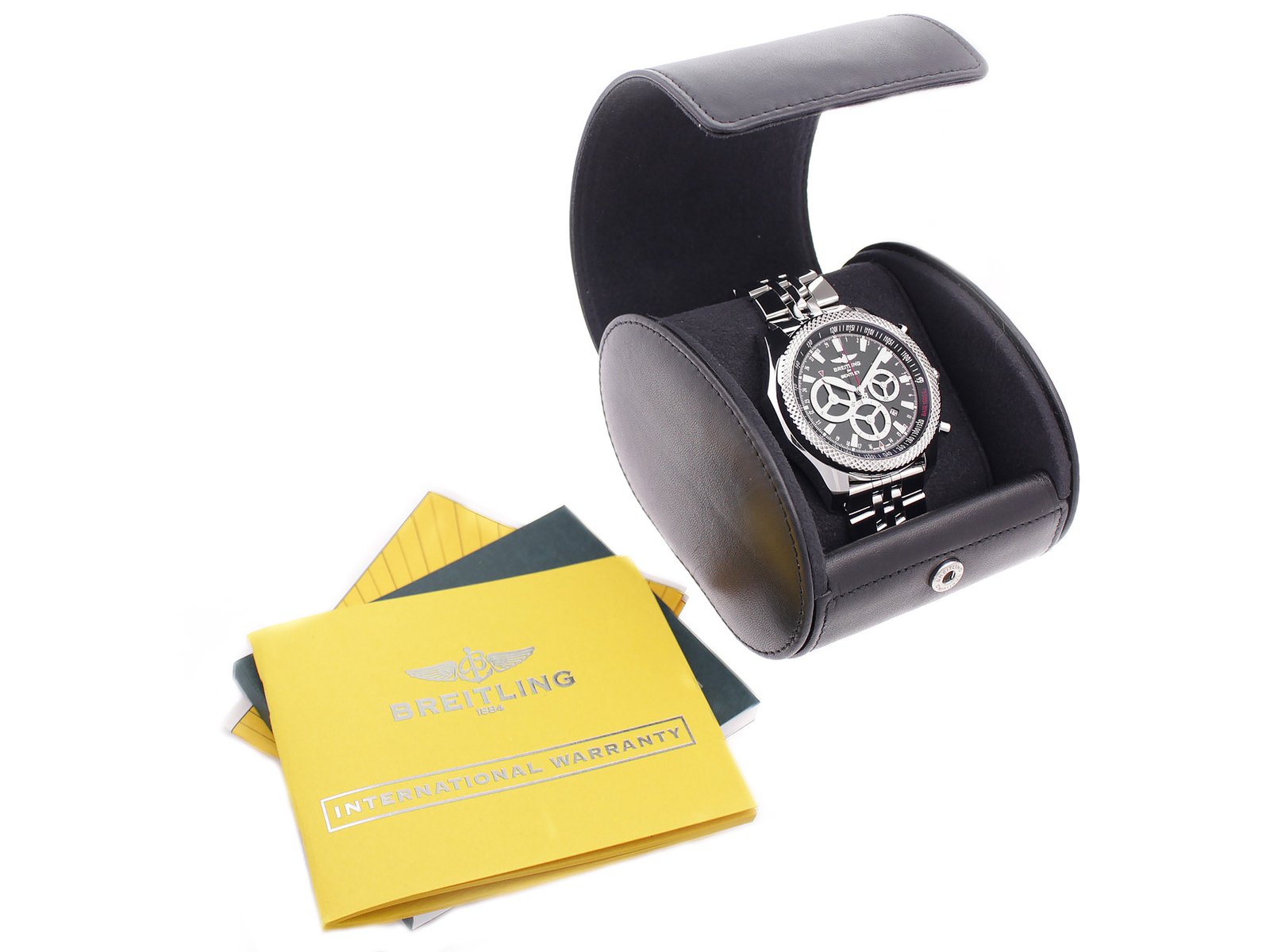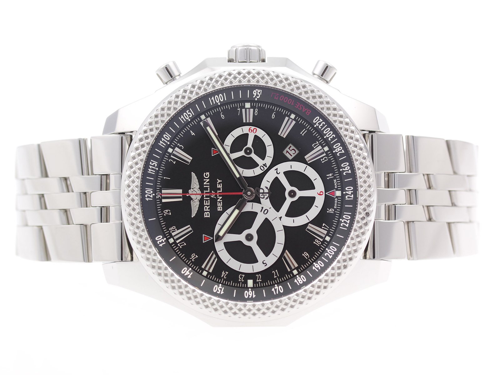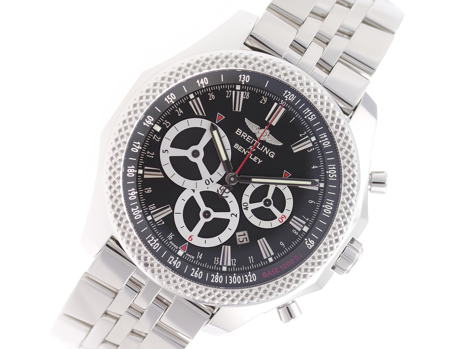 | Box/Papers: | Breitling Box & Papers | Hands: | Luminescent Steel Hands, Red Chrono Hand | |