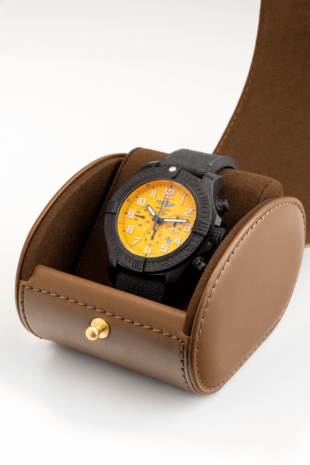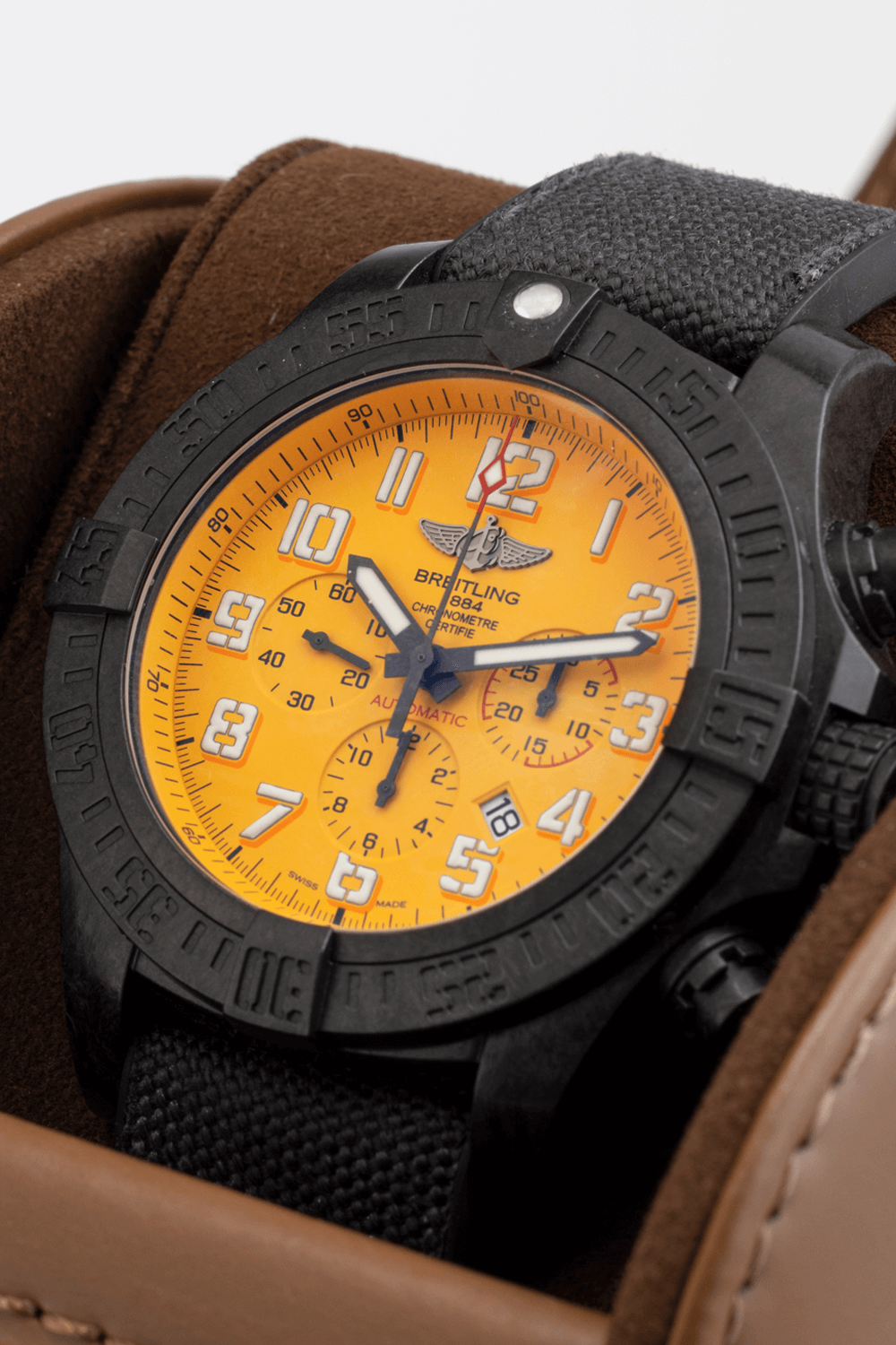 The Pre-Owned Breitling Avenger Hurricane (XB01701E4/I533) is a self-winding automatic watch inside of a 50MM ultralight polymer case with a military canvas and rubber strap and a deployment clasp. It features a cobra yellow dial with 3 subdials and white arabic numeral hour markers. The watch has been fully serviced and comes in a Breitling box and factory Attestation de Chrono as well as a 2-year Precision Watches Warranty.