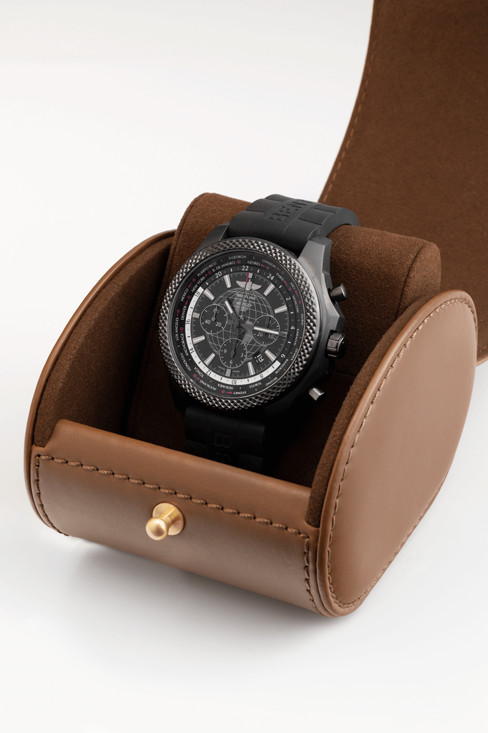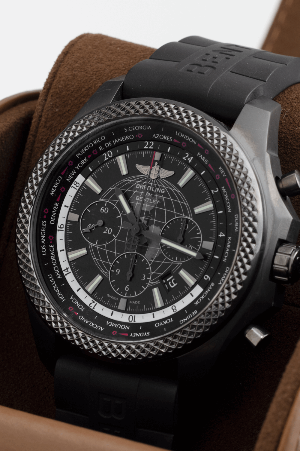 The Pre-Owned Breitling Bentley World Time Chronograph (MB0521V4/BE46-244S) is a self-winding automatic watch inside of a 49MM stainless steel case on a black rubber strap with a deployment clasp. It features a black globe dial with 3 subdials and index hour markers with world time cities around the outer rim. The watch has been fully serviced and comes in a Breitling box and a 2-year Precision Watches Warranty.