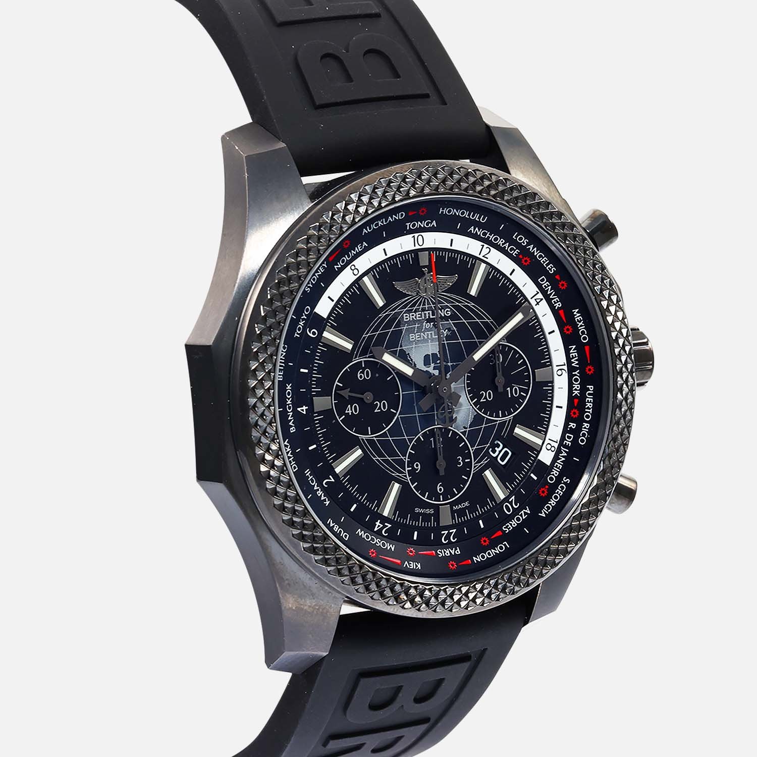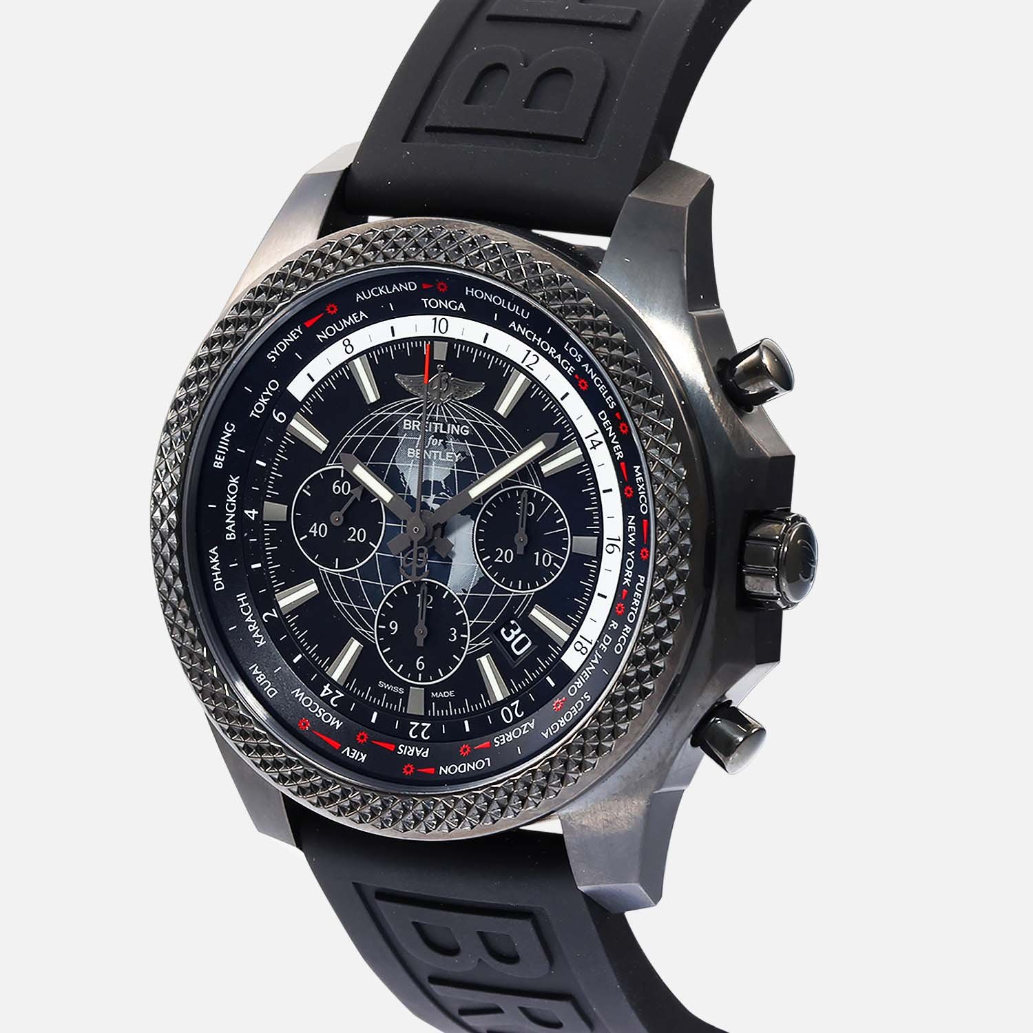 Introducing the Breitling Bentley World Time Chronograph Limited Edition 219/500 MB0521V4/BE46-265S, a watch that embodies the fusion of luxury and functionality. The black PVD stainless steel case, with a fixed bezel, gives a bold and striking look to the watch. The globe-patterned black dial with index markers adds to its sophistication, making it a versatile accessory that can complement any outfit.