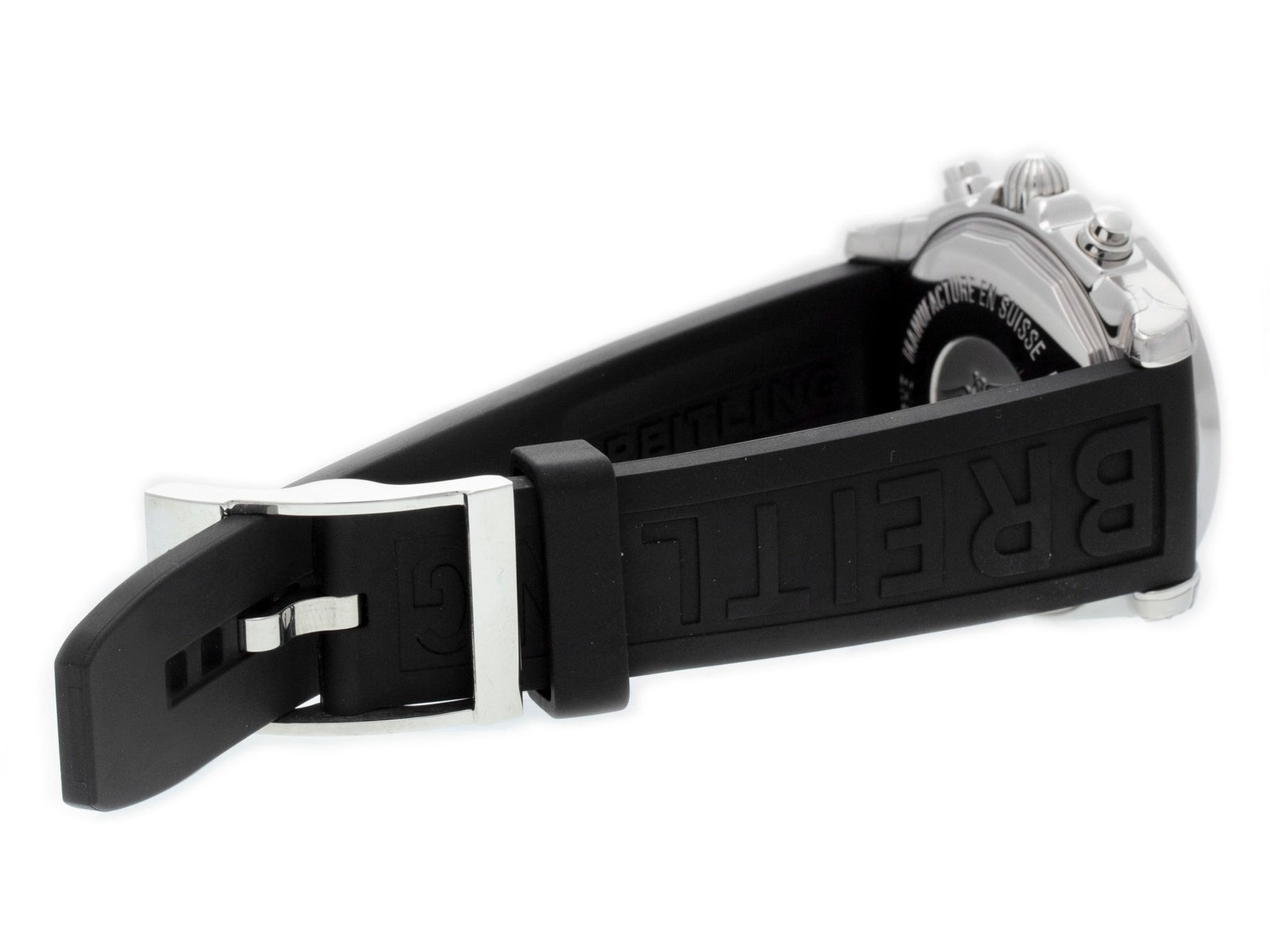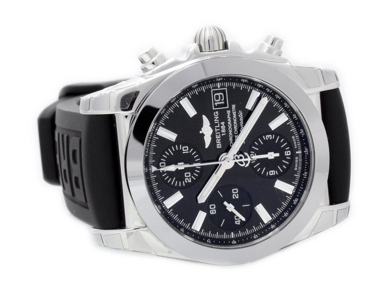 Stainless steel Breitling Chronomat 38 SleekT automatic watch with a 38mm case, black dial, and black rubber strap with tang buckle. Features include hours, minutes, seconds, date, and chronograph. Comes with a Deluxe Gift Box and 2 Year Precision Watches Store Warranty.