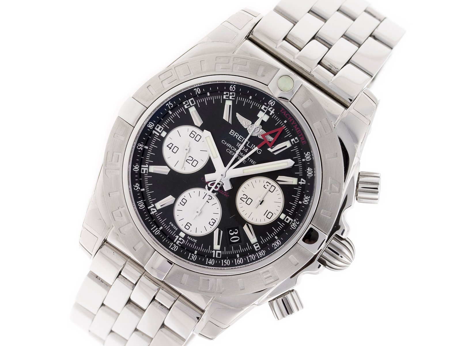 Stainless steel Breitling Chronomat 44 GMT automatic watch with a 44mm case, black dial, and pilot bracelet with folding buckle. Features include hours, minutes, seconds, date, GMT, tachymeter, and chronograph. Comes with a Deluxe Gift Box and 2 Year Precision Watches Store Warranty.