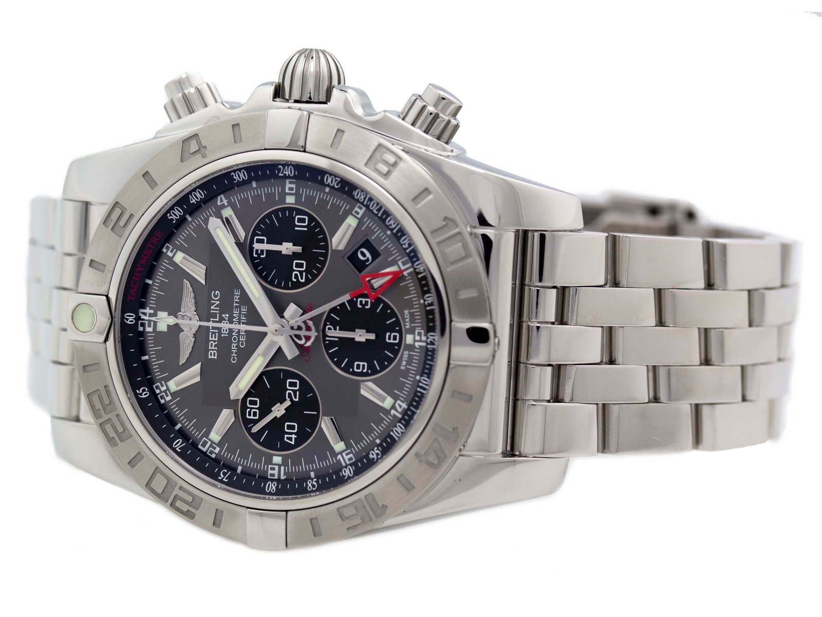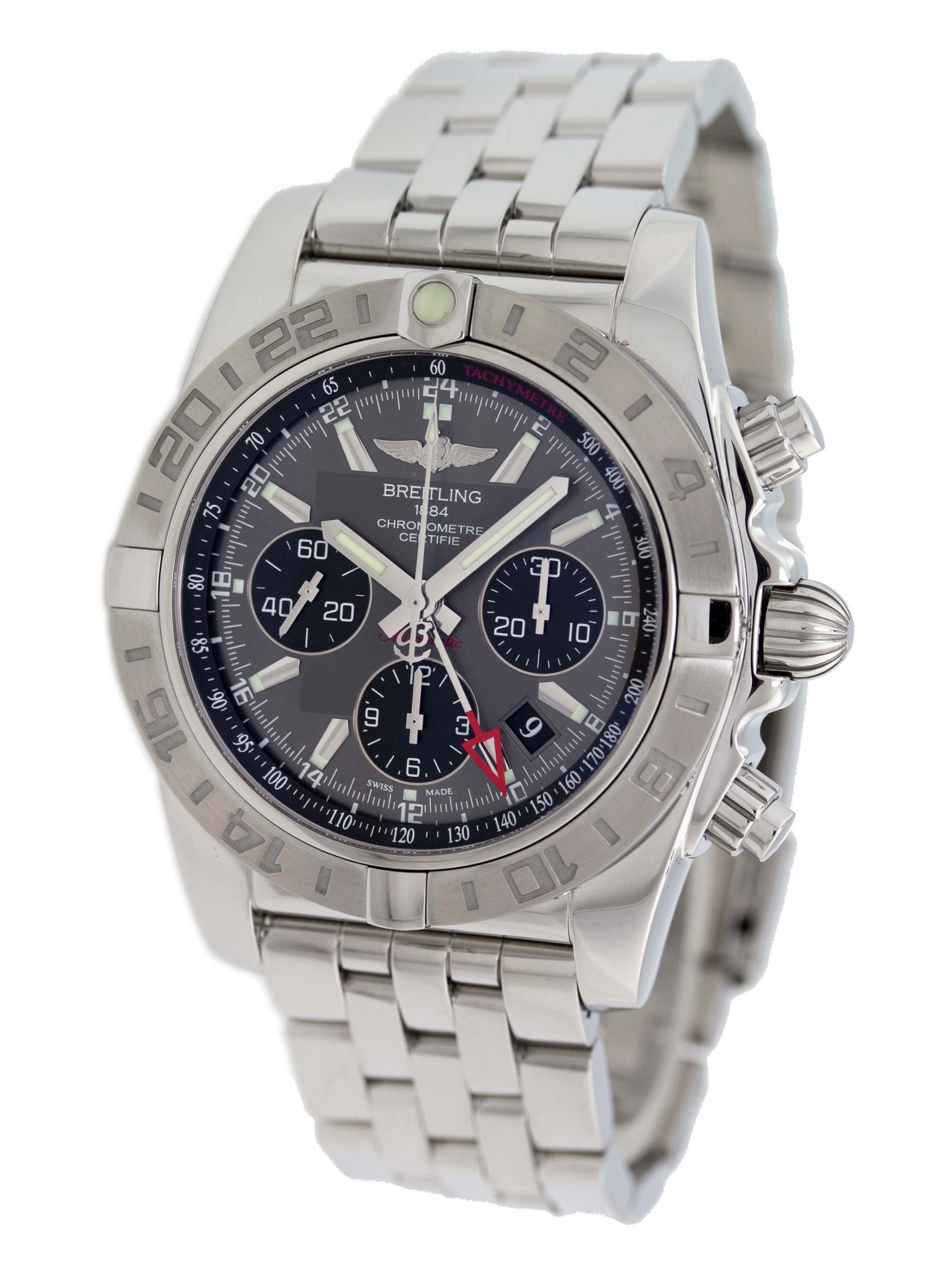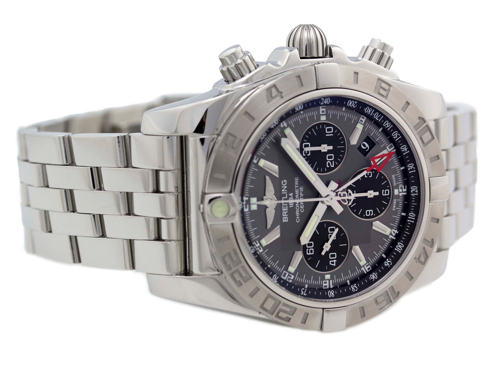 Breitling – Chronomat 44 GMT – 44mm – Stainless Steel – Bi-Directional Rotating Timing Bezel – Grey Stick w/ Three Black Subdials Dial – Stainless Steel Pilot Bracelet