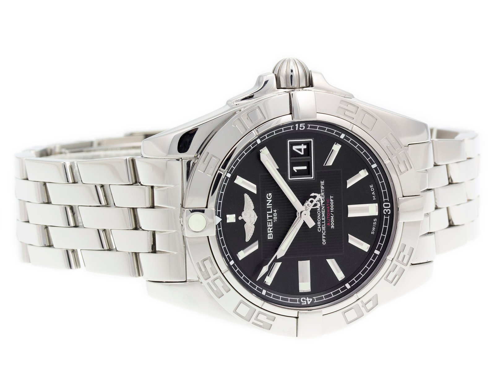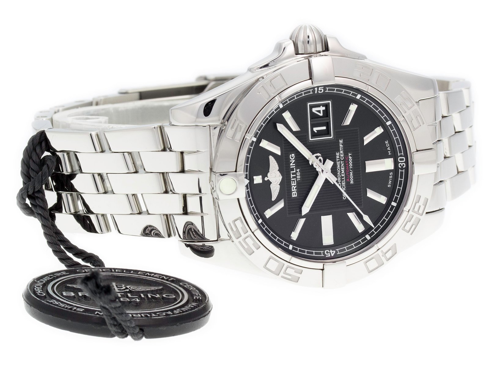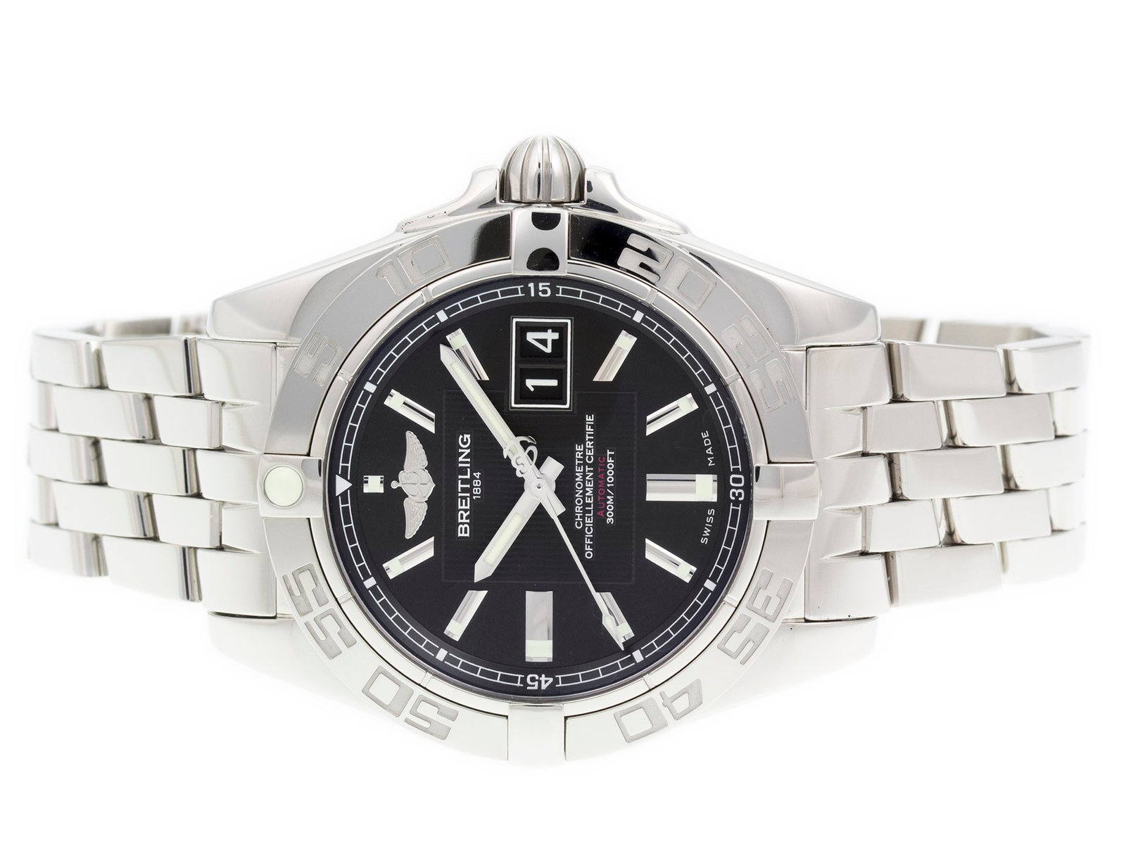 Stainless steel Breitling Galactic 41 A49350L2/BA07 watch, water resistance to 300m, with grand date at 3, chronometer, luminescent steel hands and quartz movement.