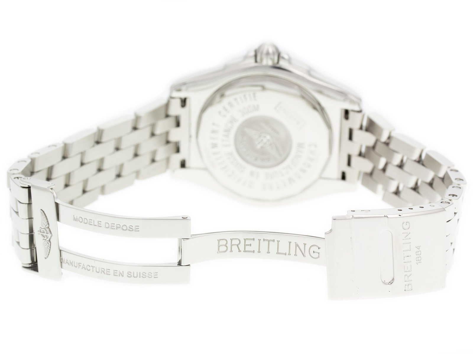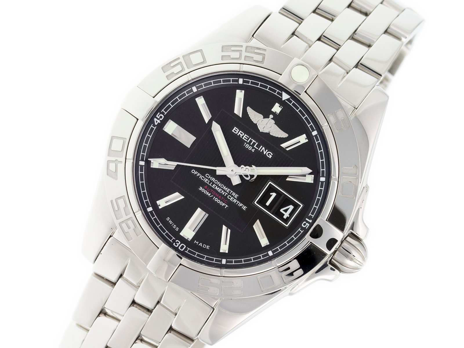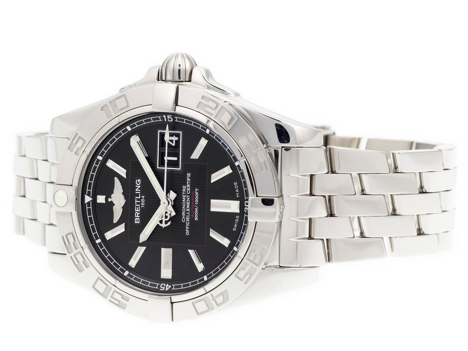 Stainless steel Breitling Galactic 41 A49350L2/BA07 watch, water resistance to 300m, with grand date at 3, chronometer, luminescent steel hands and quartz movement.