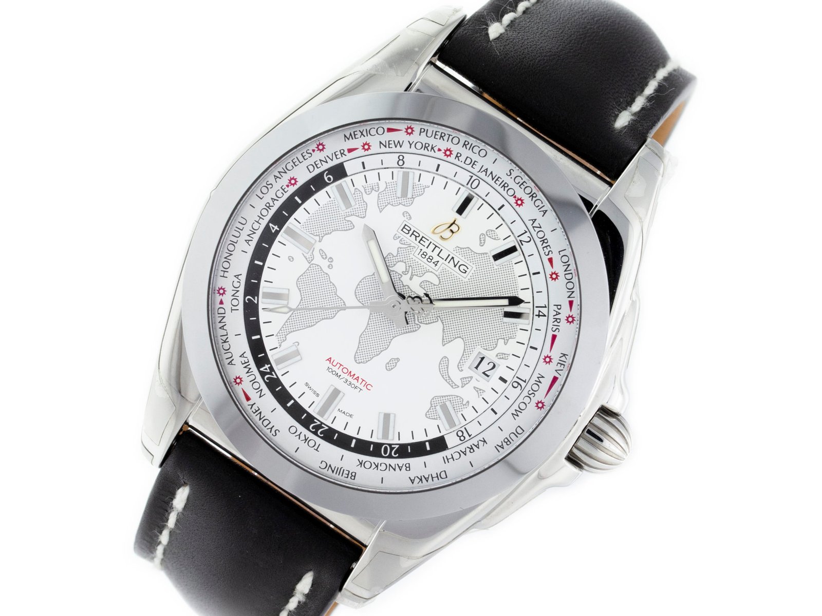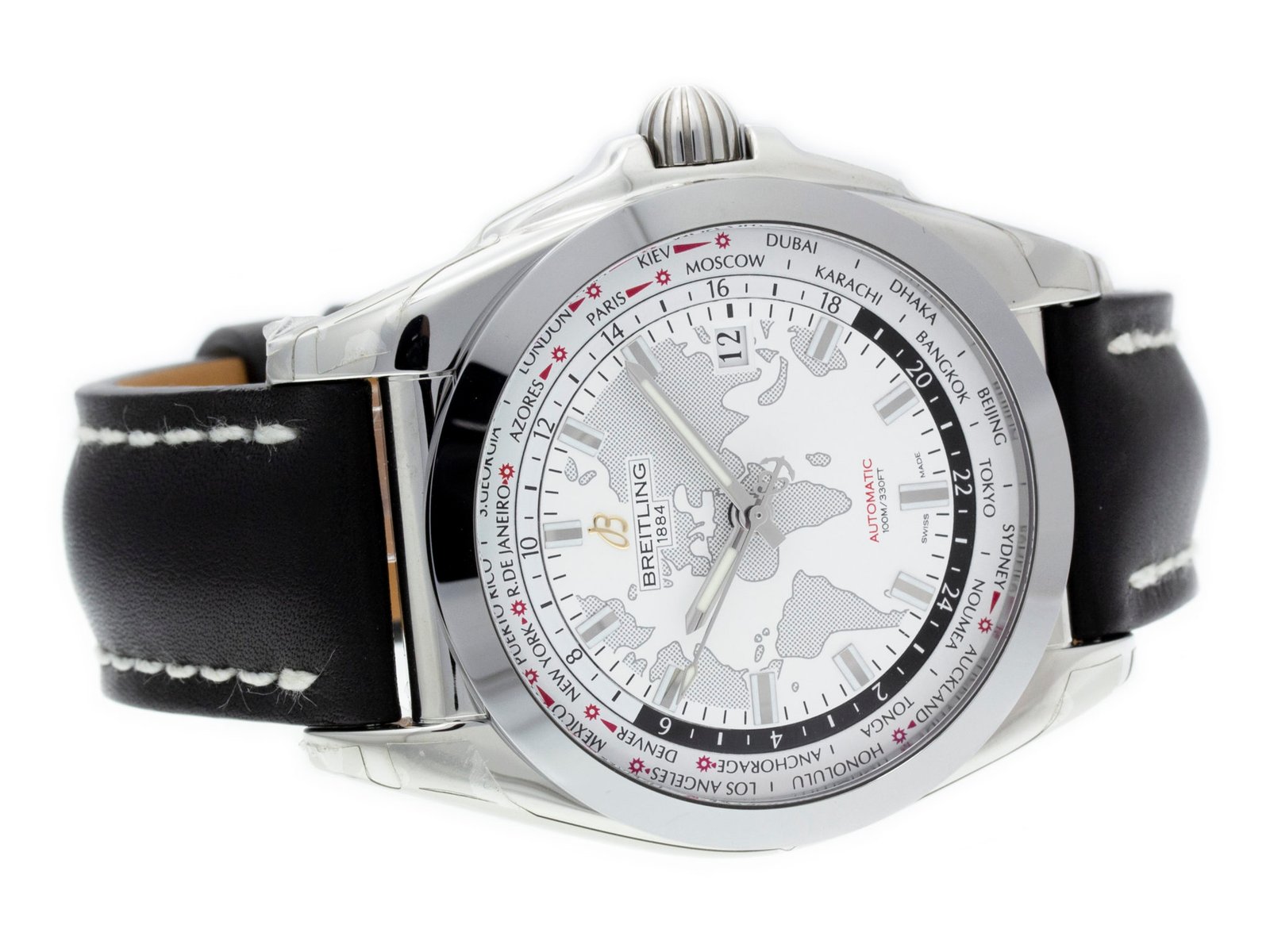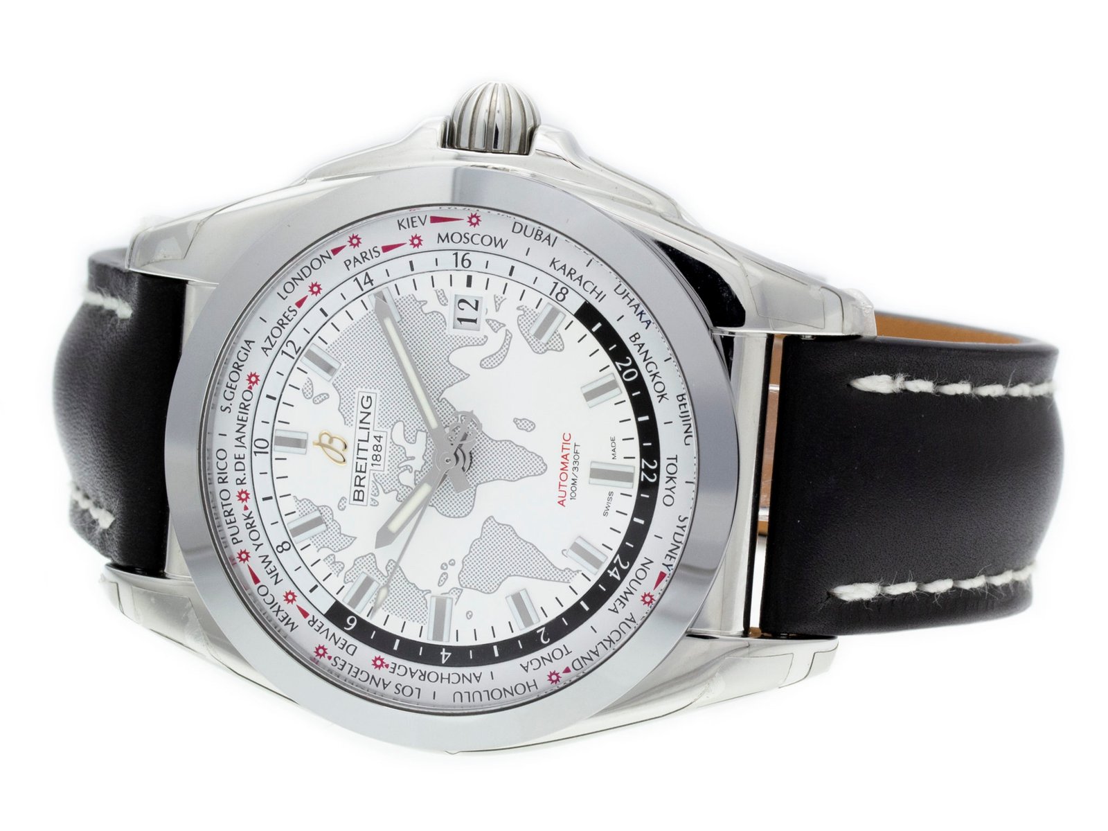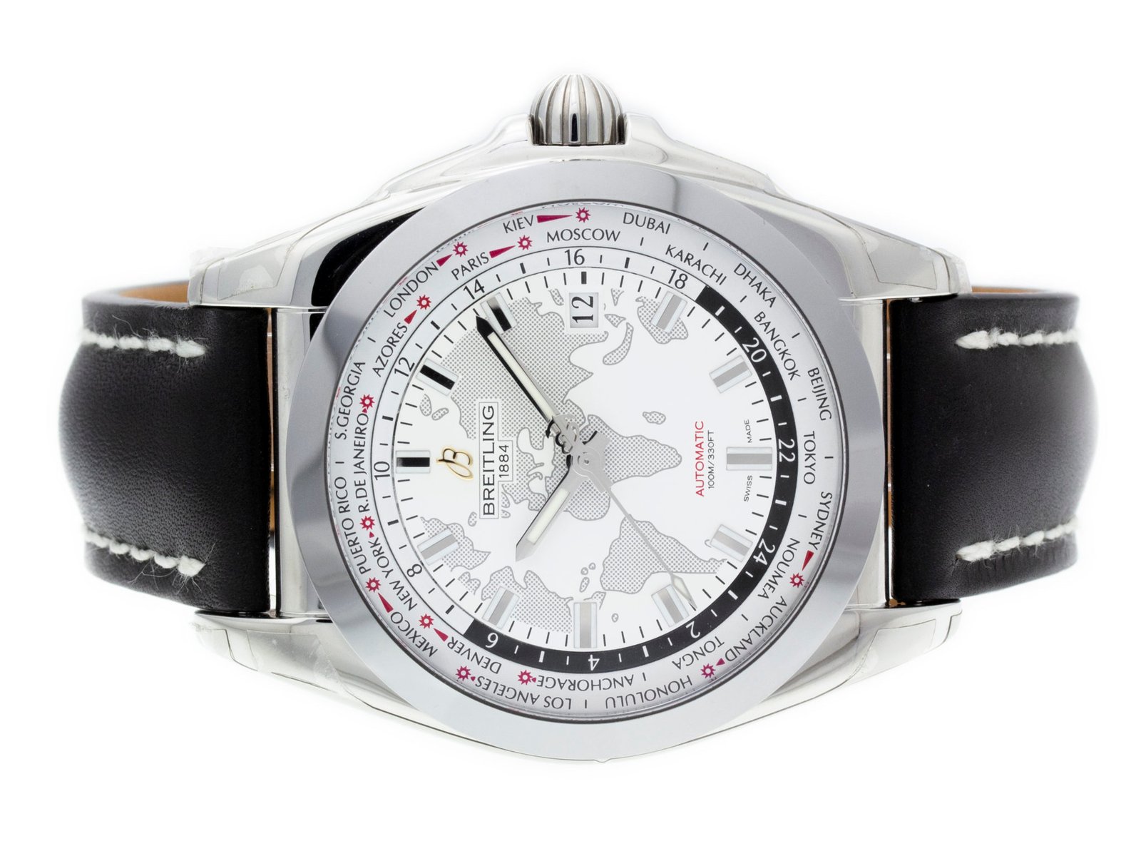 Stainless steel Breitling Galactic Unitime automatic watch with a 44mm case, white dial, and black calf leather strap with tang buckle. Features include hours, minutes, seconds, date, and GMT. Comes with a Deluxe Gift Box and 2 Year Precision Watches Store Warranty.