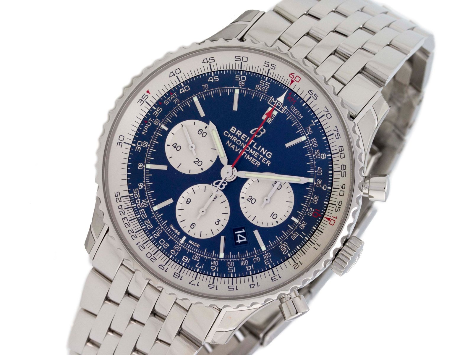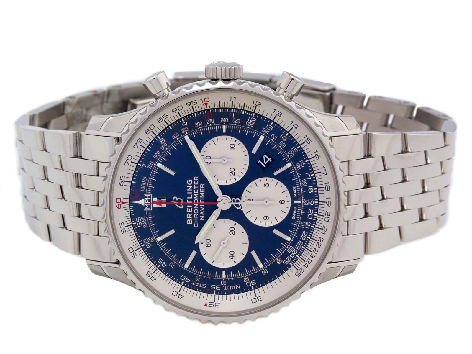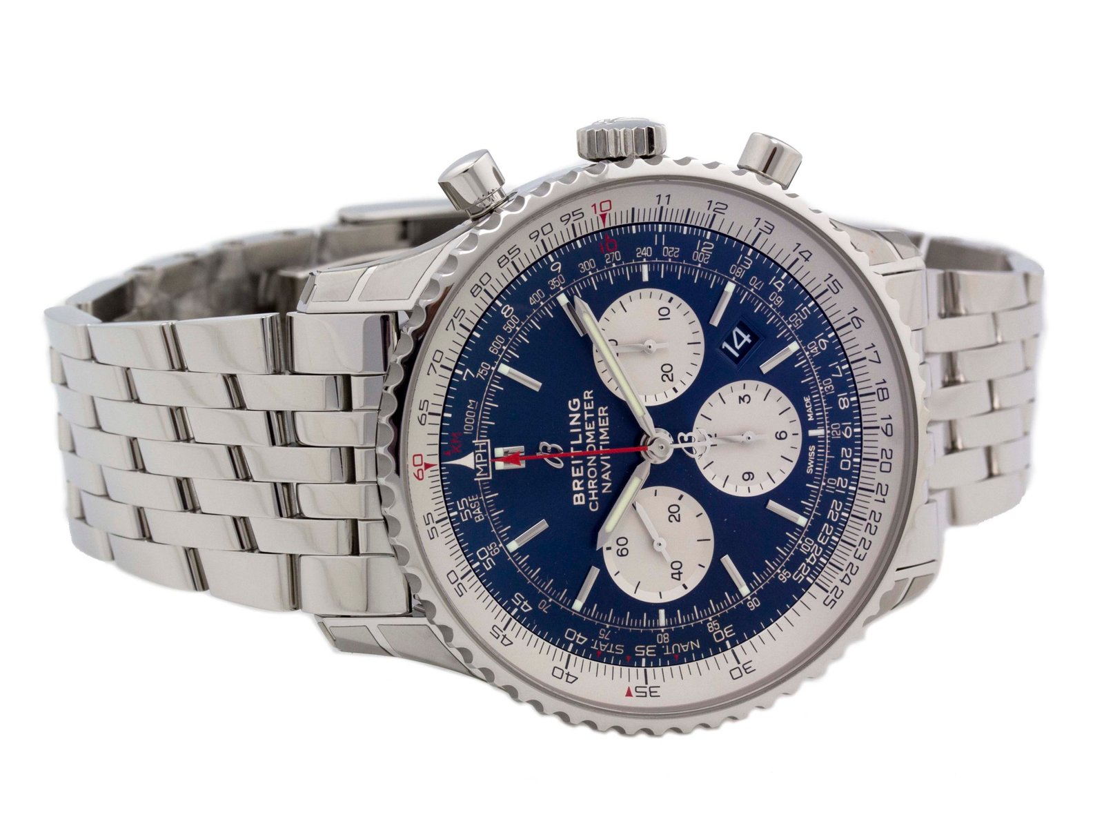Breitling – Navitimer 1 – 46MM – Stainless Steel – Bi-directional Rotating Bezel – Blue Stick w/Three Silver Subdials Dial – Stainless Steel Bracelet – Vendor Style #: AB0127211/C1A1
