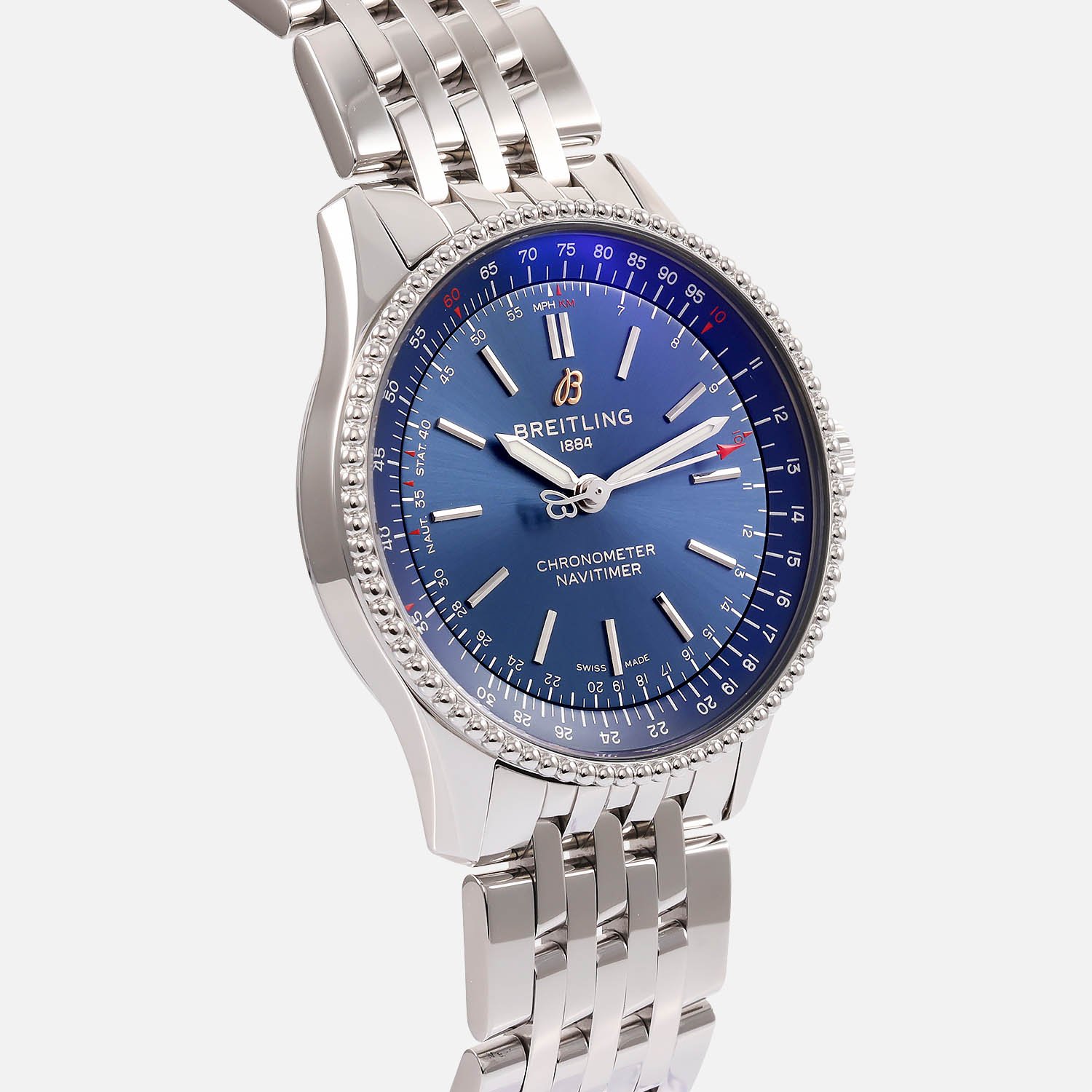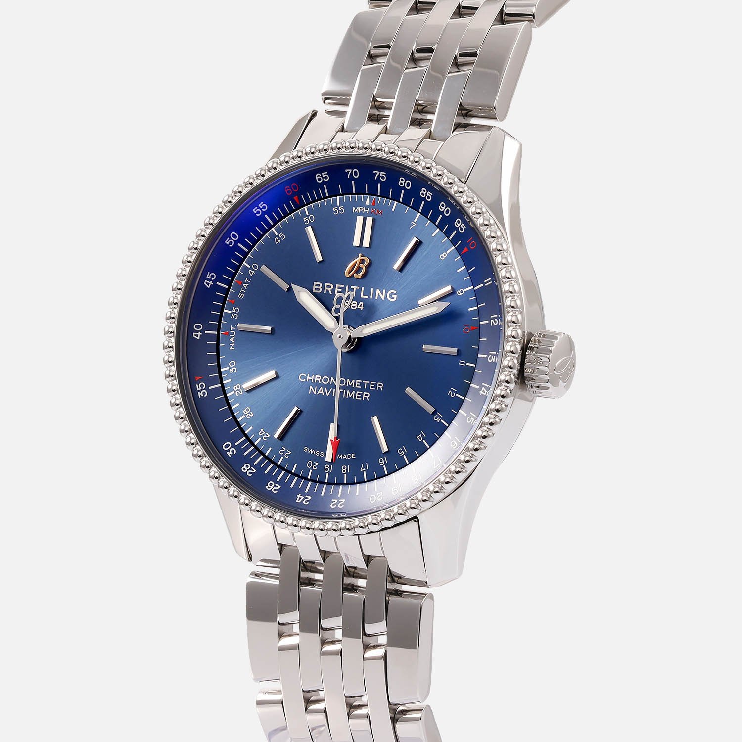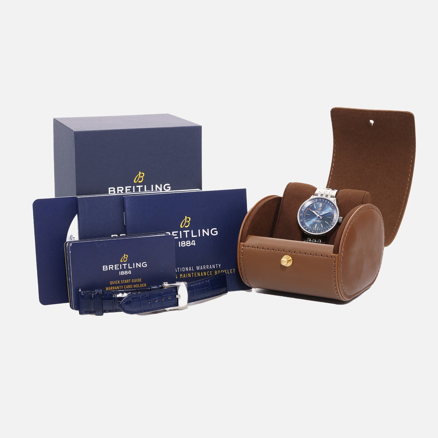 This exquisite timepiece comes with a stainless steel bracelet and an additional blue leather strap, offering versatility in style. Accompanied by the original Breitling box, warranty card, quick start guide, maintenance booklet, slide rule instructions manual, and slide rule tool, it’s a comprehensive package for the discerning watch enthusiast.