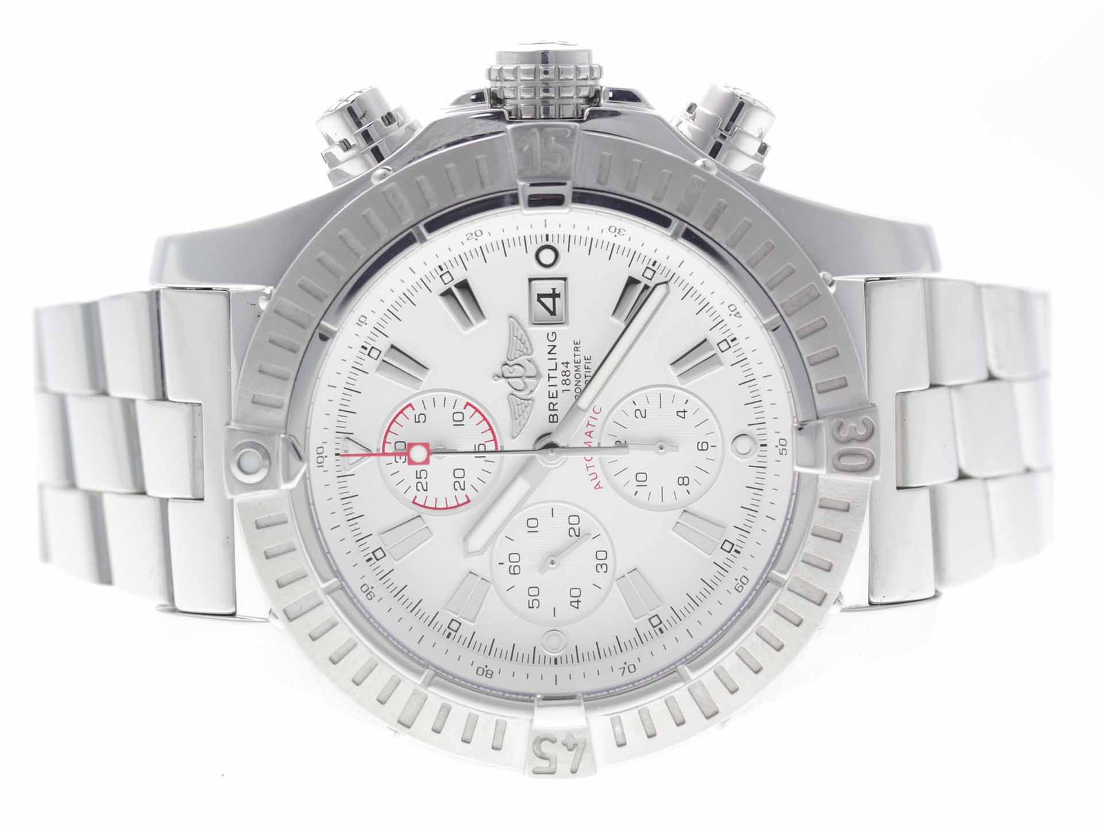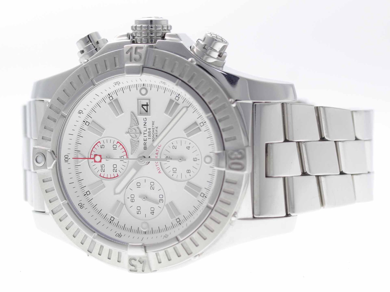 Breitling – Super Avenger – 48.4MM – Stainless Steel – Uni-Directional Rotating Stainless Steel Bezel – White Stick w/ Three White Subdials. Date On 3 Dial – Stainless Steel Bracelet – No/No