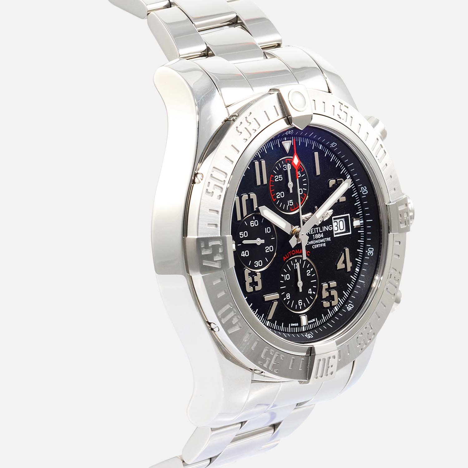 Discover the powerful and rugged Breitling Super Avenger II A1337111/BC28, a timepiece designed for the modern adventurer. The 48mm stainless steel case with unidirectional rotating bezel exudes durability, while the black dial with Arabic markers and 3 black subdials provides a touch of elegance.