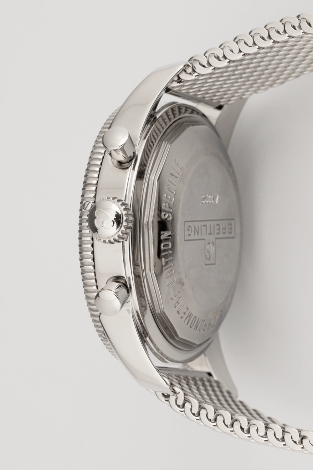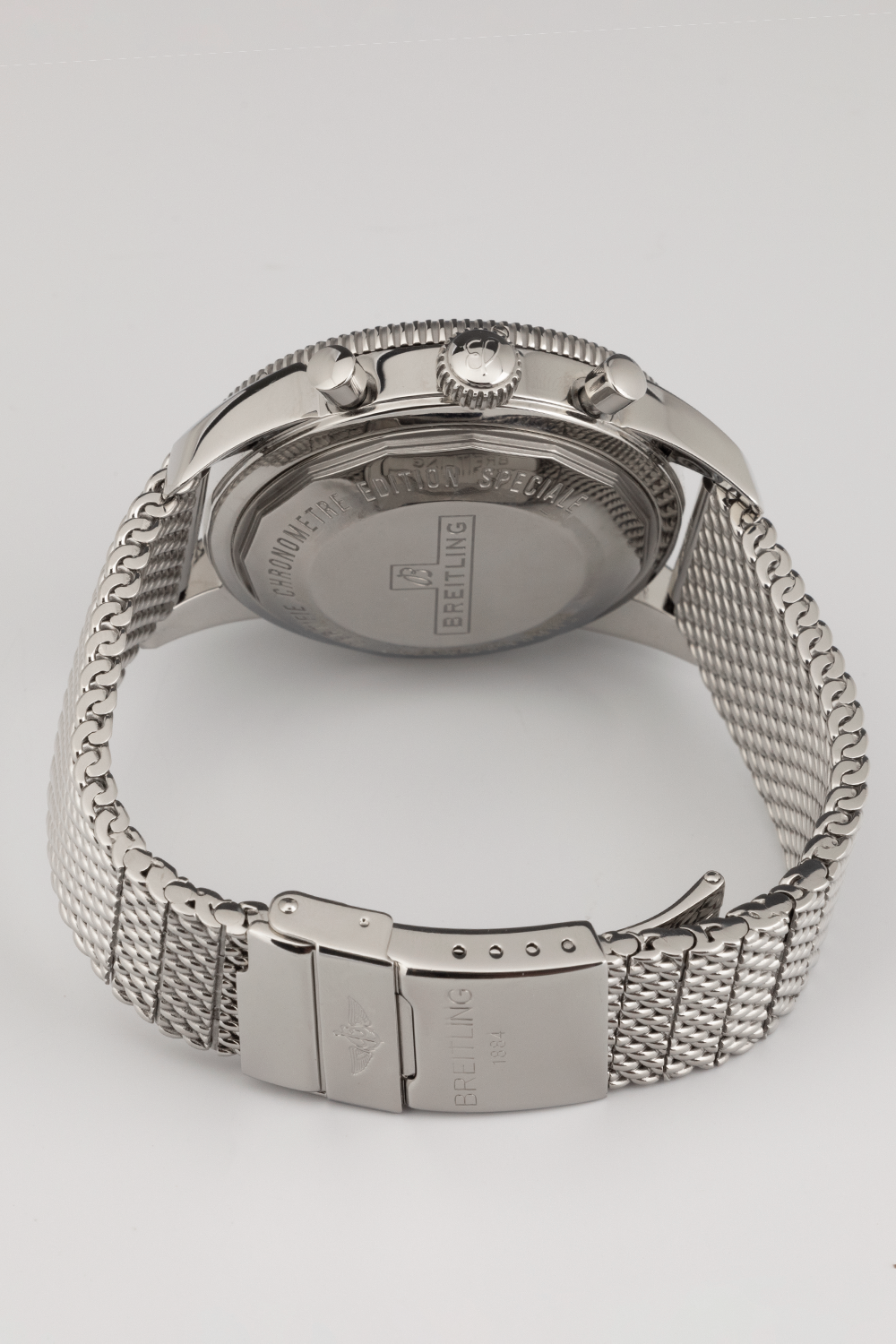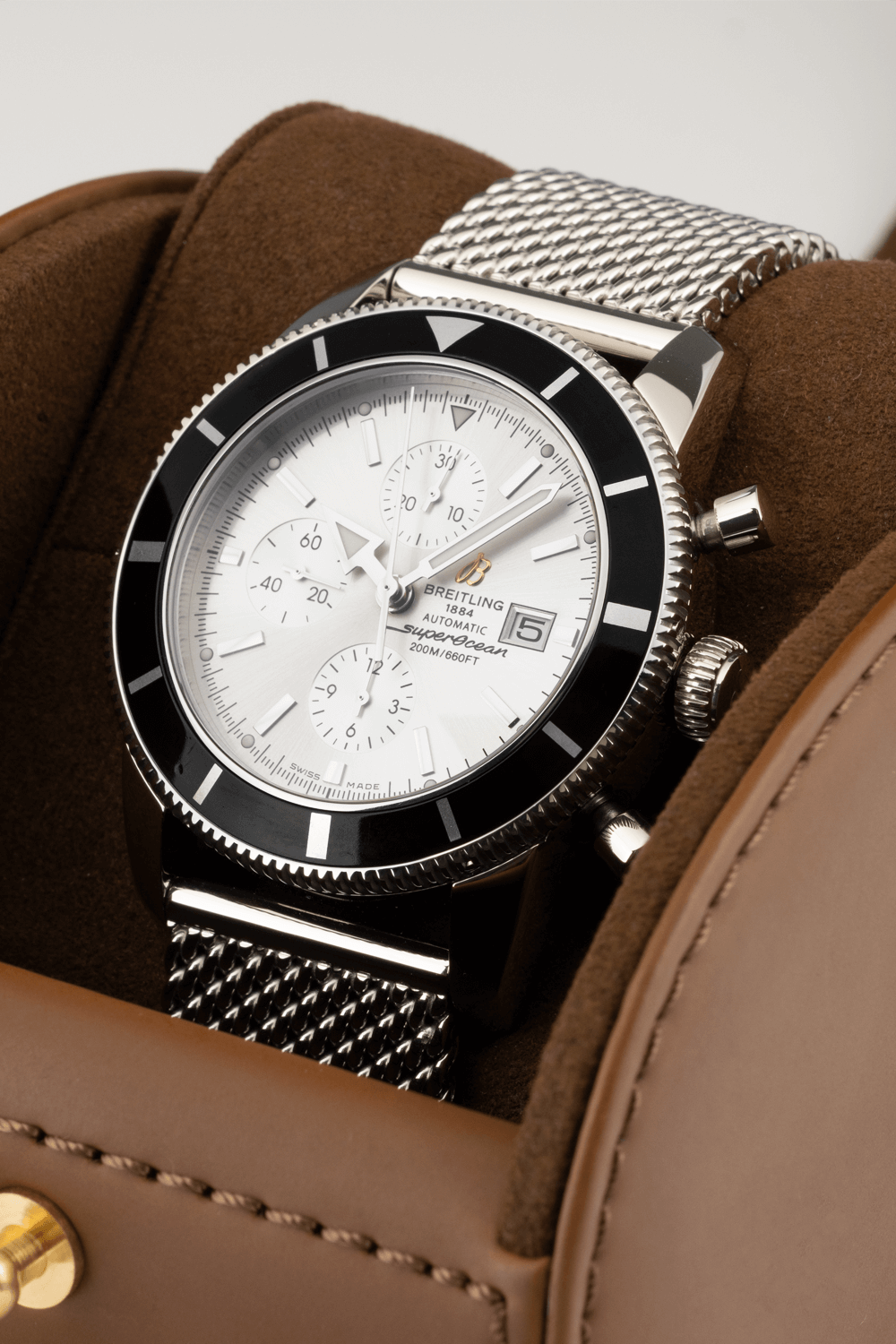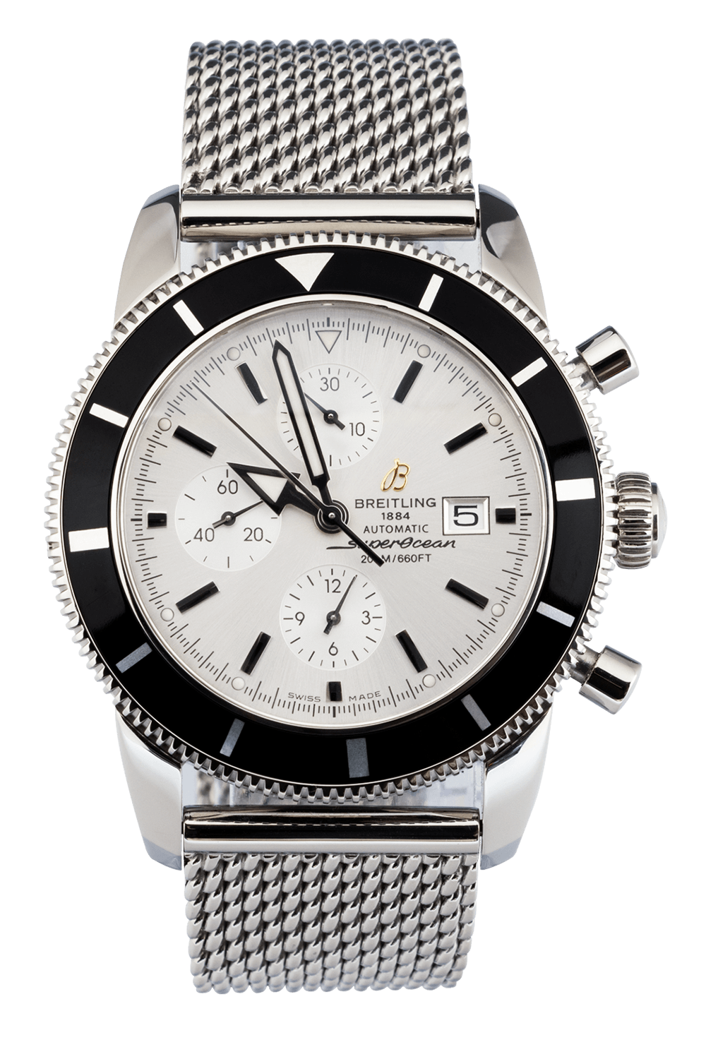 The Pre-Owned Breitling Superocean Heritage Chronograph (A1332024/G698SS) is a self-winding automatic watch inside of a 46MM stainless steel case on a Stainless Steel Ocean Classic Mesh Bracelet – 144A – with a fold over claps. It features a silver dial with 3 subdials and index hour markers. The watch has been fully serviced and comes a Breitling box and factory Attestation de Chrono certificate along with a 2-year Precision Watches Warranty.