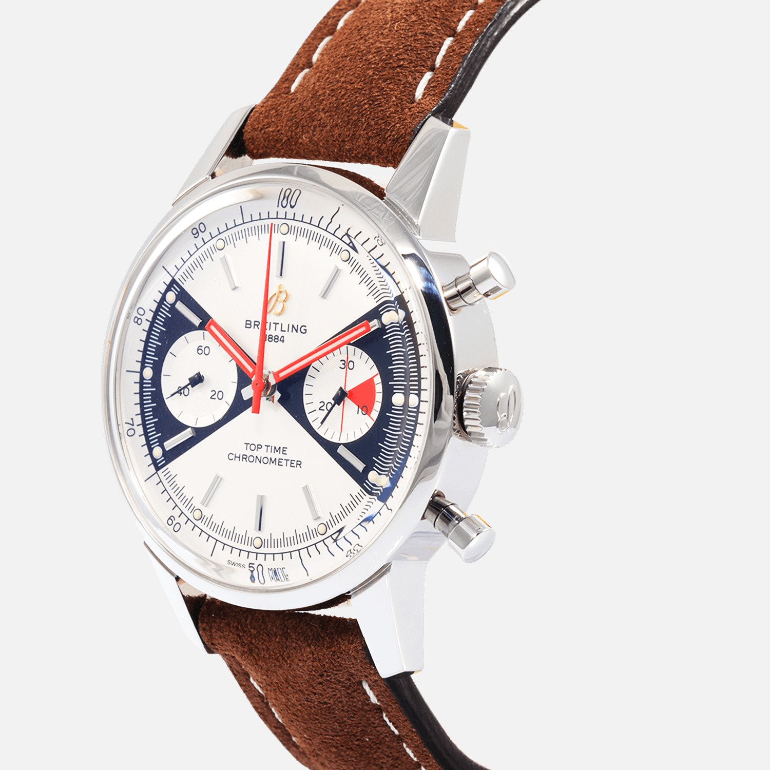 The Breitling Top Time Limited Edition A23310121G1X1 is a stunning timepiece with a unique and eye-catching design. It features a 41mm stainless steel case and a stylish leather strap secured with a tang buckle. The white and blue dial with white subdials, index markers, and fixed bezel add sophistication to its modern look.