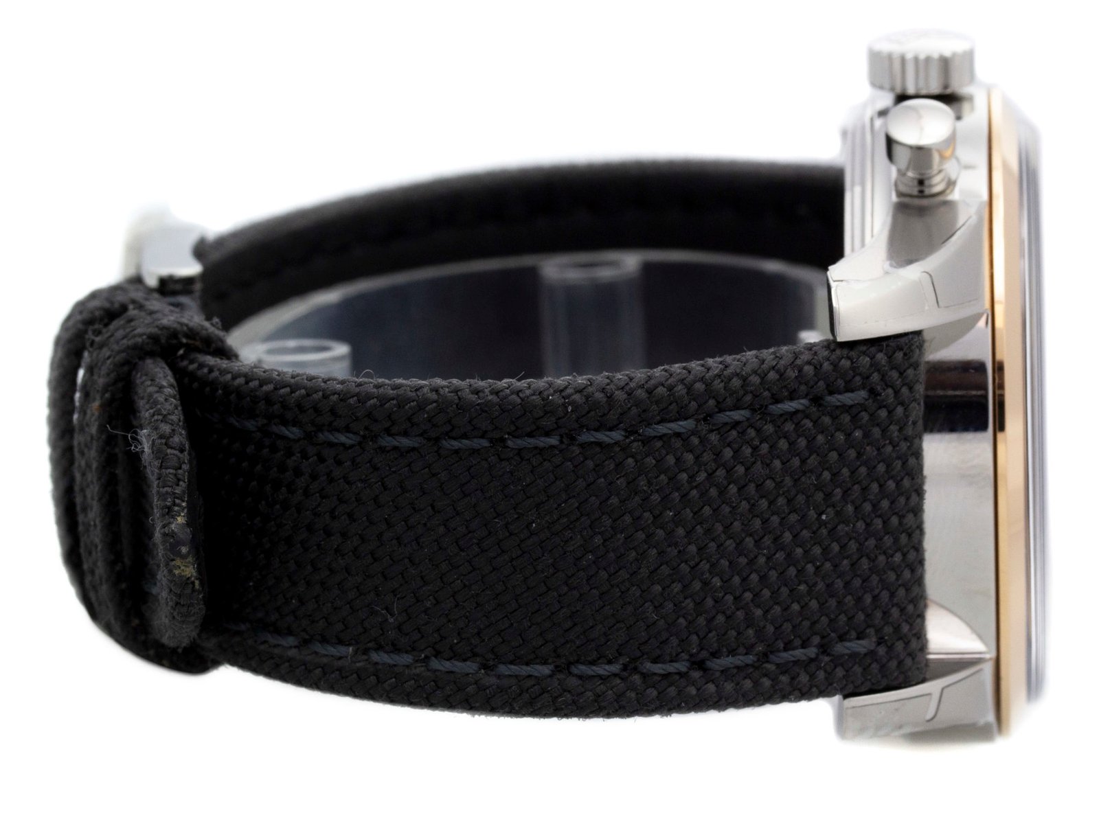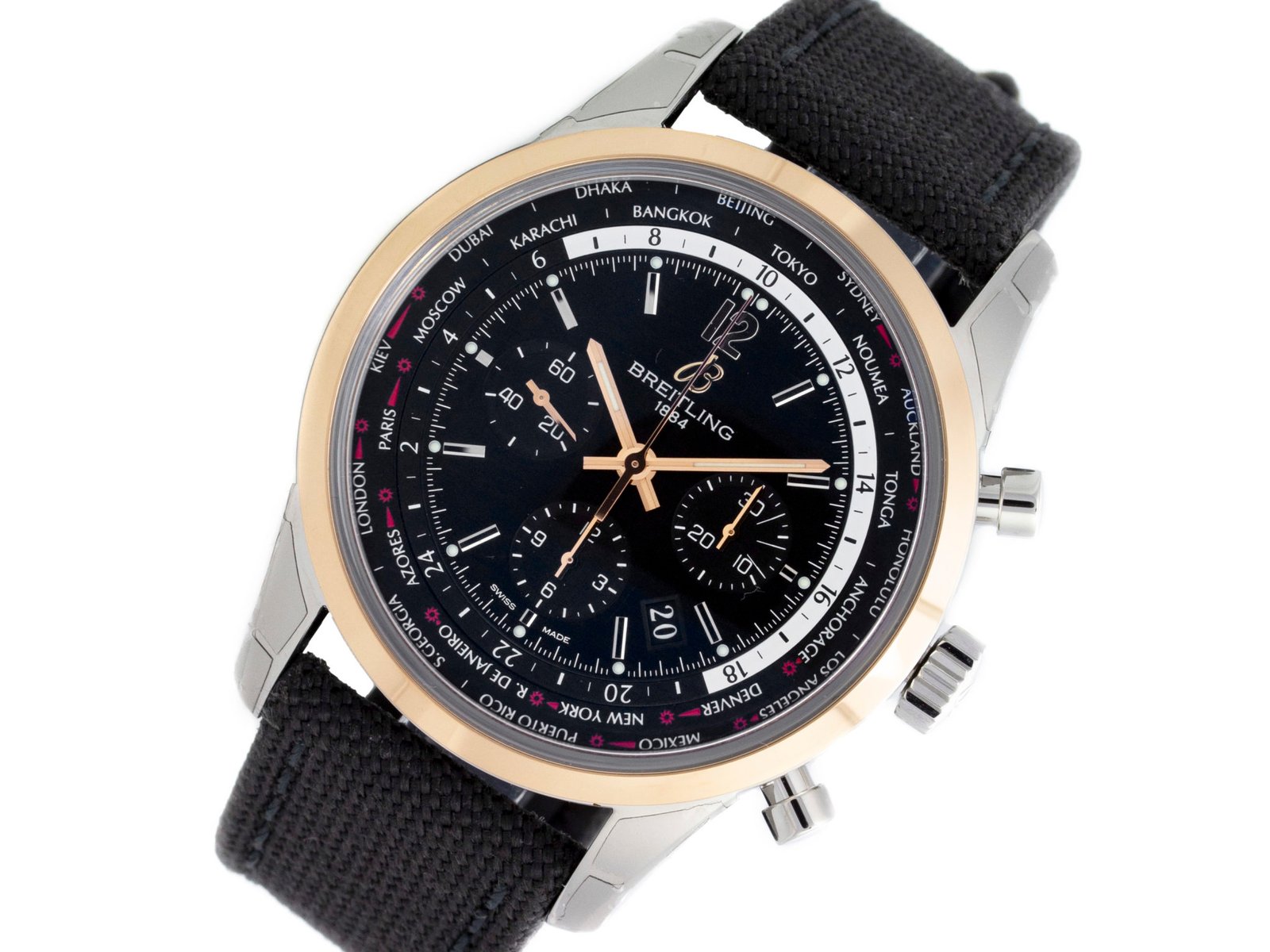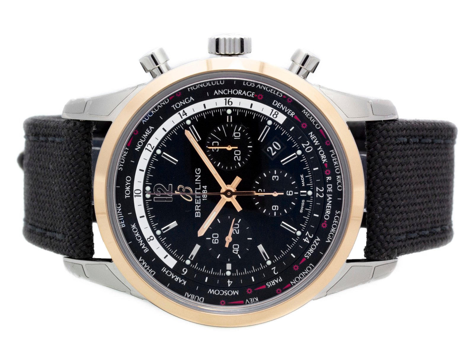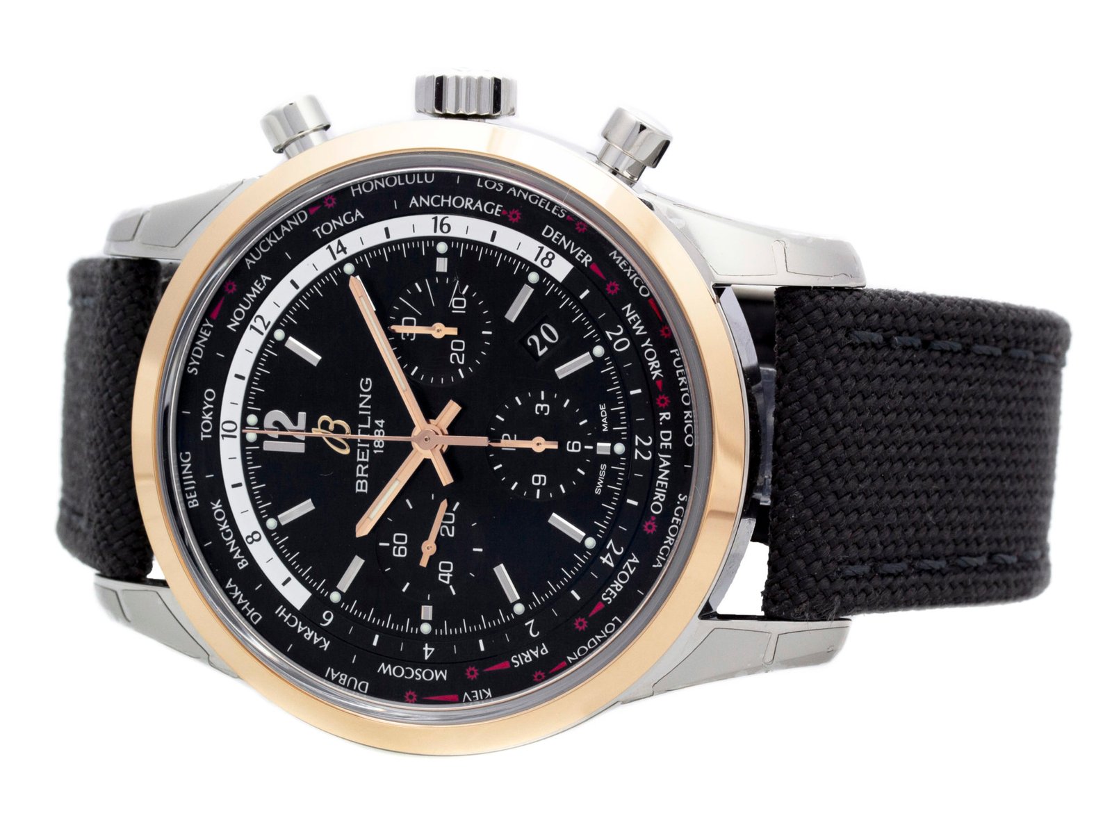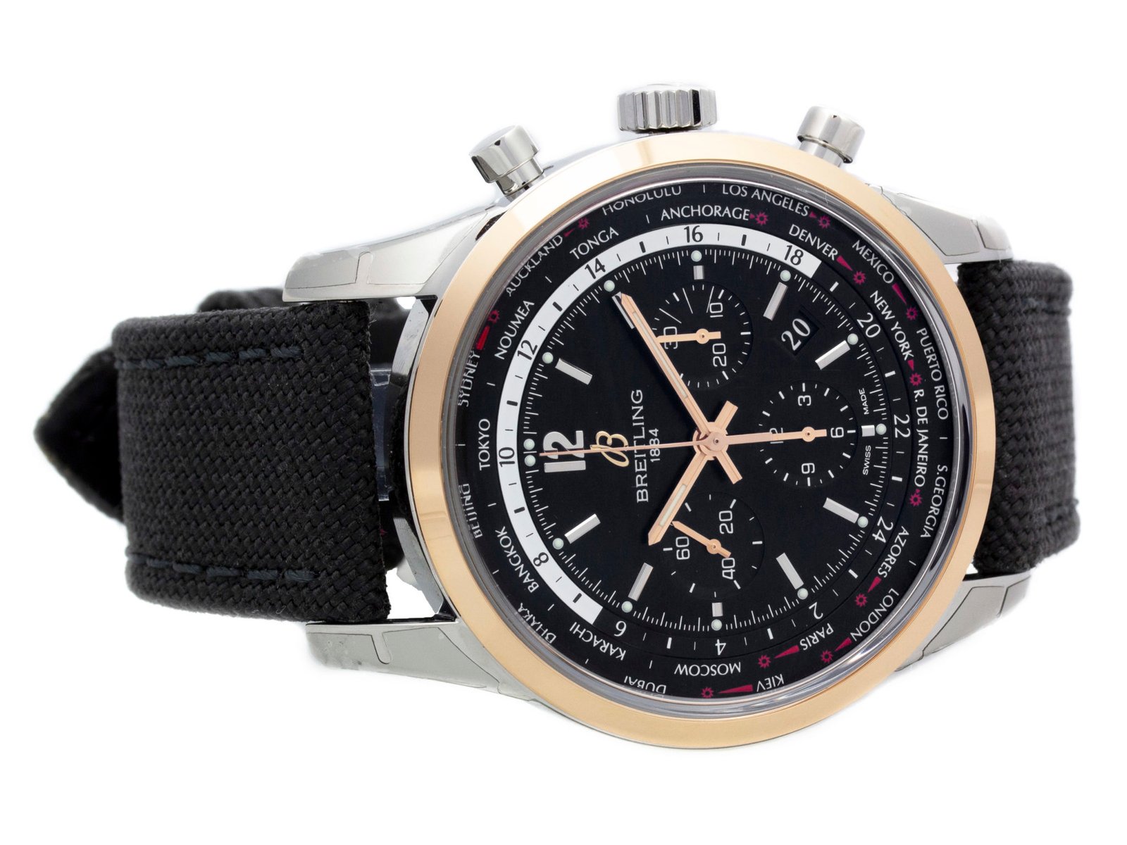 Steel & 18k red gold Breitling Transocean Unitime Pilot automatic watch with a 46mm case, black dial, and military strap with tang buckle. Features include hours, minutes, seconds, date, and chronograph. Comes with a Deluxe Gift Box and 2 Year Precision Watches Store Warranty.​