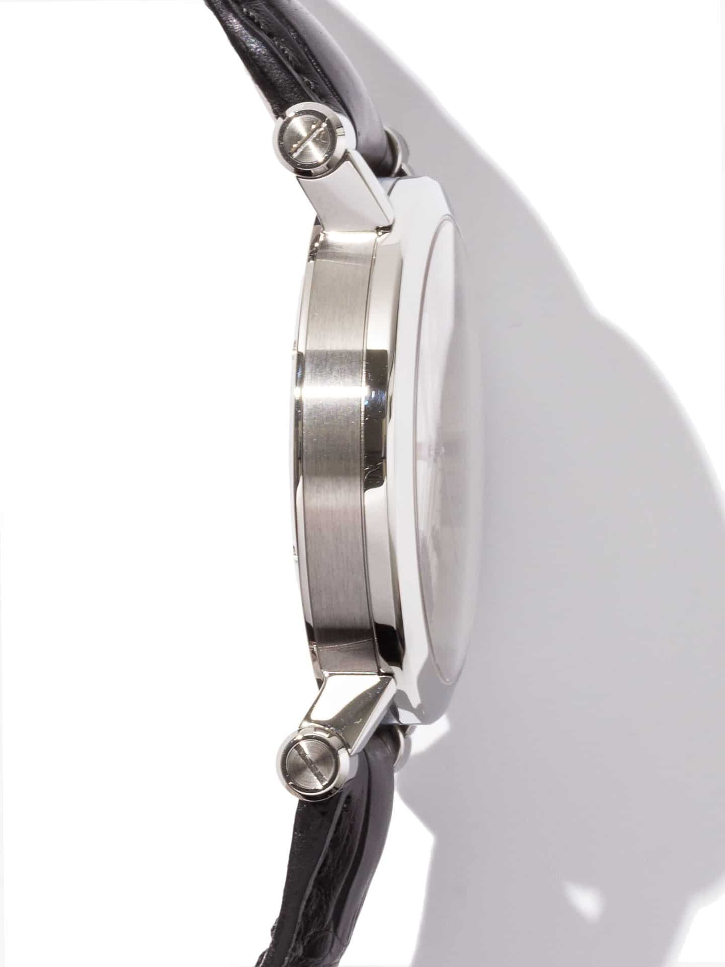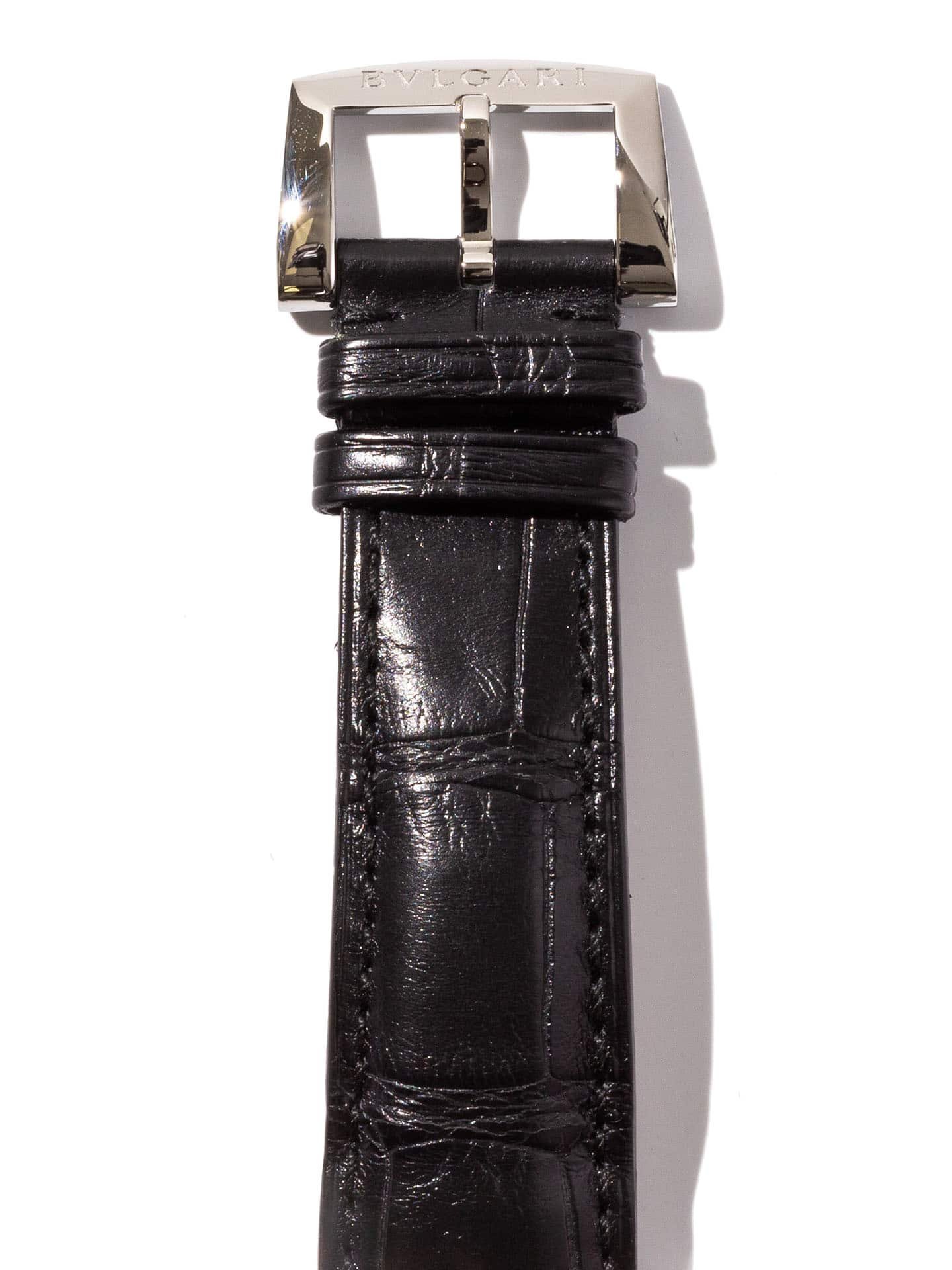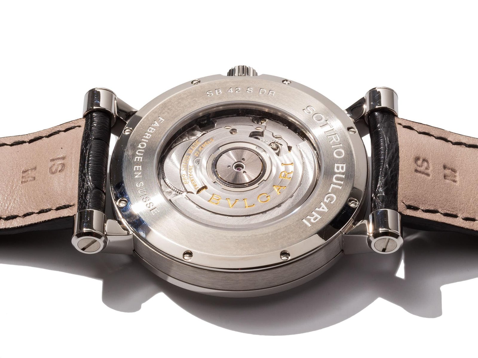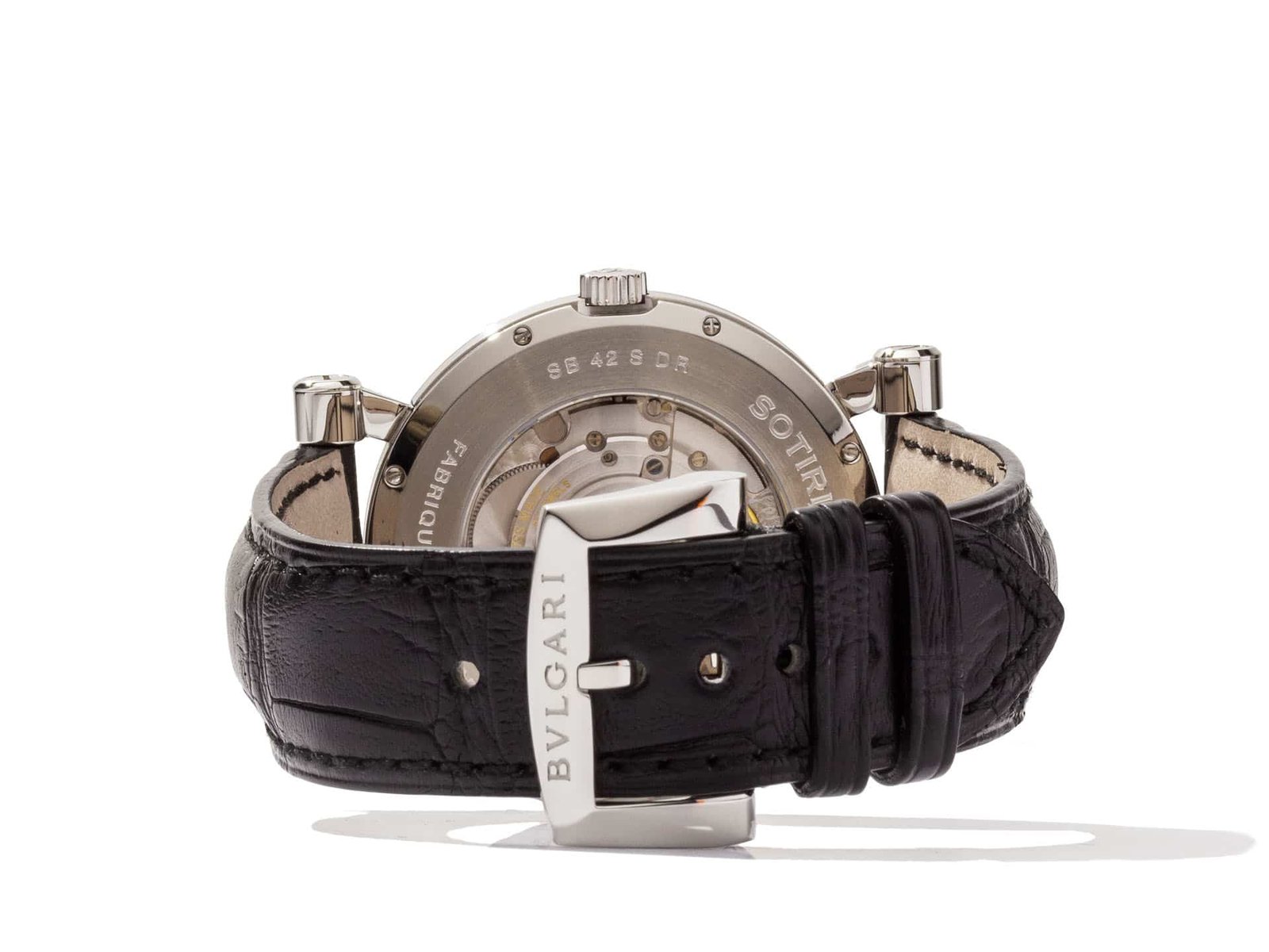 The Pre-Owned Bvlgari Sotirio Retrograde (SB42WSLDR) is a self-winding automatic watch inside of a 42MM stainless steel case and black leather strap with a tang buckle. It features a silver dial with index hour markers. The watch has been fully serviced and comes in a Precision Watches display box and a 2-year Precision Watches Warranty.