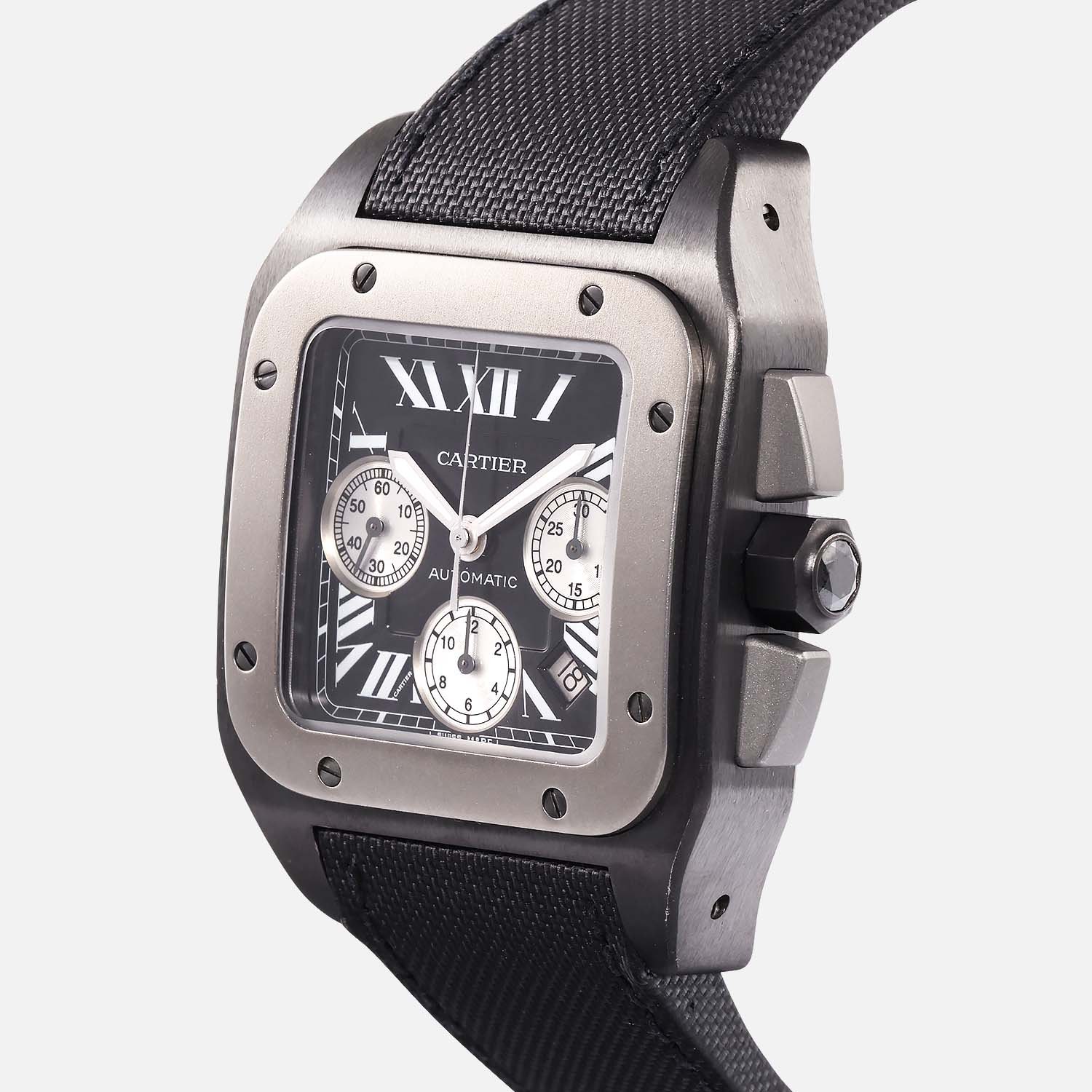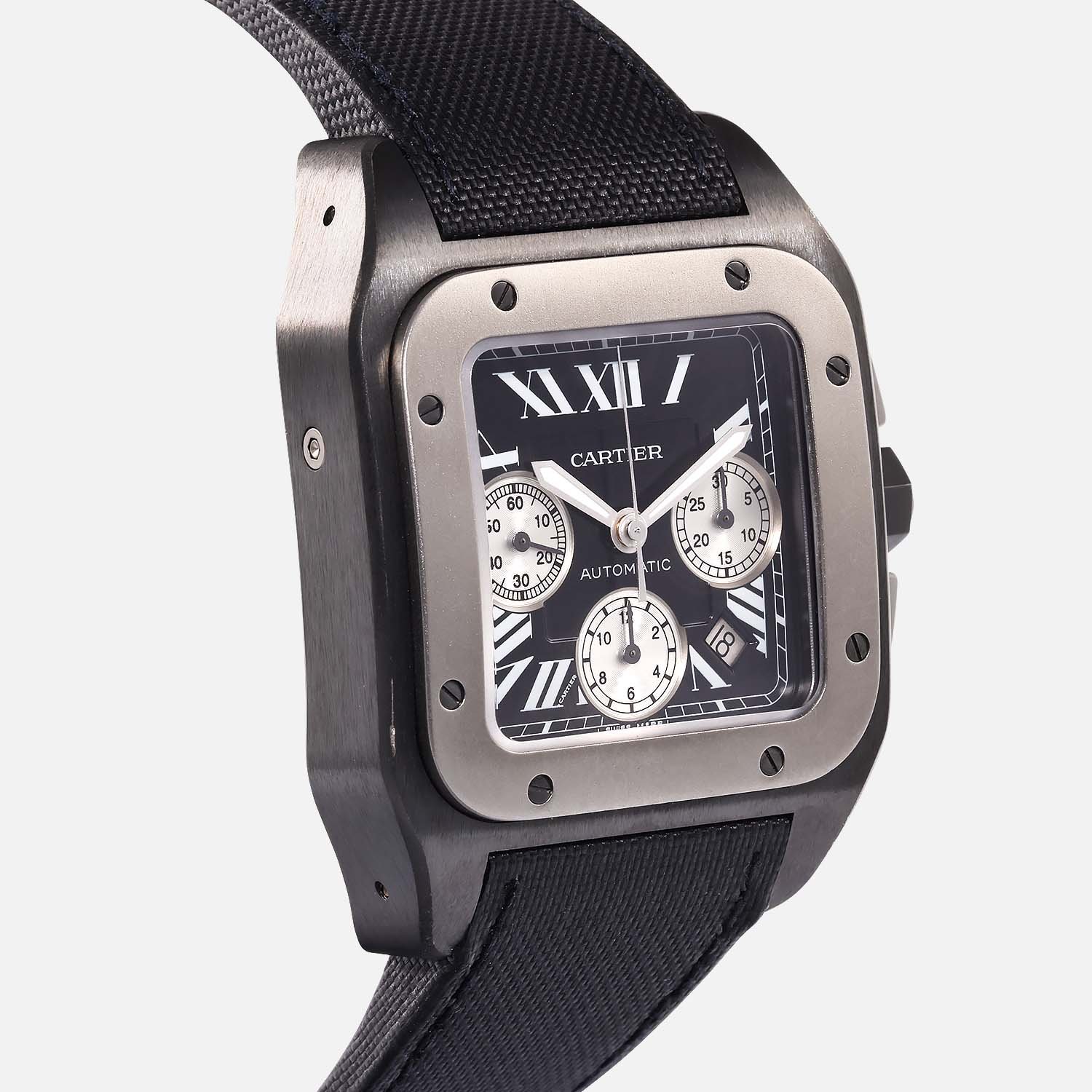 Explore the timeless elegance of the pre-owned Cartier Santos 100 XL W2020005. Crafted with titanium, featuring a black dial with Roman numerals, and powered by Cartier’s Caliber 8630 automatic movement. Experience luxury with exceptional performance.