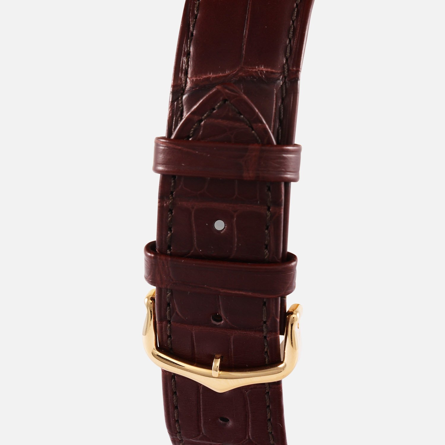 The Cartier Tank Americaine comes with a luxurious brown leather strap, offering a perfect blend of comfort and sophistication. The tang clasp ensures a secure and stylish fit.