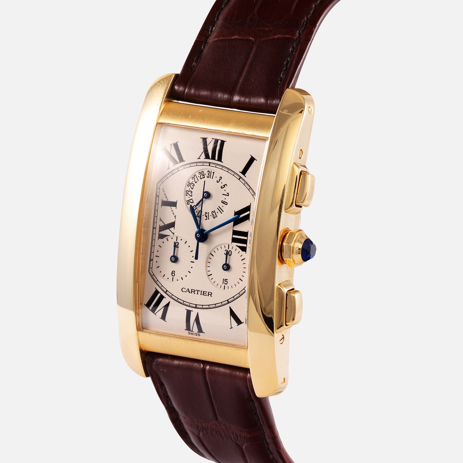 Experience the epitome of sophistication with the Cartier Tank Americaine Chronograph, an exquisite pre-owned timepiece crafted in 18K Yellow Gold. Its distinctive 45mm x 27mm case seamlessly blends artistry and precision.