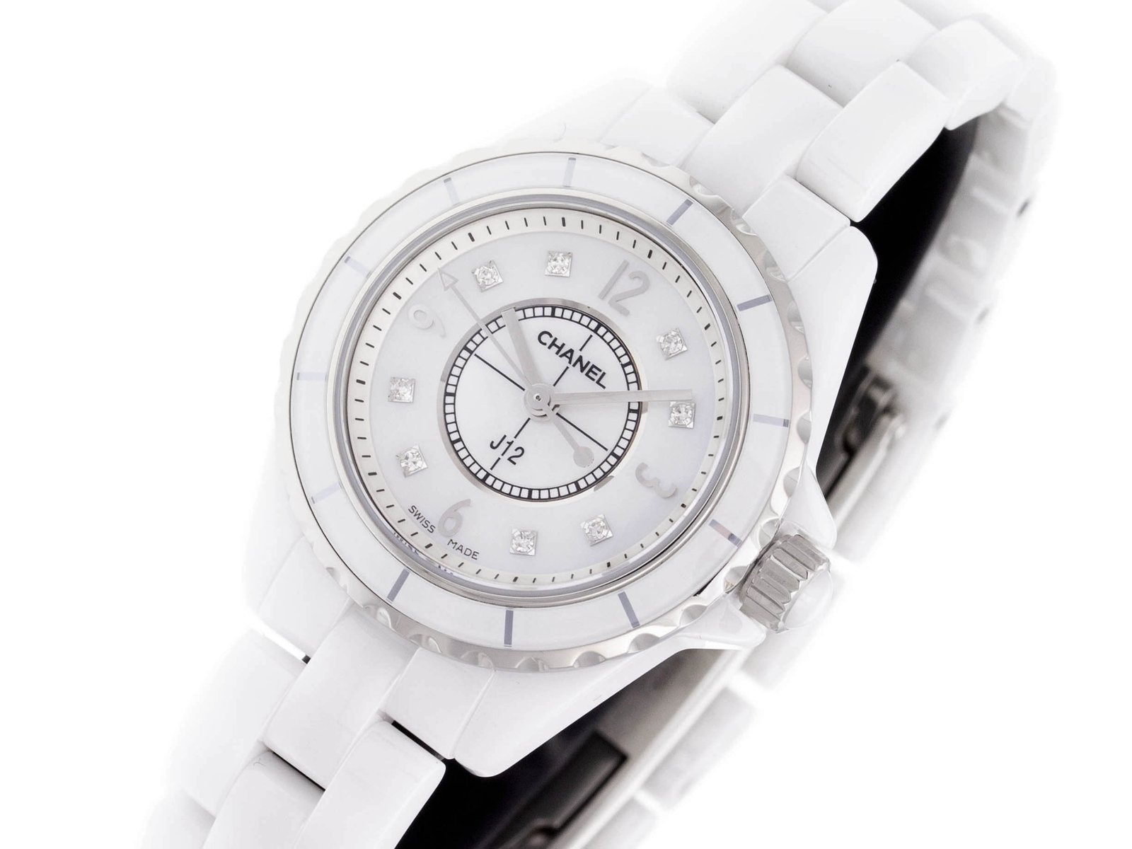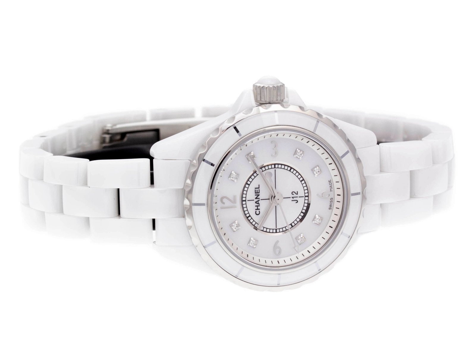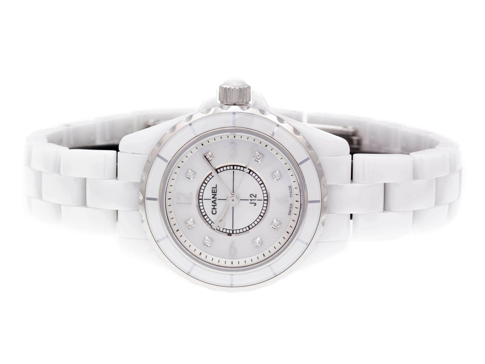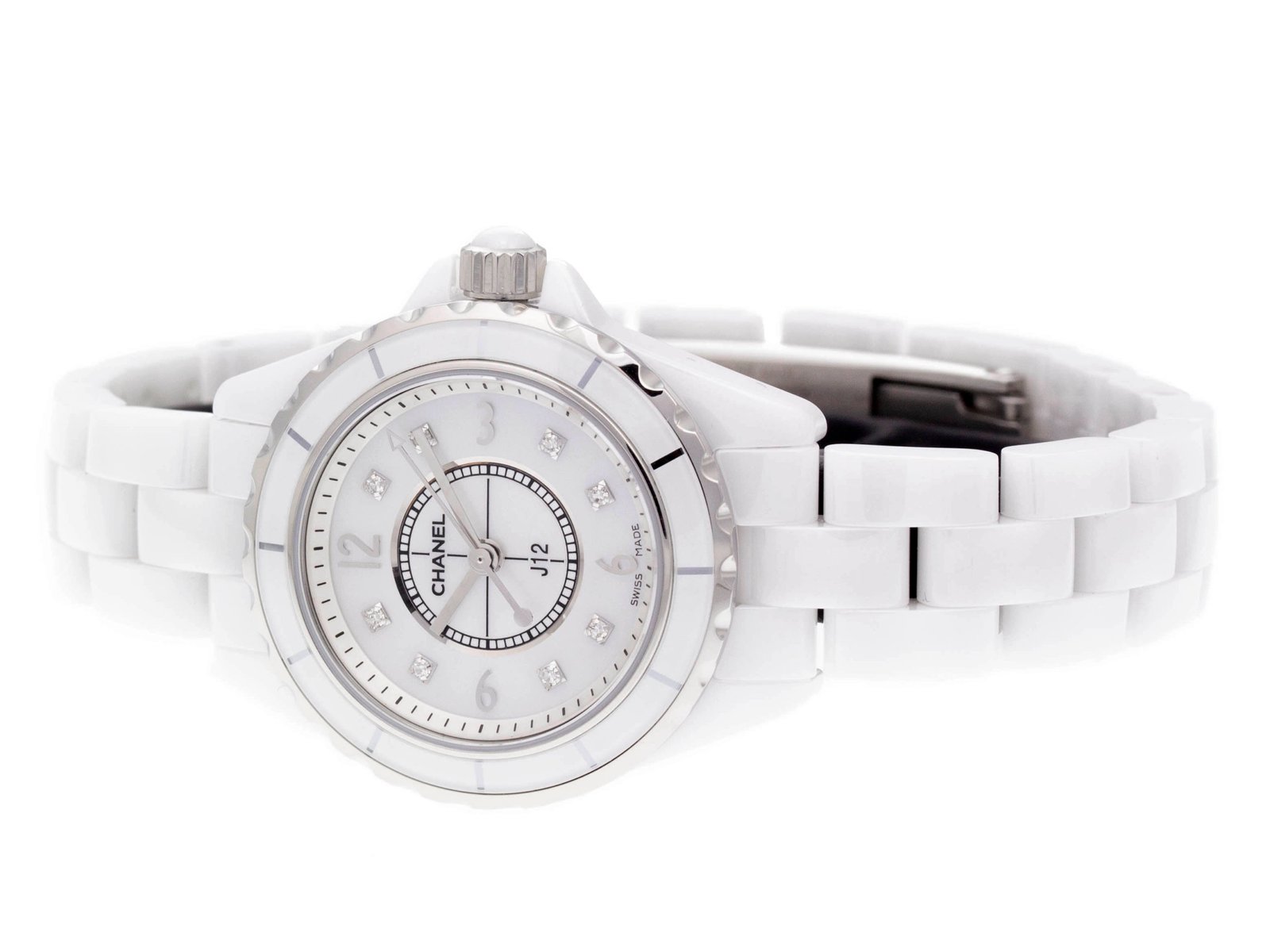 White Ceramic Chanel J12 Quartz Watch with a 29mm Case, White Mother of Pearl Diamond Dial, and Bracelet with Folding Clasp. Features include Hours, Minutes, and Seconds. Comes with a Deluxe Gift Box and 2 Year Precision Watches Store Warranty.​