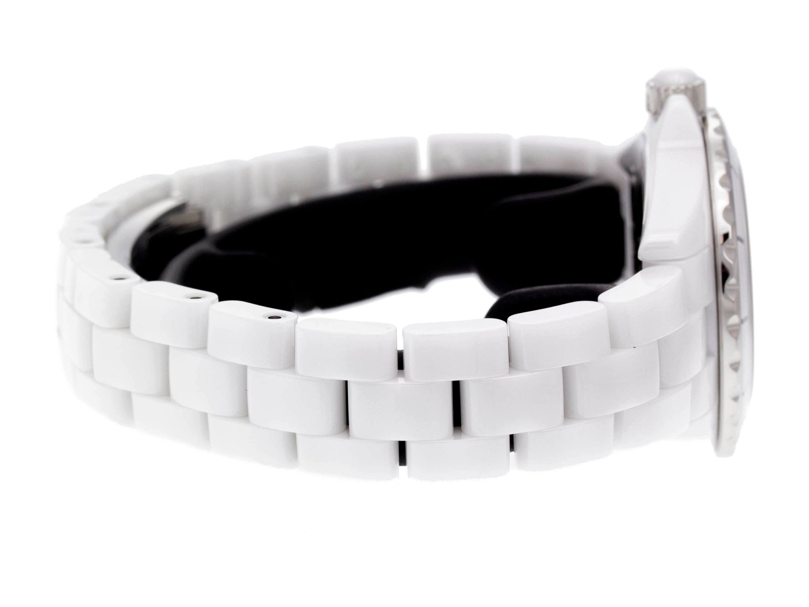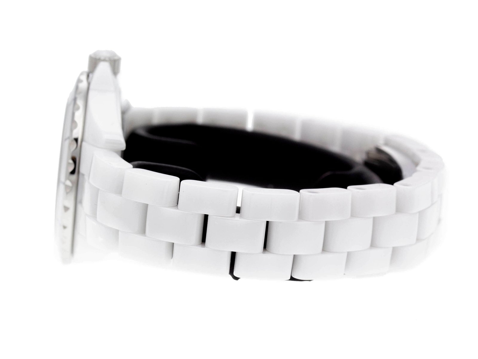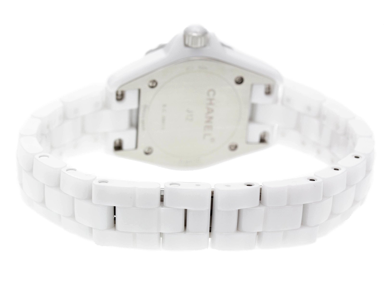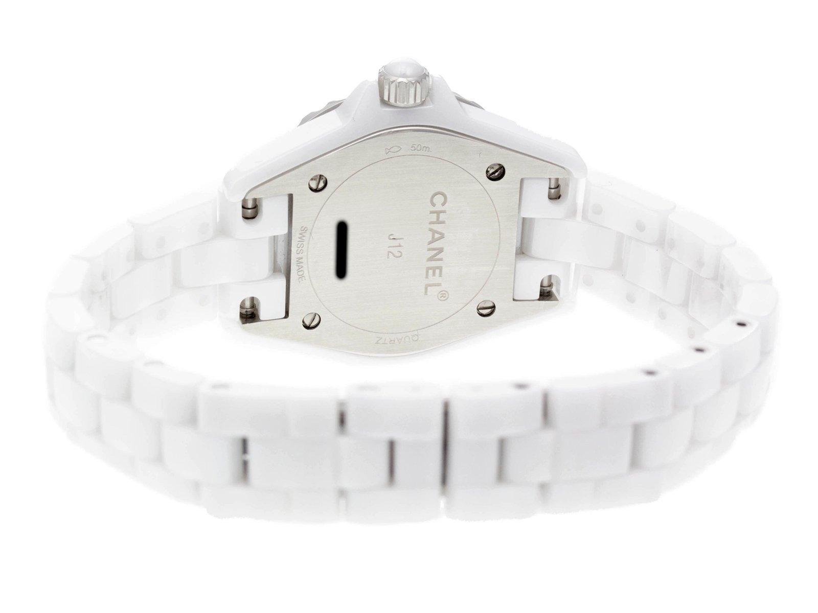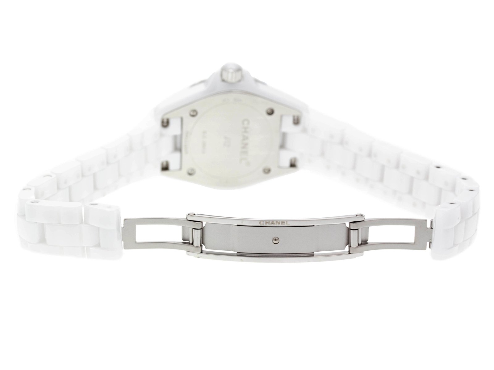 White Ceramic Chanel J12 Quartz Watch with a 29mm Case, White Mother of Pearl Diamond Dial, and Bracelet with Folding Clasp. Features include Hours, Minutes, and Seconds. Comes with a Deluxe Gift Box and 2 Year Precision Watches Store Warranty.​