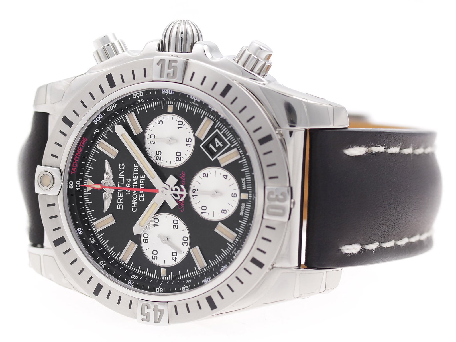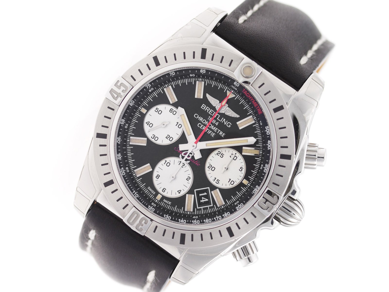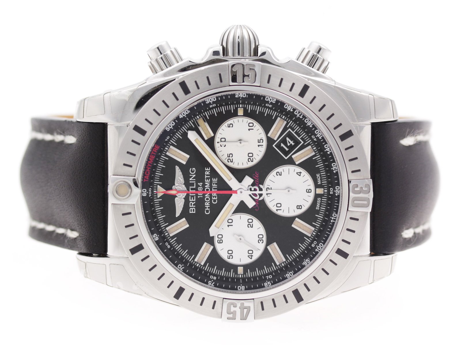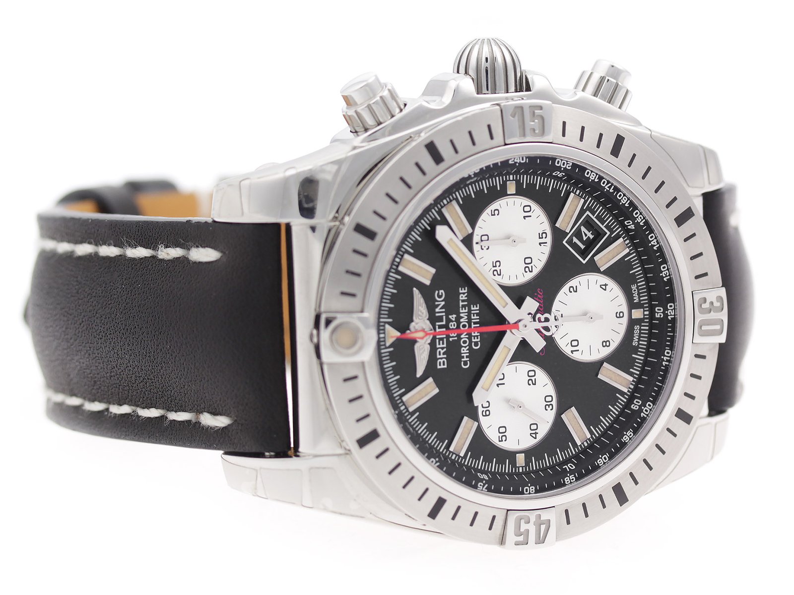 Breitling Chronomat 44 Airborne AB0115 watch w/ black dial and stainless steel case on a black leather strap. Chronograph, date, and tachymeter functions.