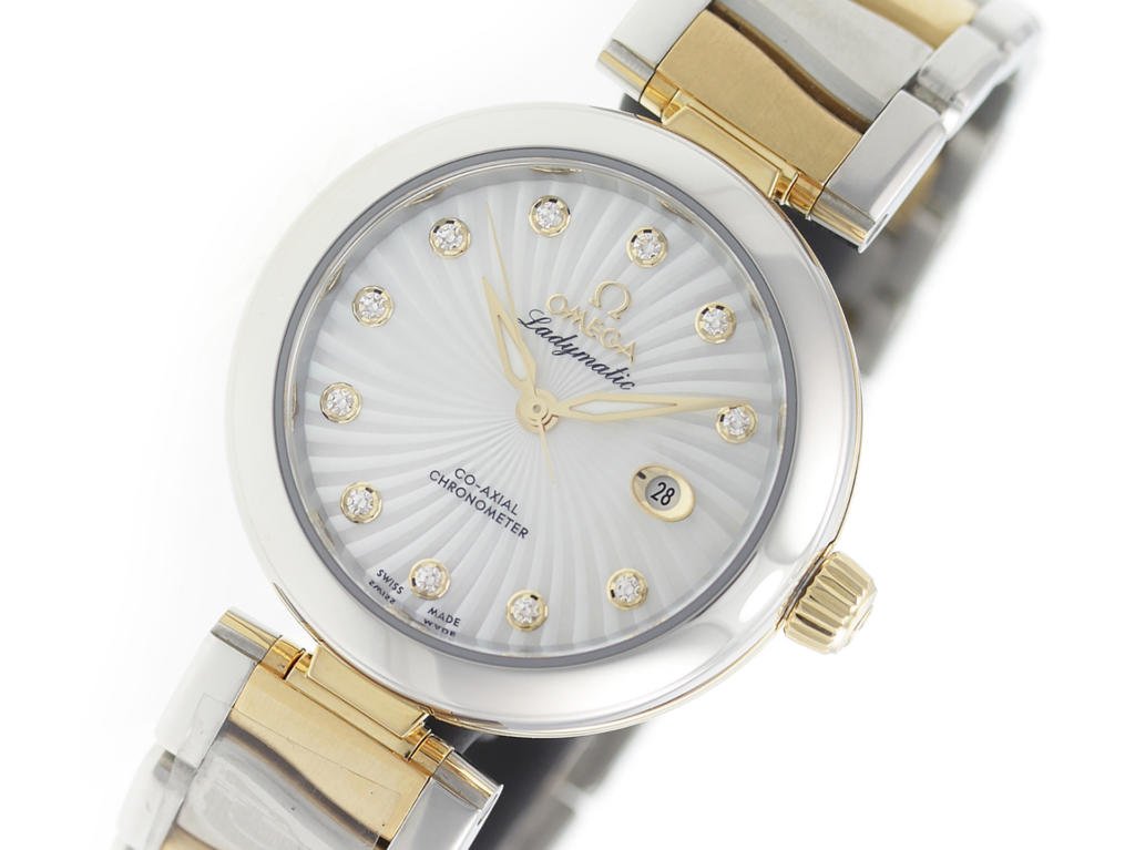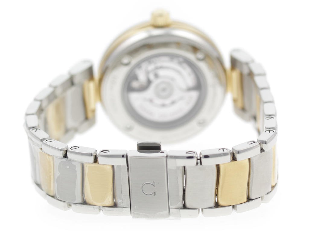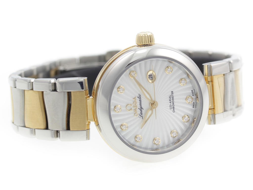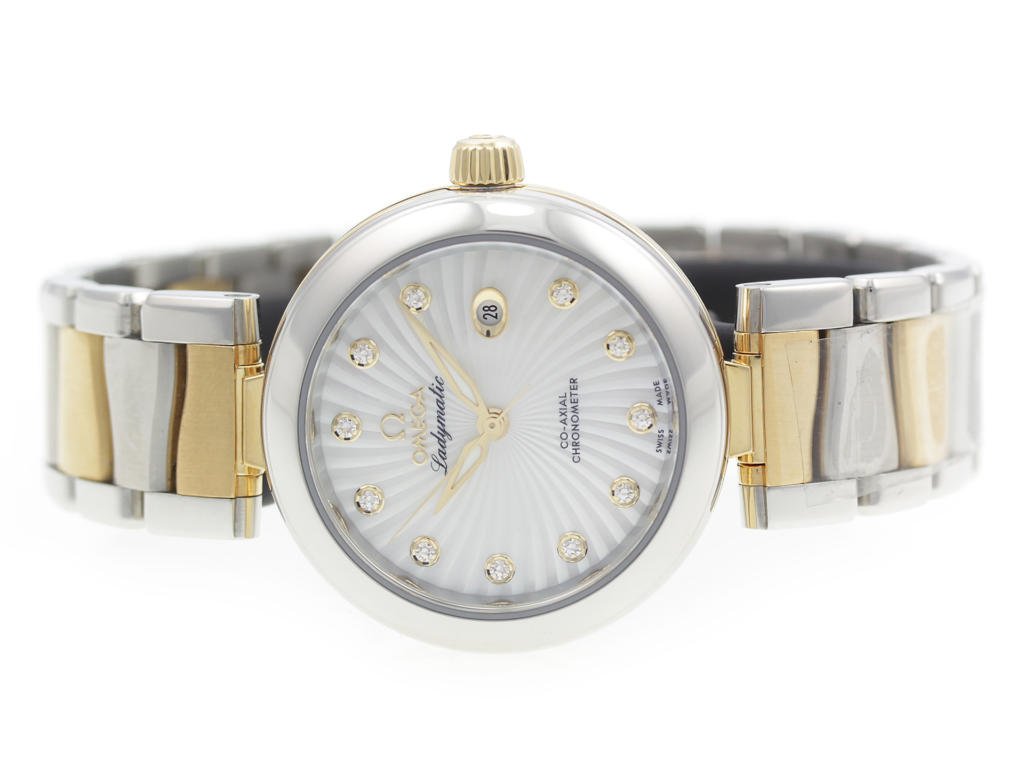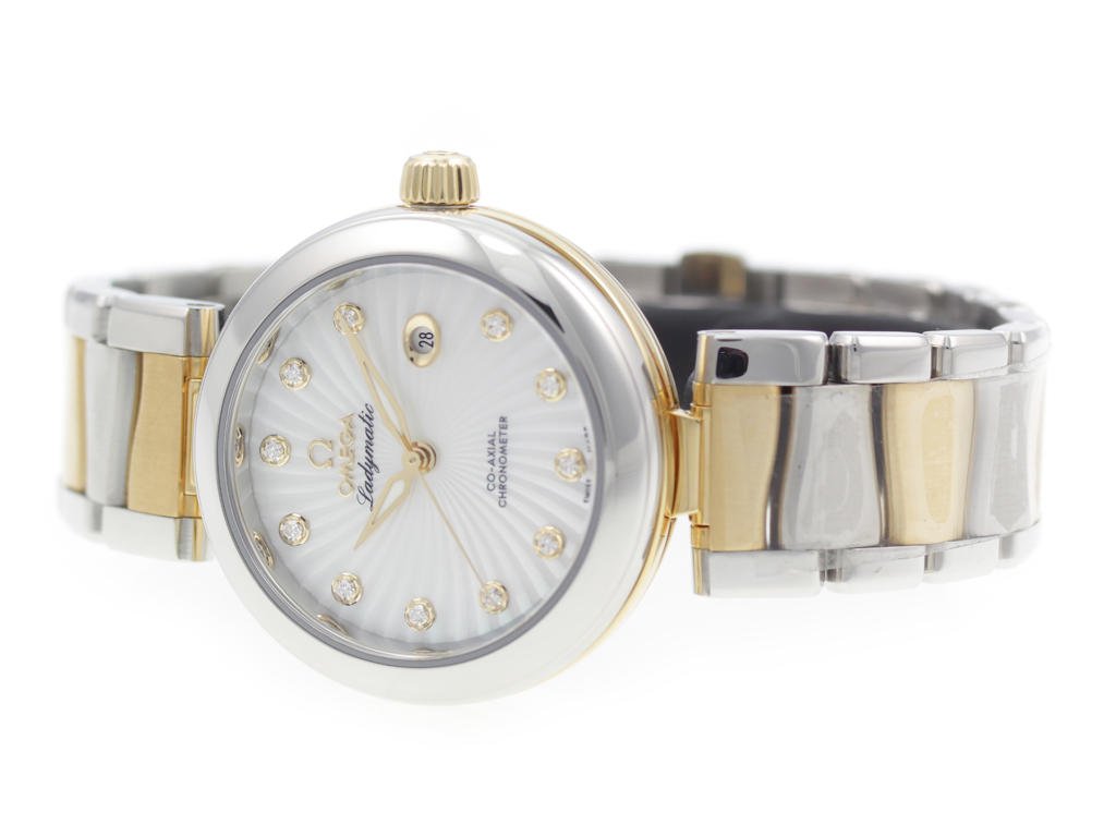 Stainless steel & 18K solid gold Omega De Ville Ladymatic 425.20.34.20.55.002 ladies’ watch with mother-of-pearl dial w/ diamond indexes.