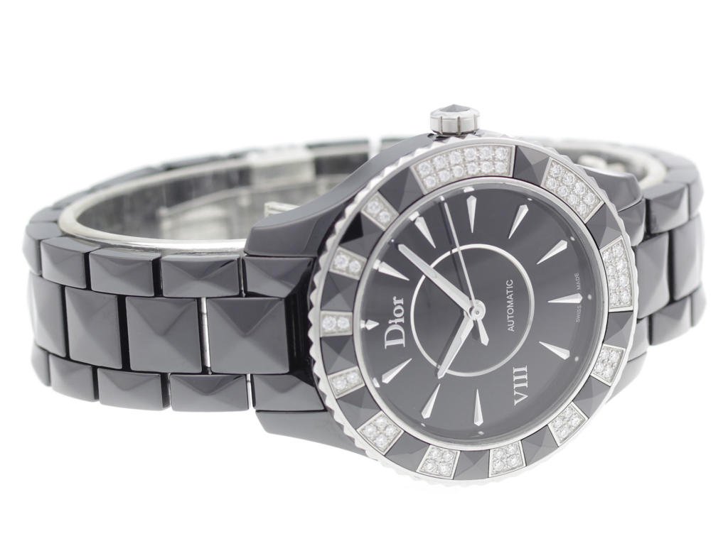 Black ceramic Christian Dior VIII CD1245E1C001 ladies’ watch with black ceramic bezel w/ diamonds and black dial.
