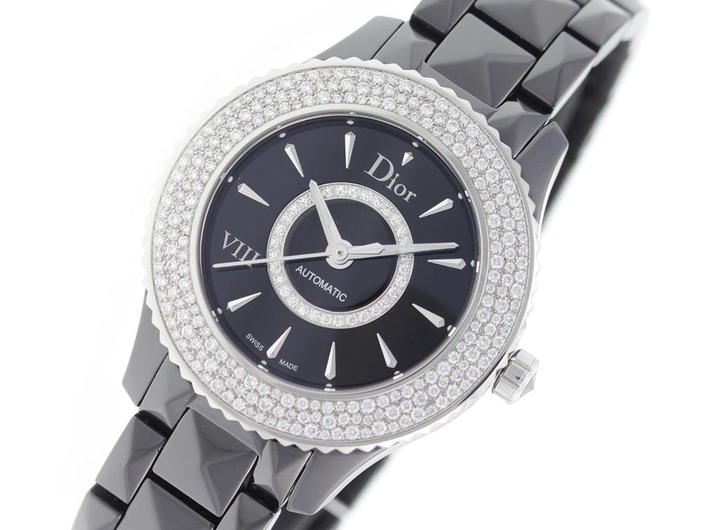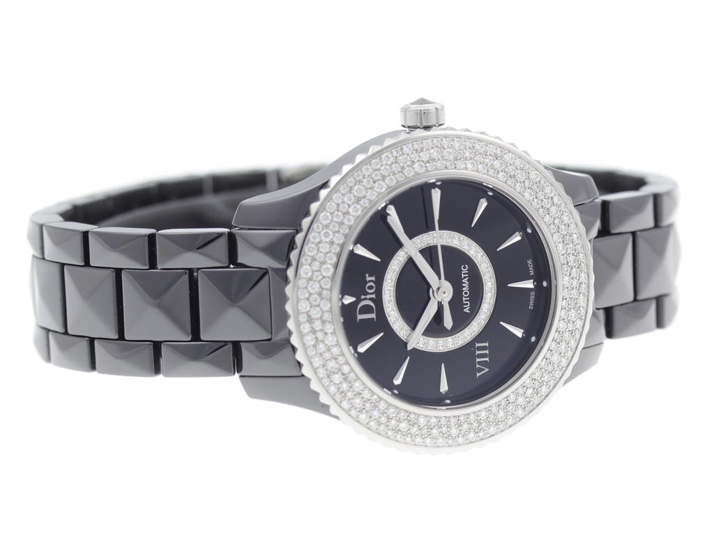 Black ceramic & stainless steel Christian Dior VIII CD1235E1C001 ladies’ watch with diamond bezel and black dial w/ diamonds.