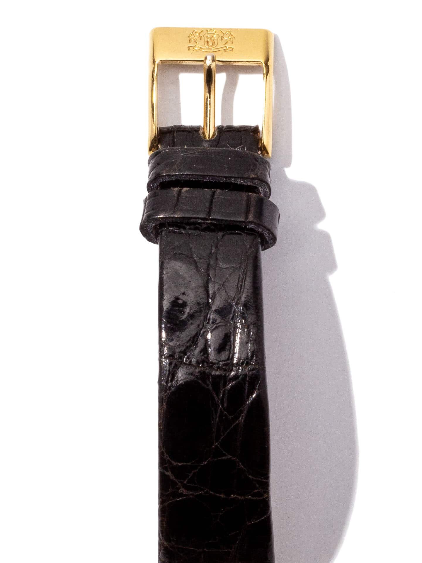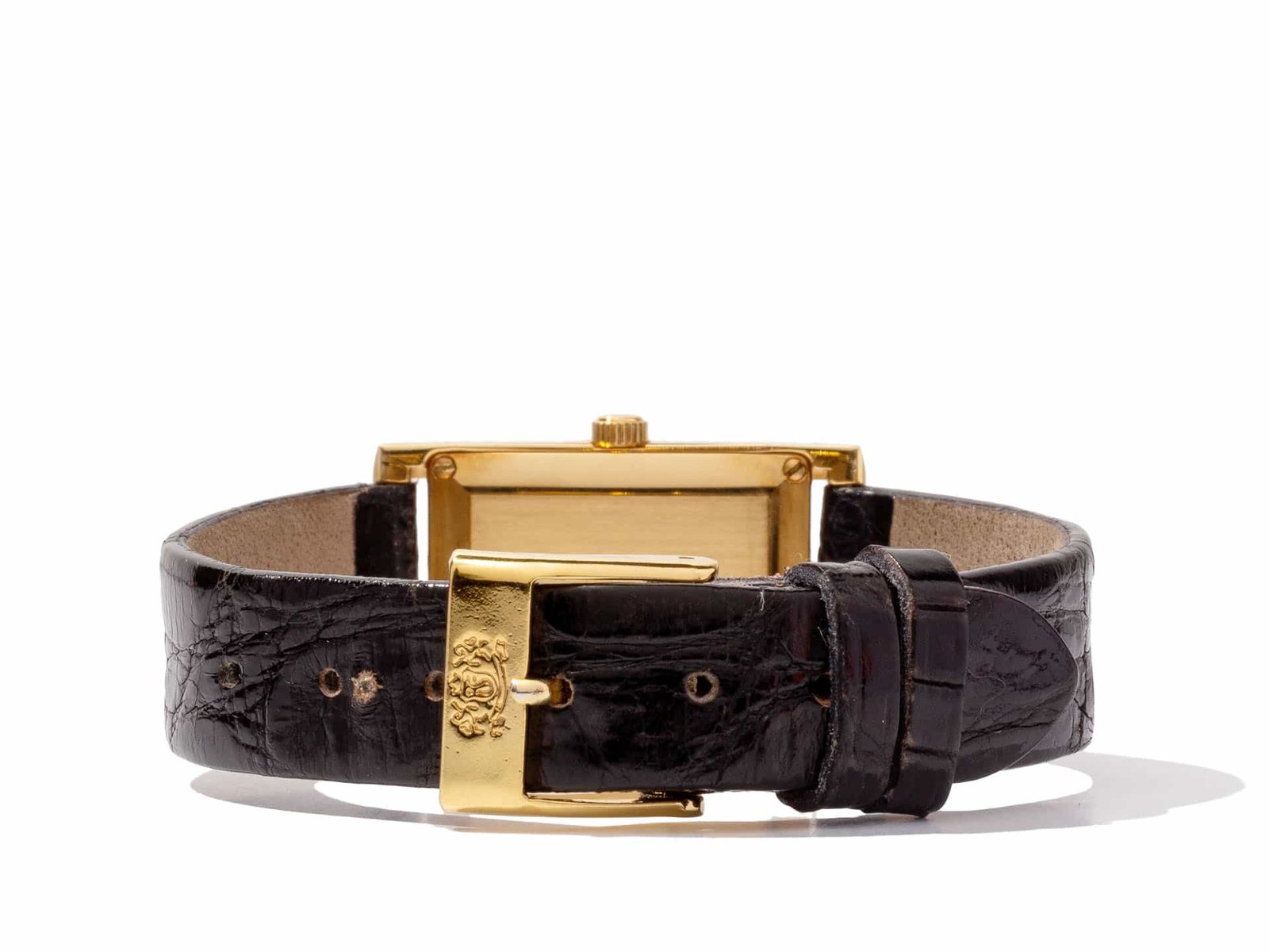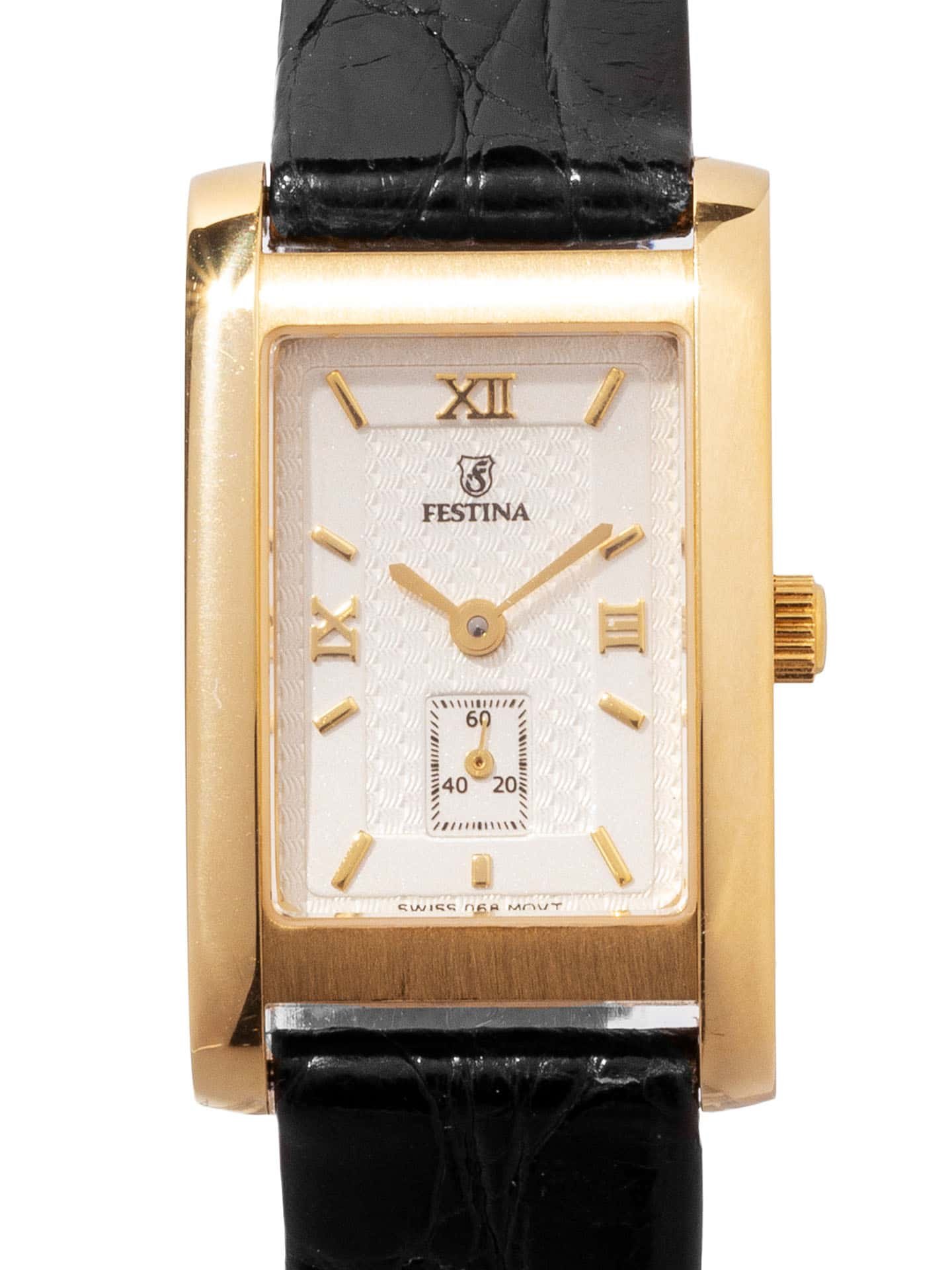 18K Yellow Gold Breitling Festina Tank Swiss Quartz Battery watch with a 22 x 19mm case, silver dial, and crocodile strap strap with yellow gold tang buckle. Features include hours, minutes, and seconds. Comes with a Deluxe Gift Box and 2 Year Precision Watches Store Warranty.
