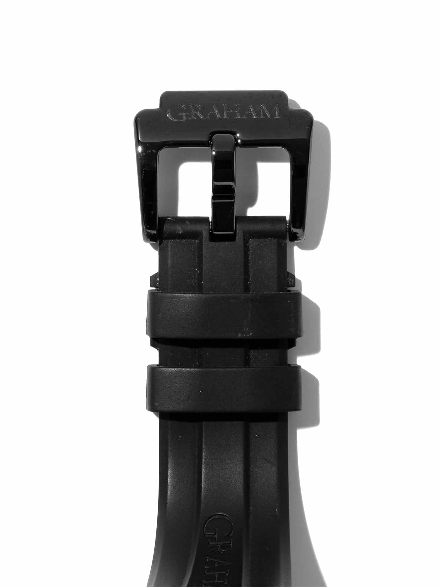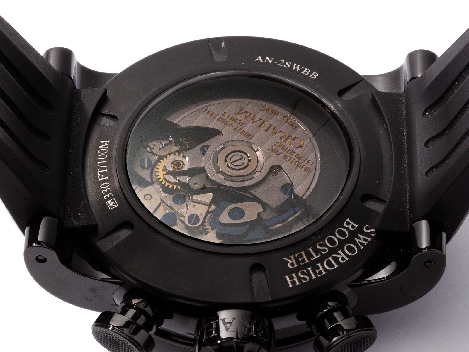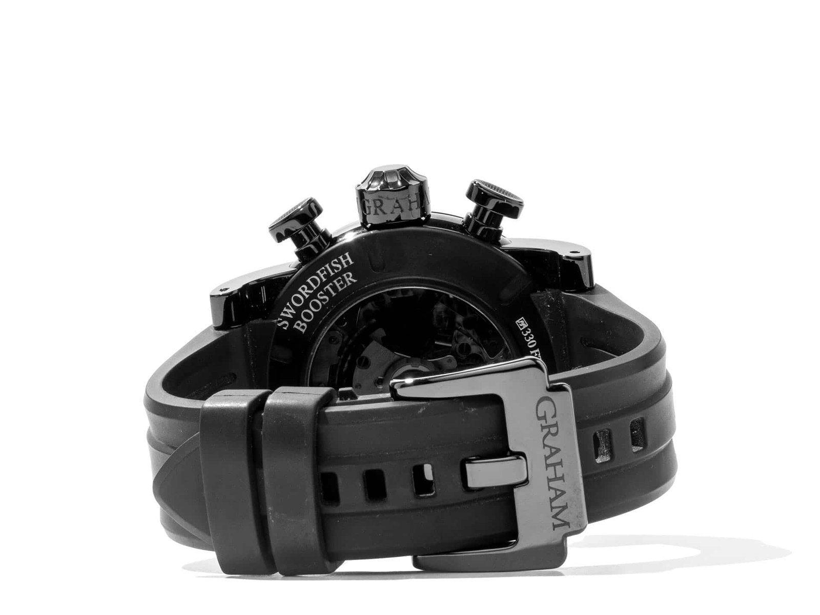 The Graham Swordfish Booster 2SWBB.S36L.K58N is a bold timepiece with a 48mm black PVD steel case. The sleek black dial features index markers with Arabic numerals at the 6 and 12 o’clock positions. The automatic watch has a rubber strap with a tang buckle, providing both comfort and security. The smooth bezel adds a modern touch to its unique design, perfect for watch enthusiasts seeking something out of the ordinary.