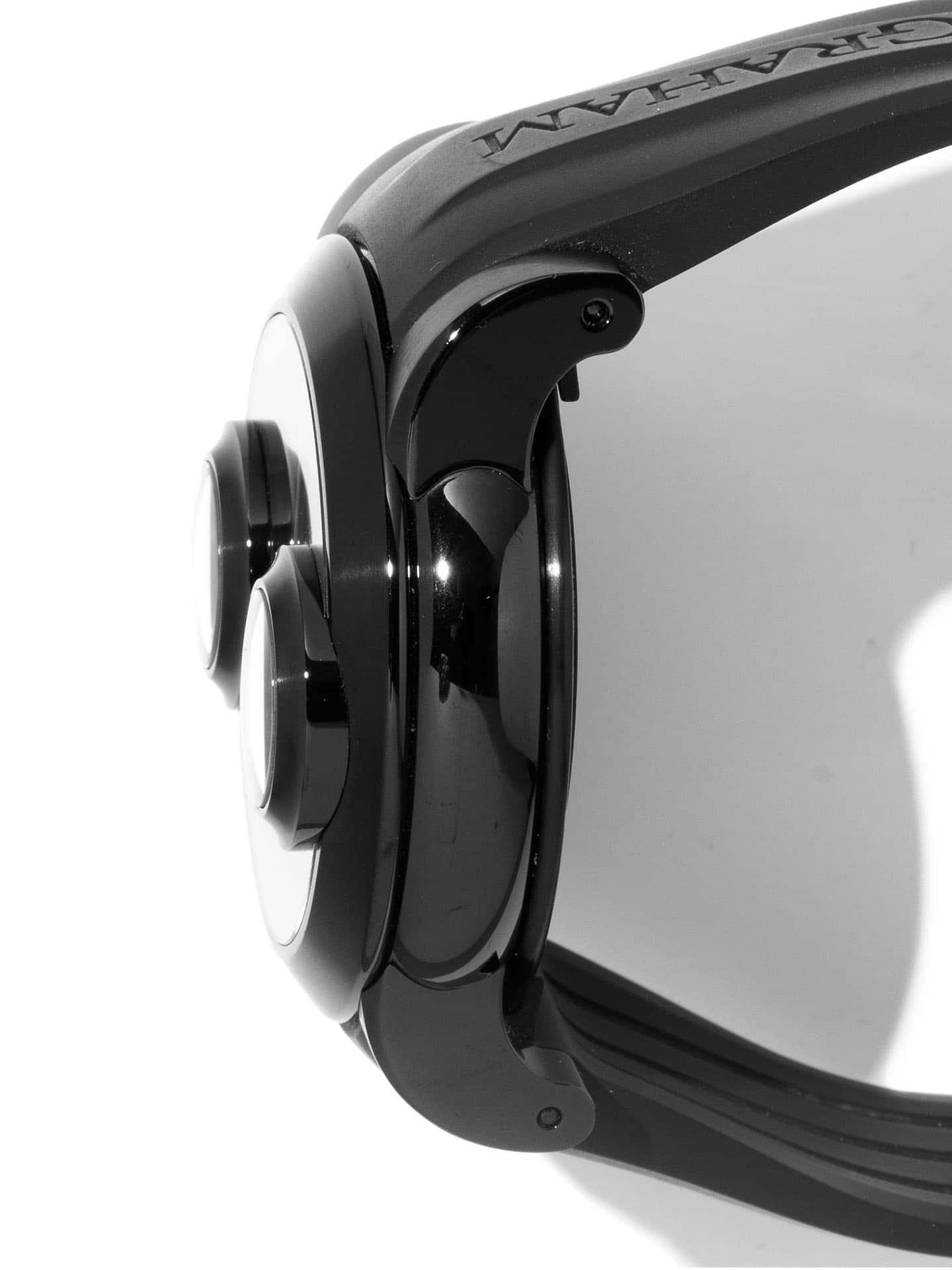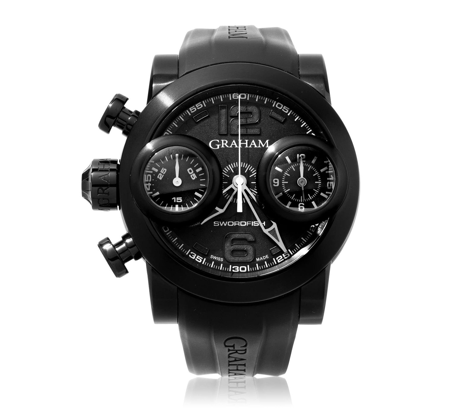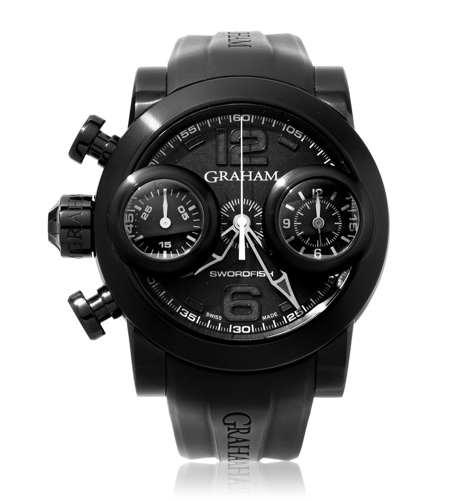 The Graham Swordfish Booster 2SWBB.S36L.K58N is a bold timepiece with a 48mm black PVD steel case. The sleek black dial features index markers with Arabic numerals at the 6 and 12 o’clock positions. The automatic watch has a rubber strap with a tang buckle, providing both comfort and security. The smooth bezel adds a modern touch to its unique design, perfect for watch enthusiasts seeking something out of the ordinary.