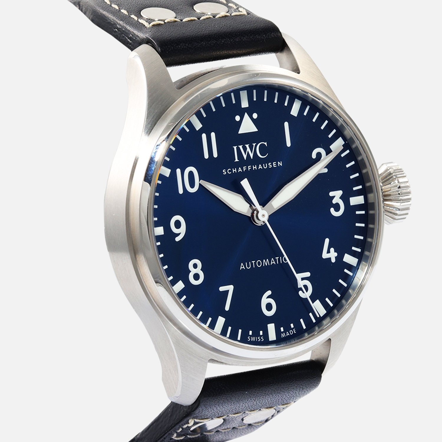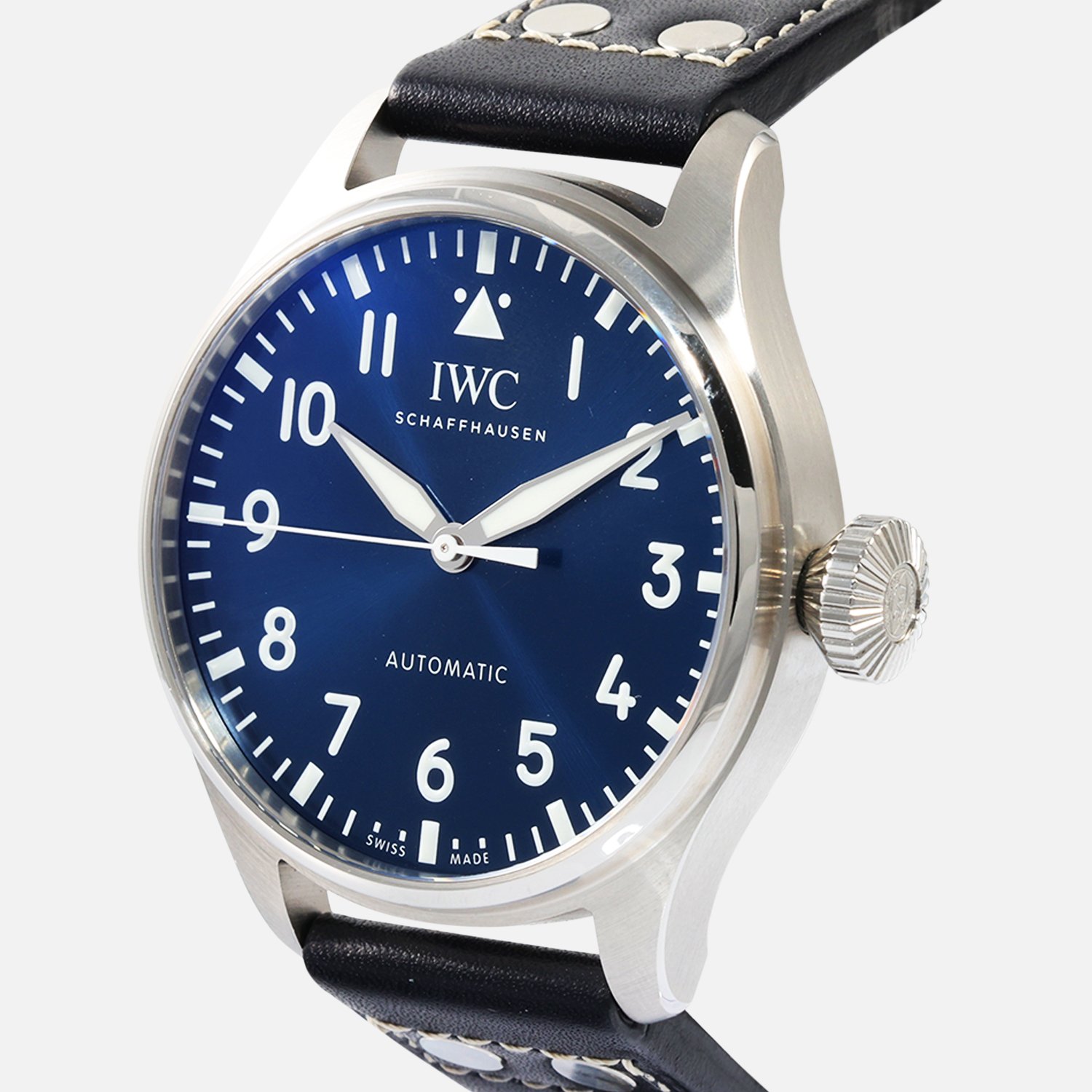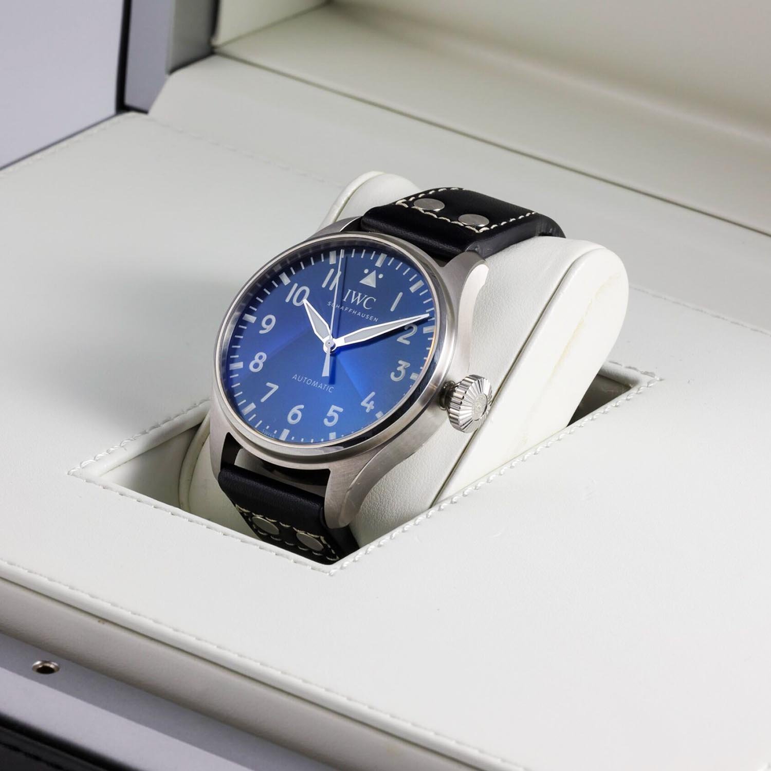 The IWC Big Pilot’s Watch 43 (IW329303) showcases precision and style. Durable stainless steel case and comfortable black calfskin strap. Deployment clasp for added security. Automatic IWC Calibre 82100 for accurate timekeeping. Exhibition caseback reveals inner workings. Blue dial with Arabic markers adds sophistication. Water resistant up to 100M / 330FT.