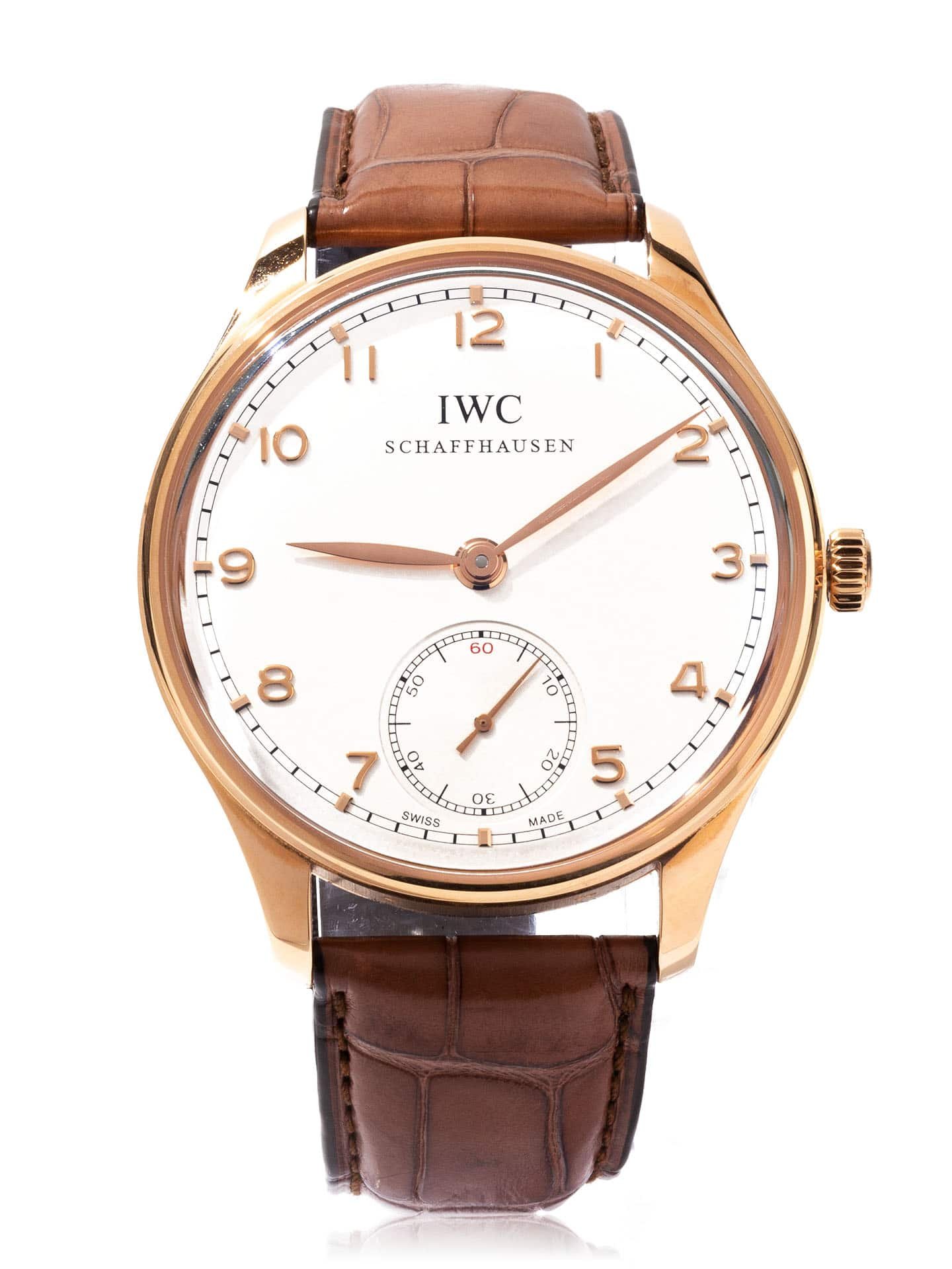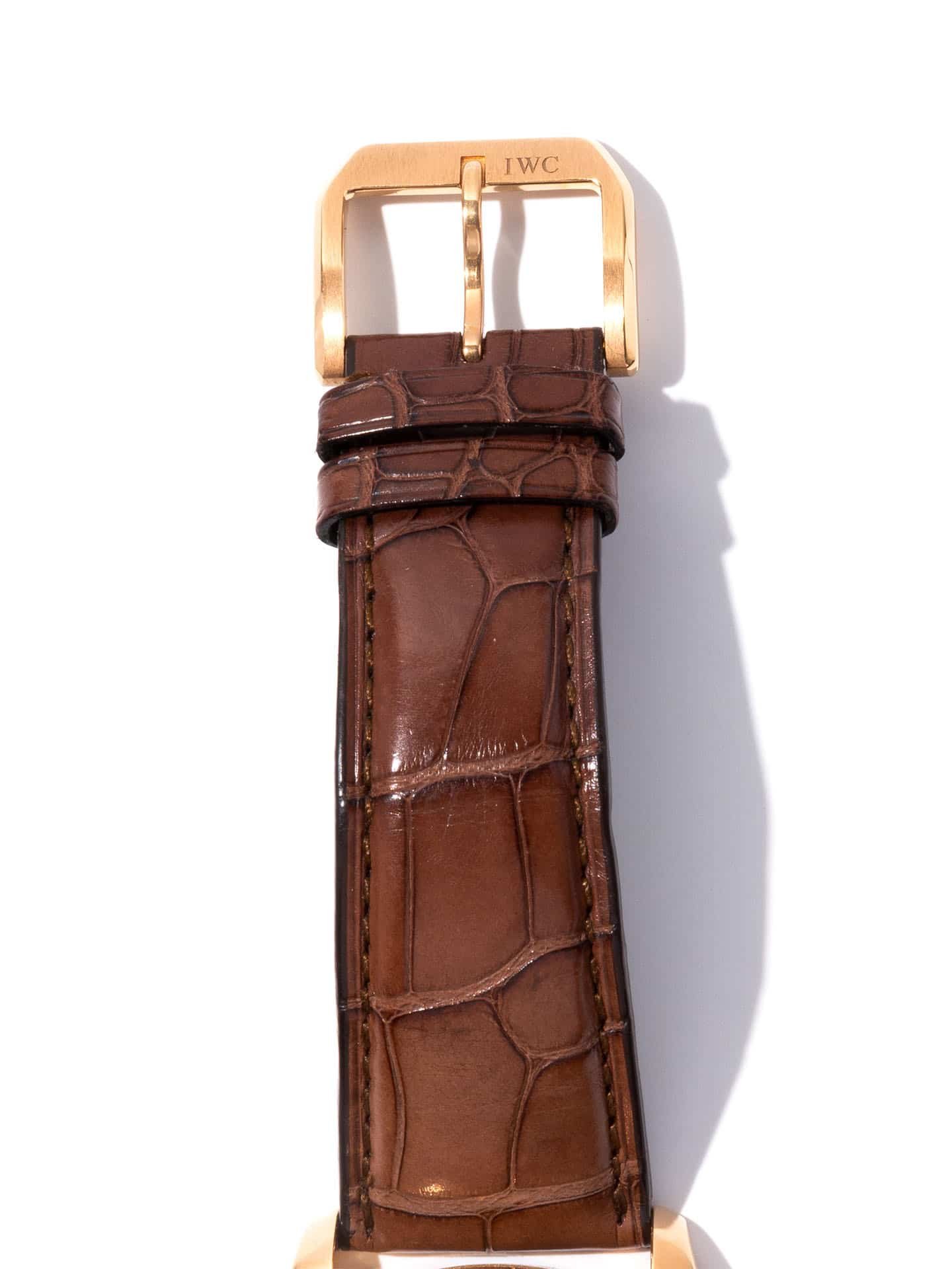 18k Rose Gold IWC Portuguese manual wind watch with a 44mm case, white dial, and brown leather strap with tang buckle. Features include hours, minutes, and seconds. Comes with a Deluxe Gift Box and 2 Year Precision Watches Store Warranty.