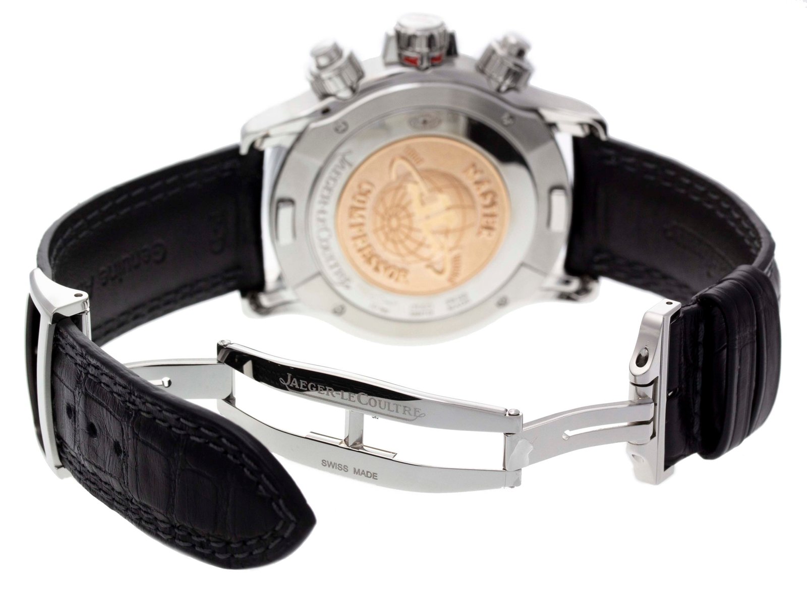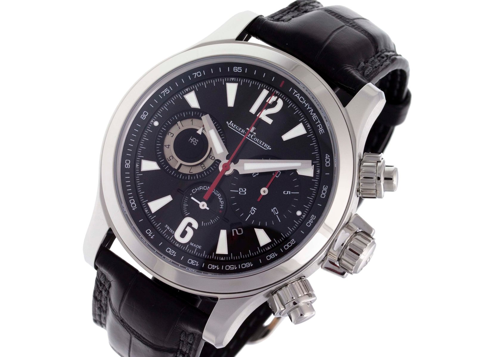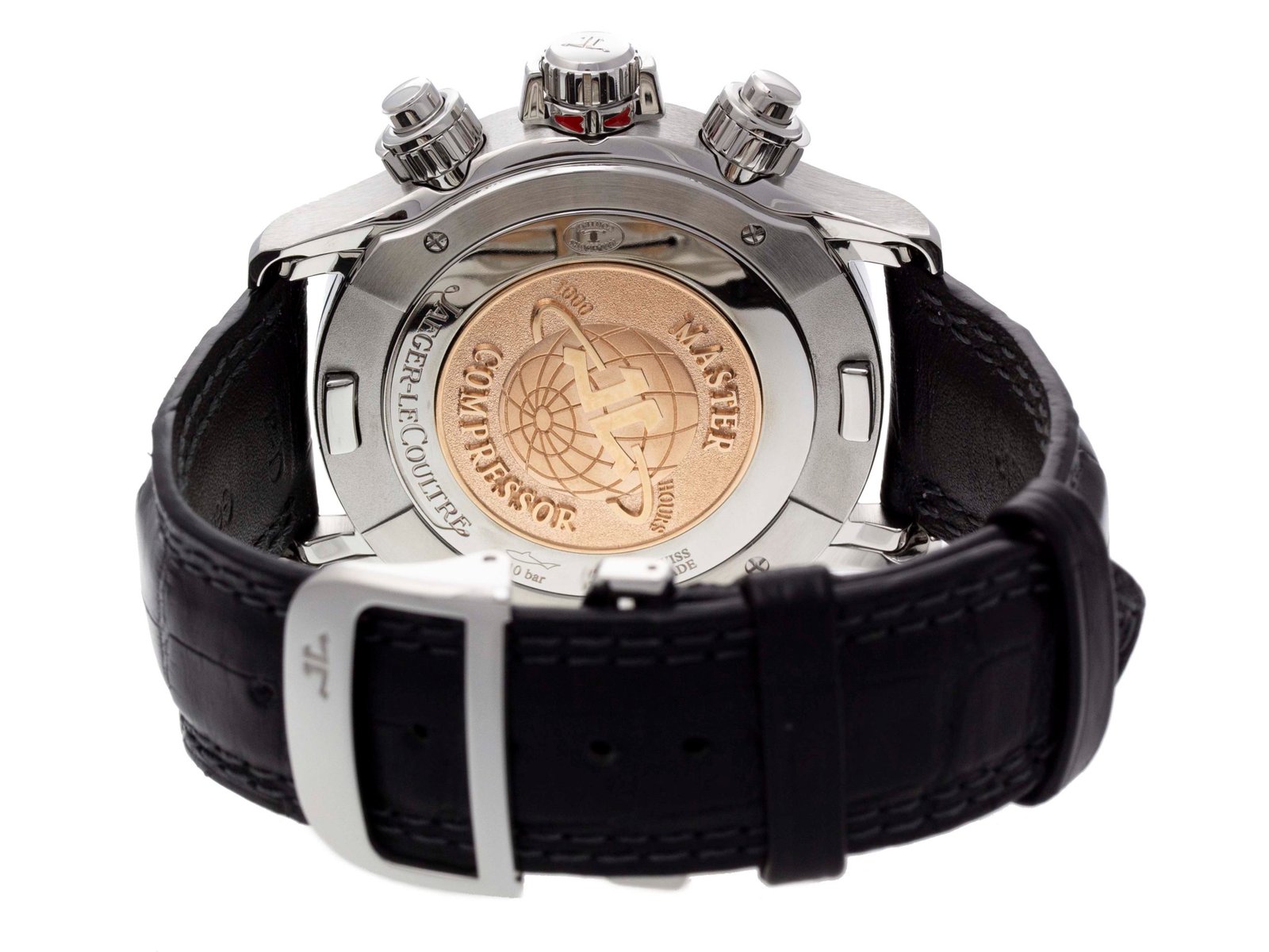 Jaeger Lecoultre – Master Compressor Chronograph – 41.5MM – Stainless Steel – Fixed Bezel – Black Index w/ Three Sub-dials, Date Between 4 & 5 Dial – Black Leather Strap – Vendor Style #: Q1758421