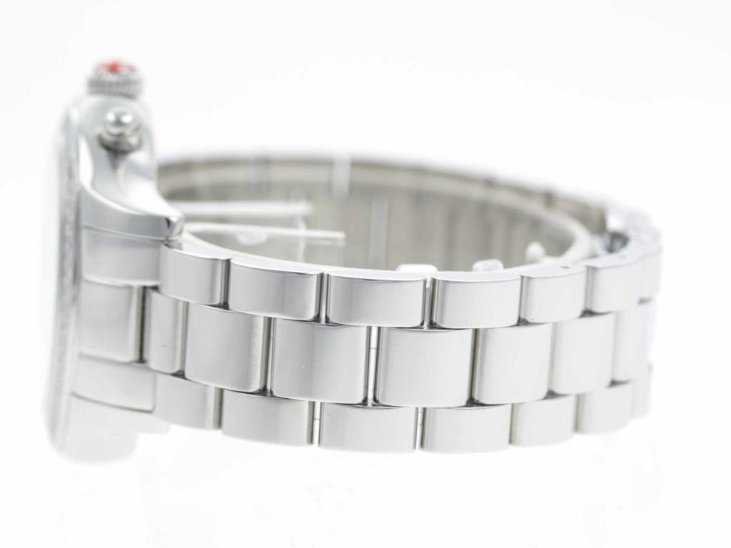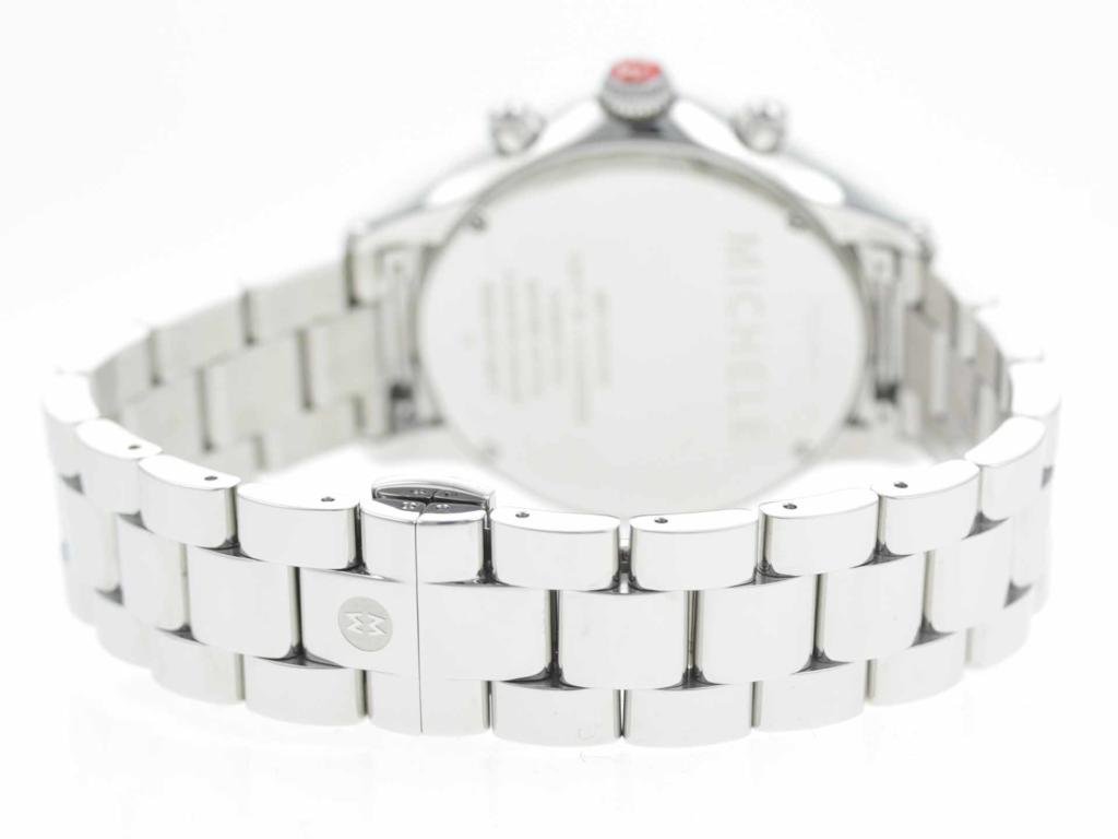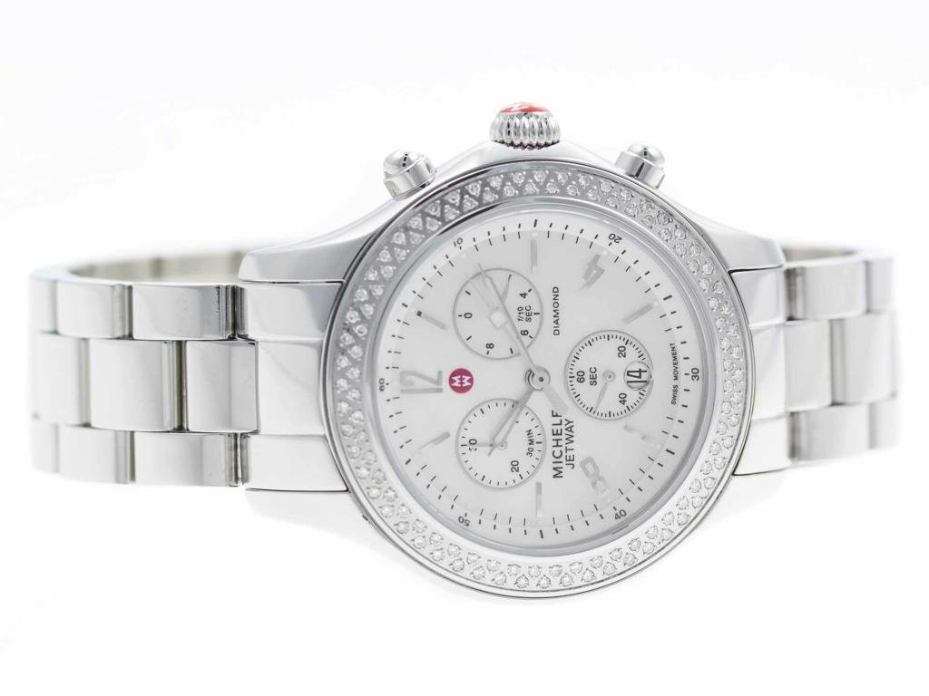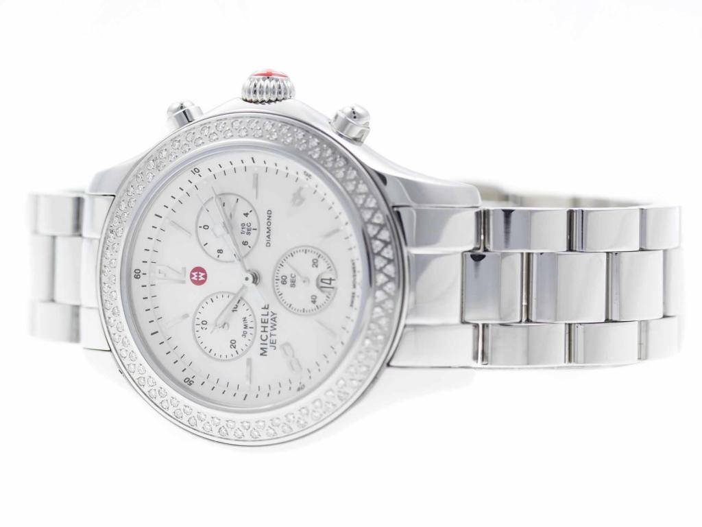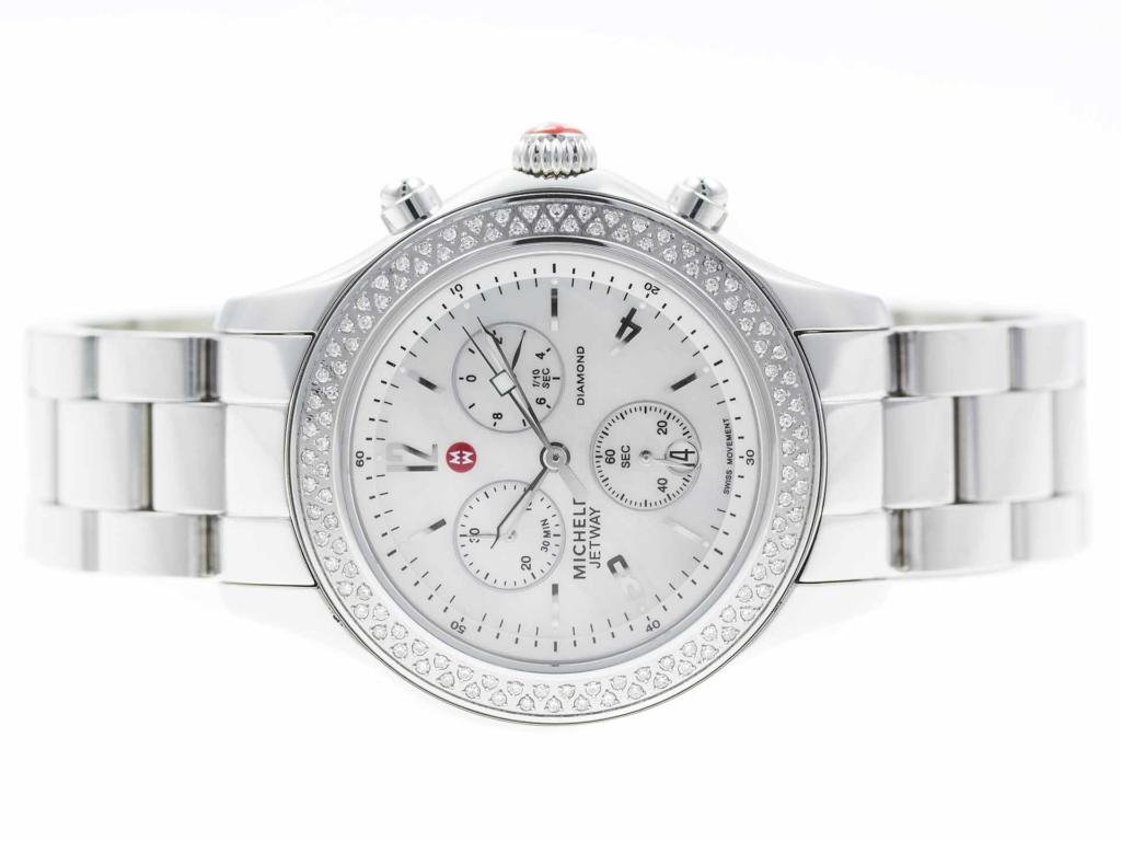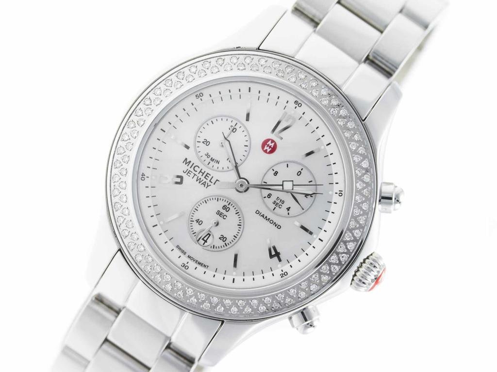 Stainless steel Michele Jetway MW17A01A1025 MWW17C000007 ladies’ watch with diamond bezel and mother-of-pearl dial.