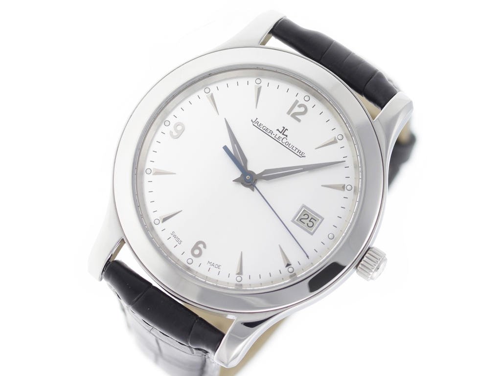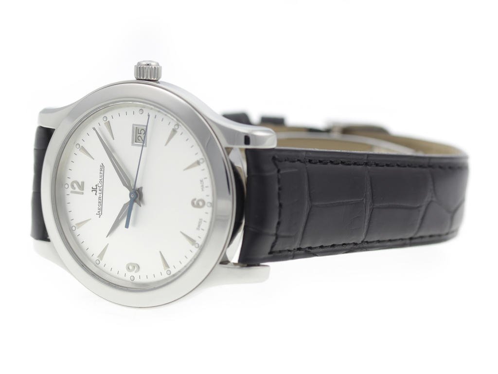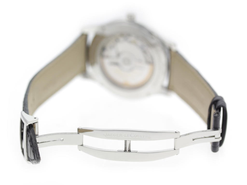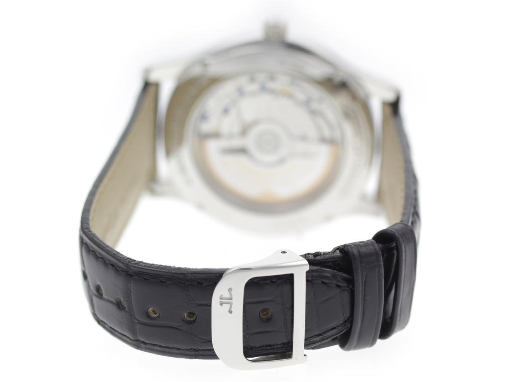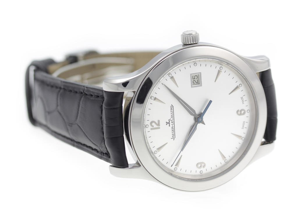 Stainless steel case, on black leather strap Jaeger-LeCoultre Master Control 147.8.37.S men’s watch with silver dial.