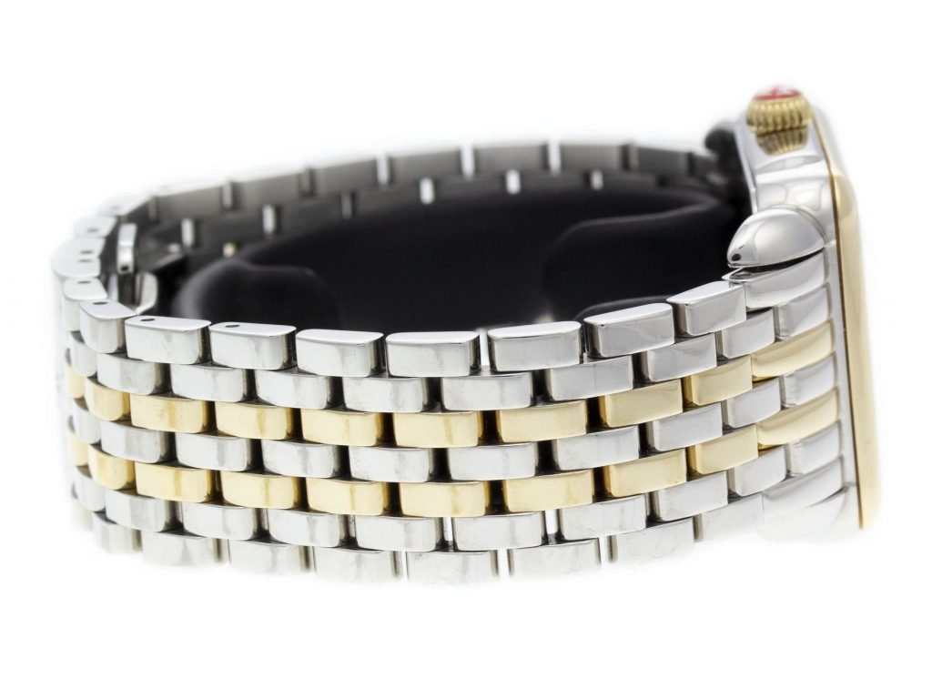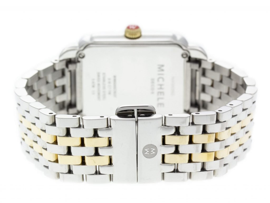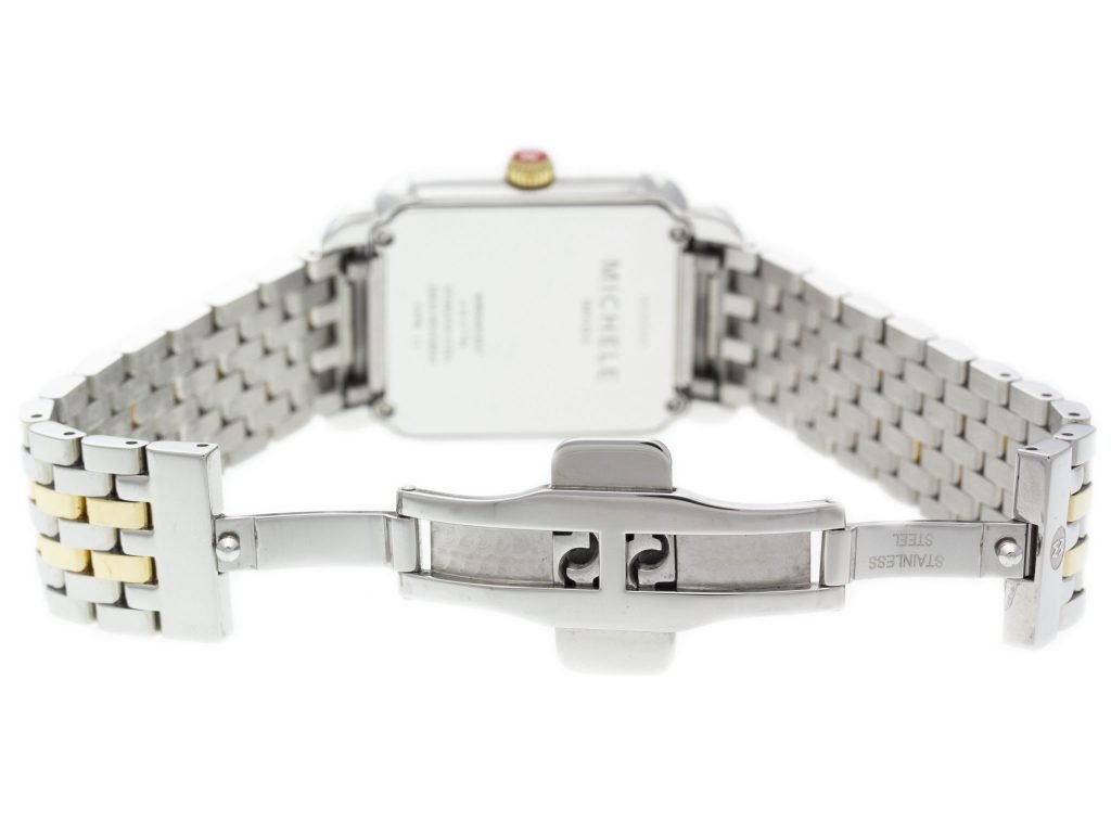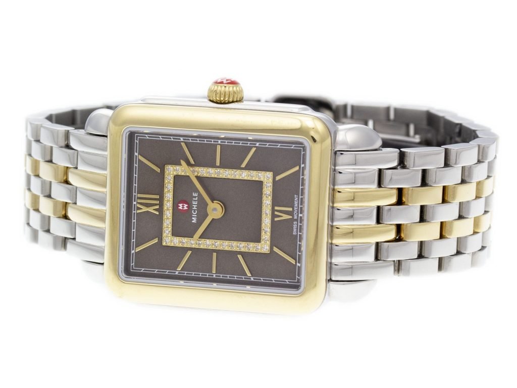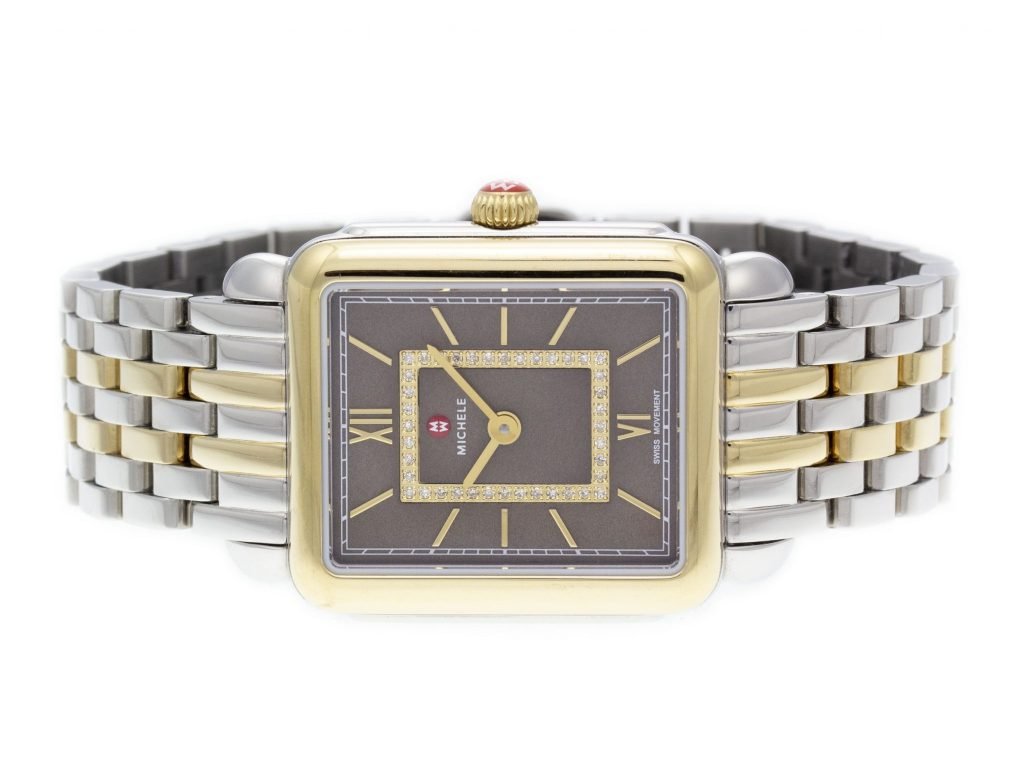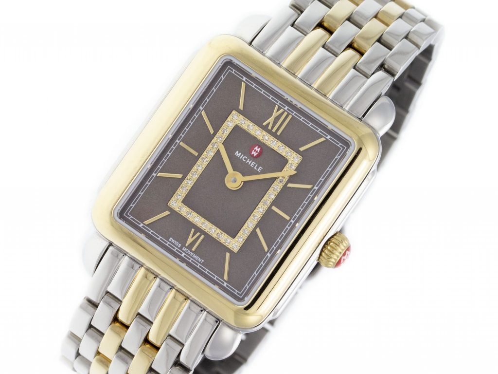 Two-Tone PVD Steel Michele Deco II Mid Watch with a 29mm x 26.5mm Case, Cocoa MOP Diamond Dial, and Link Bracelet with Folding Clasp. Features include Hours and Minutes. Comes with a Deluxe Gift Box and 2 Year Precision Watches Store Warranty.