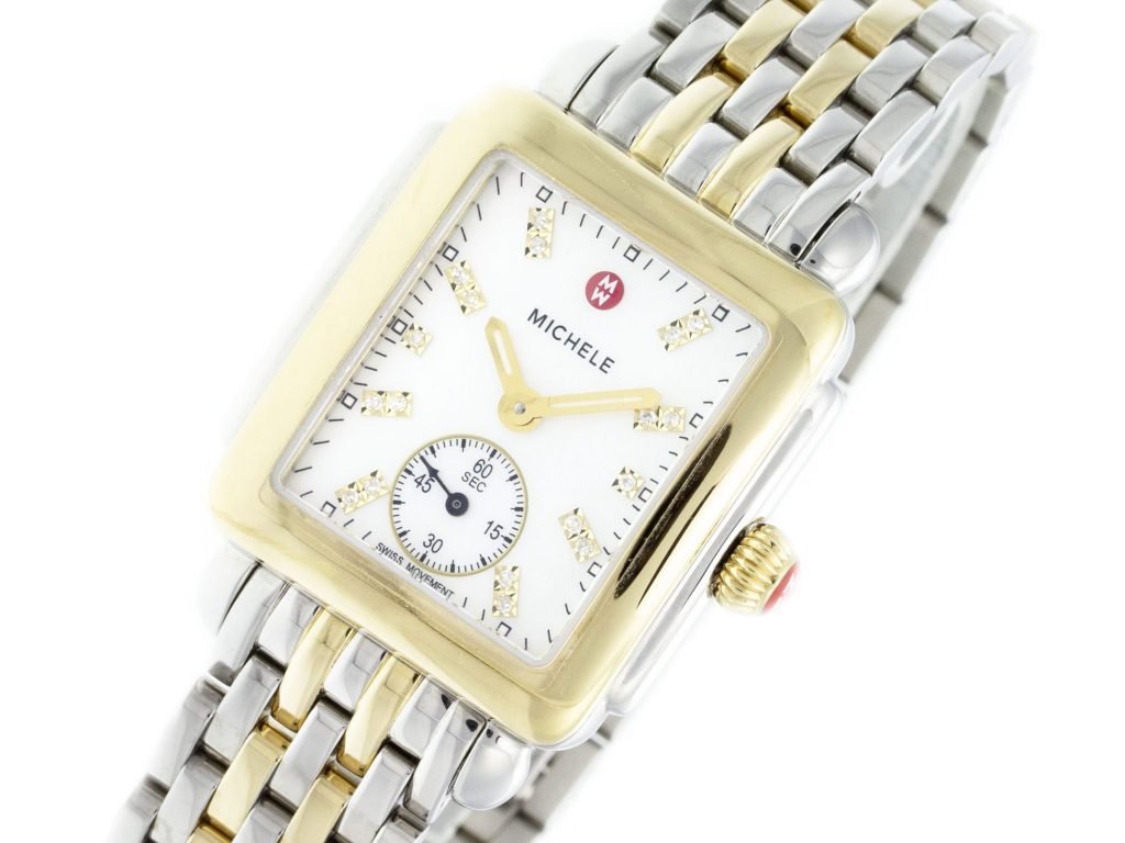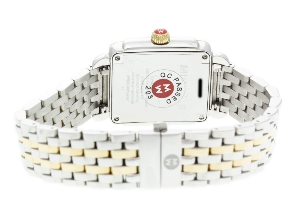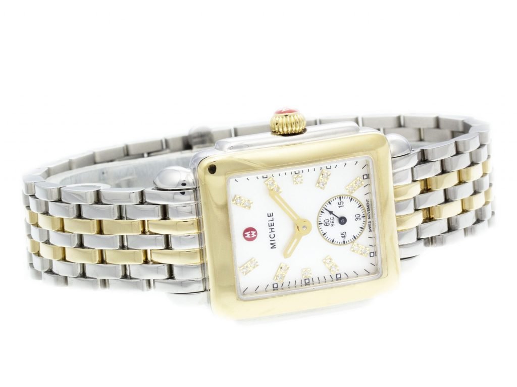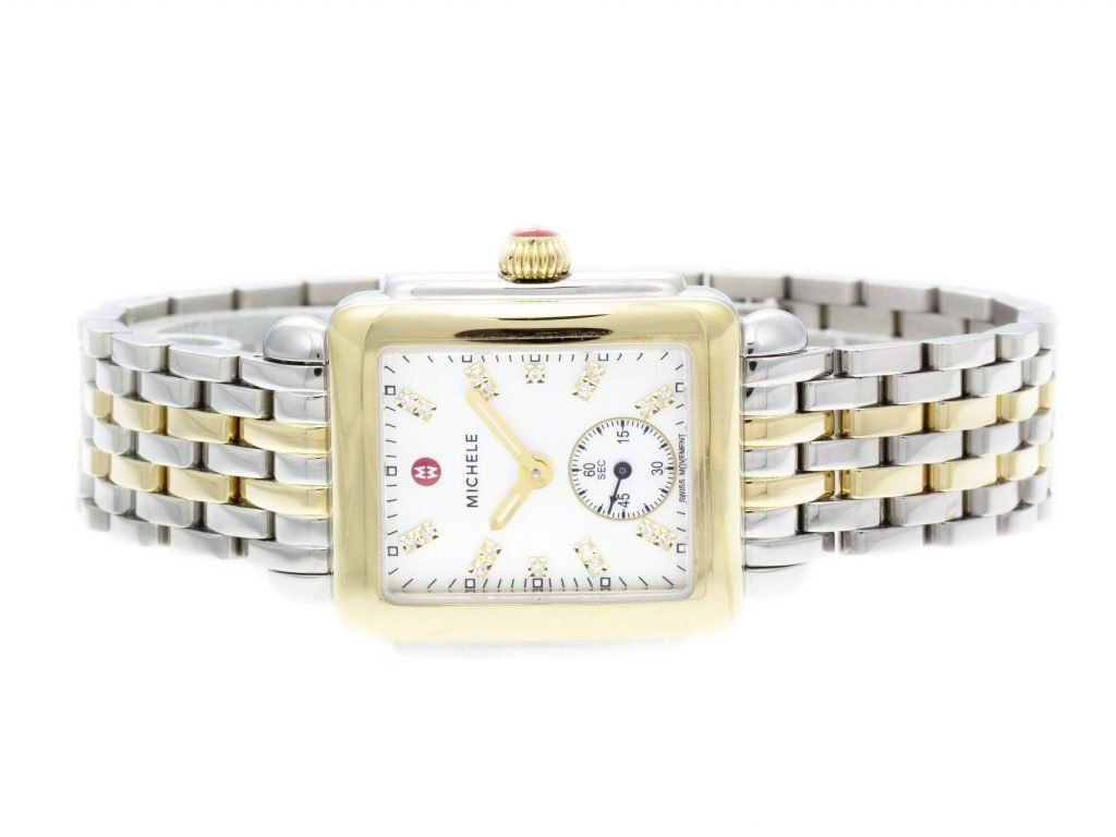Two-Tone PVD Steel Michele Deco Watch with a 31mm Case, MOP Diamond Dial, and Link Bracelet with Folding Clasp. Features include Hours, Minutes, and Seconds. Comes with a Deluxe Gift Box and 2 Year Precision Watches Store Warranty.