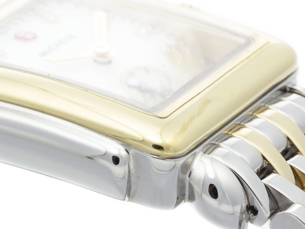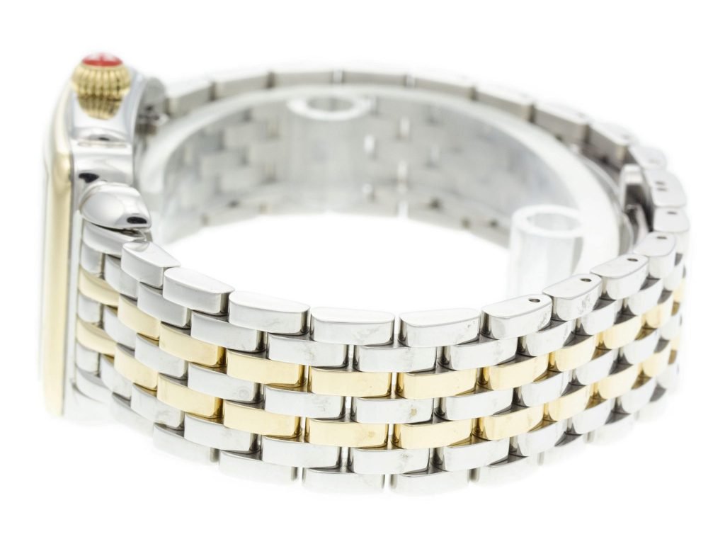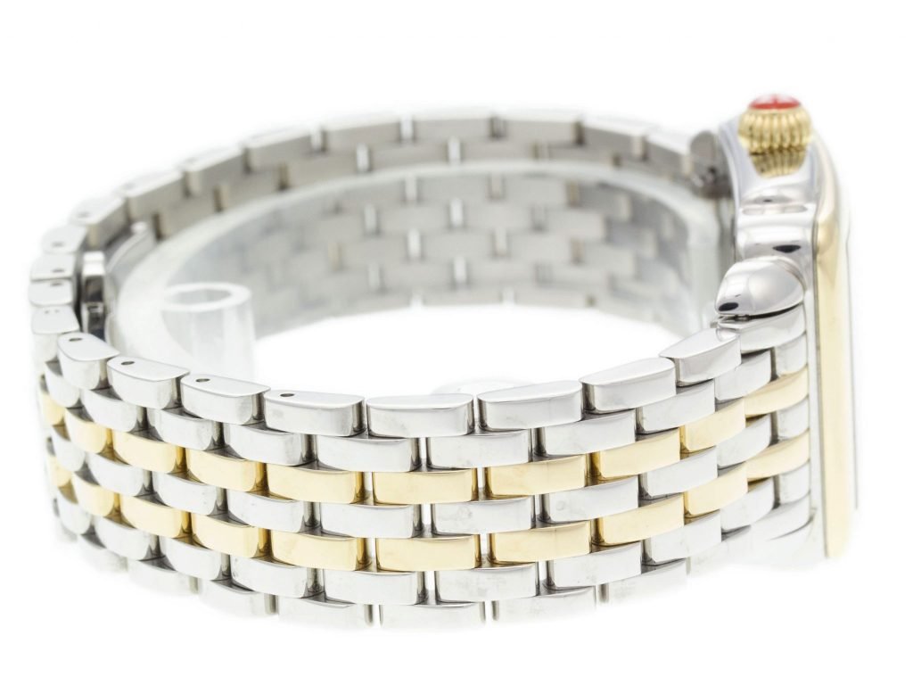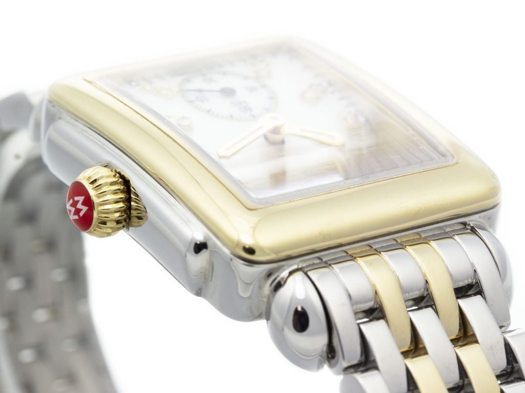 Two-Tone PVD Steel Michele Deco Watch with a 31mm Case, MOP Diamond Dial, and Link Bracelet with Folding Clasp. Features include Hours, Minutes, and Seconds. Comes with a Deluxe Gift Box and 2 Year Precision Watches Store Warranty.