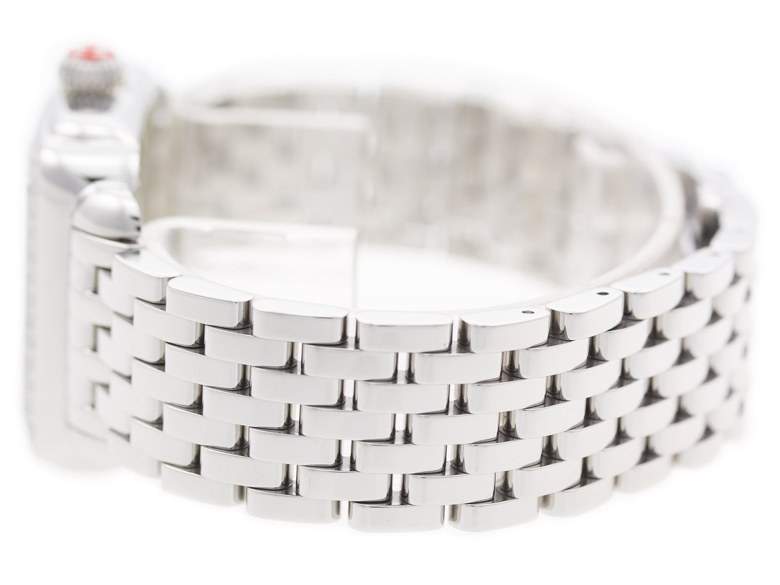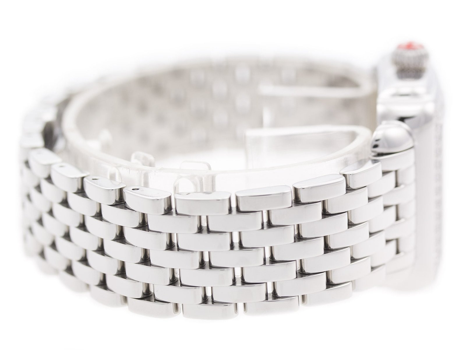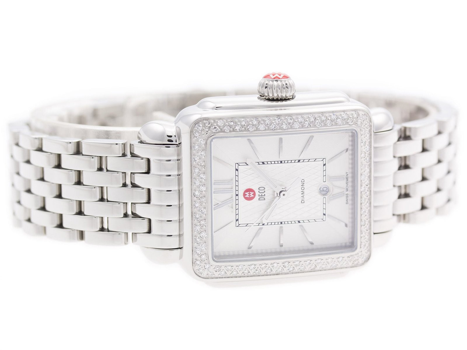 Stainless steel Michele Deco Signature MWW06T000055, water resistant to 50m, with diamond bezel, date, and bracelet.