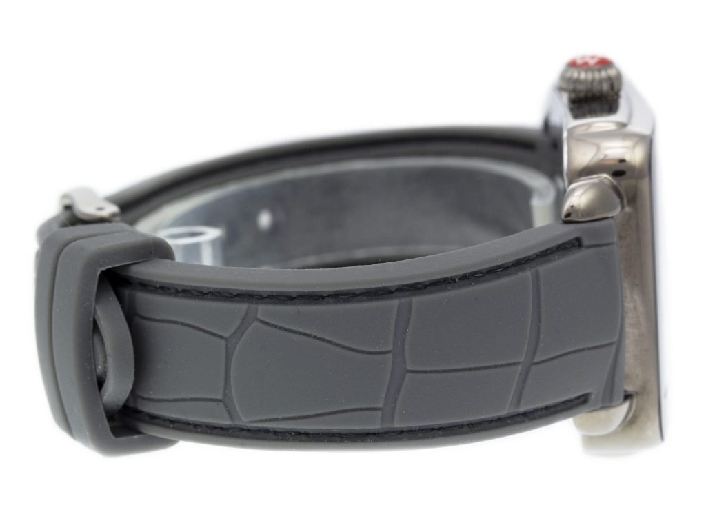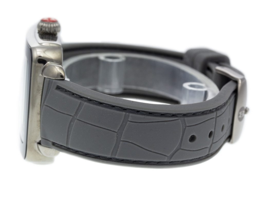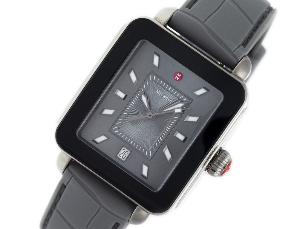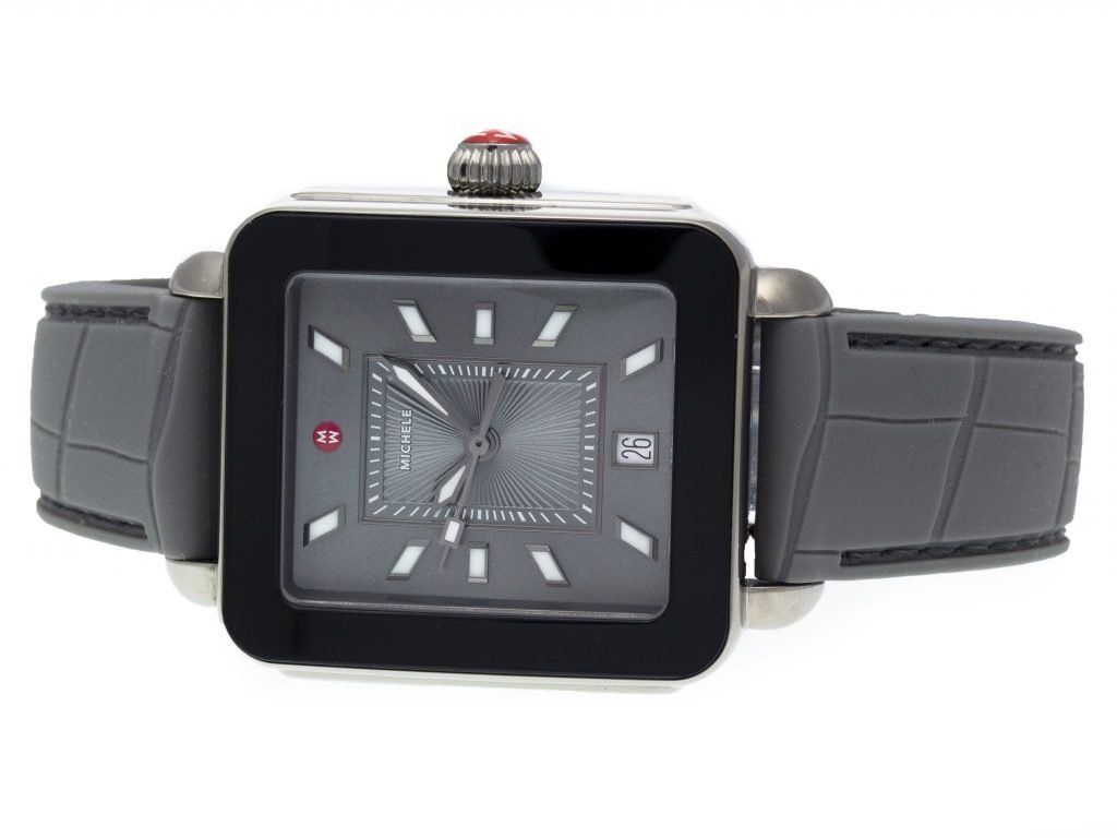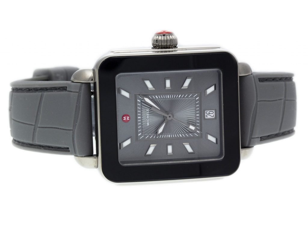 Silicone & Stainless Steel Michele Deco Sport Watch with a 34mm x 36mm case, Shadow Grey Dial, and Silicone Strap with Tang Buckle. Features include Hours, Minutes, Seconds, and Date. Comes with a Deluxe Gift Box and 2 Year Precision Watches Store Warranty.