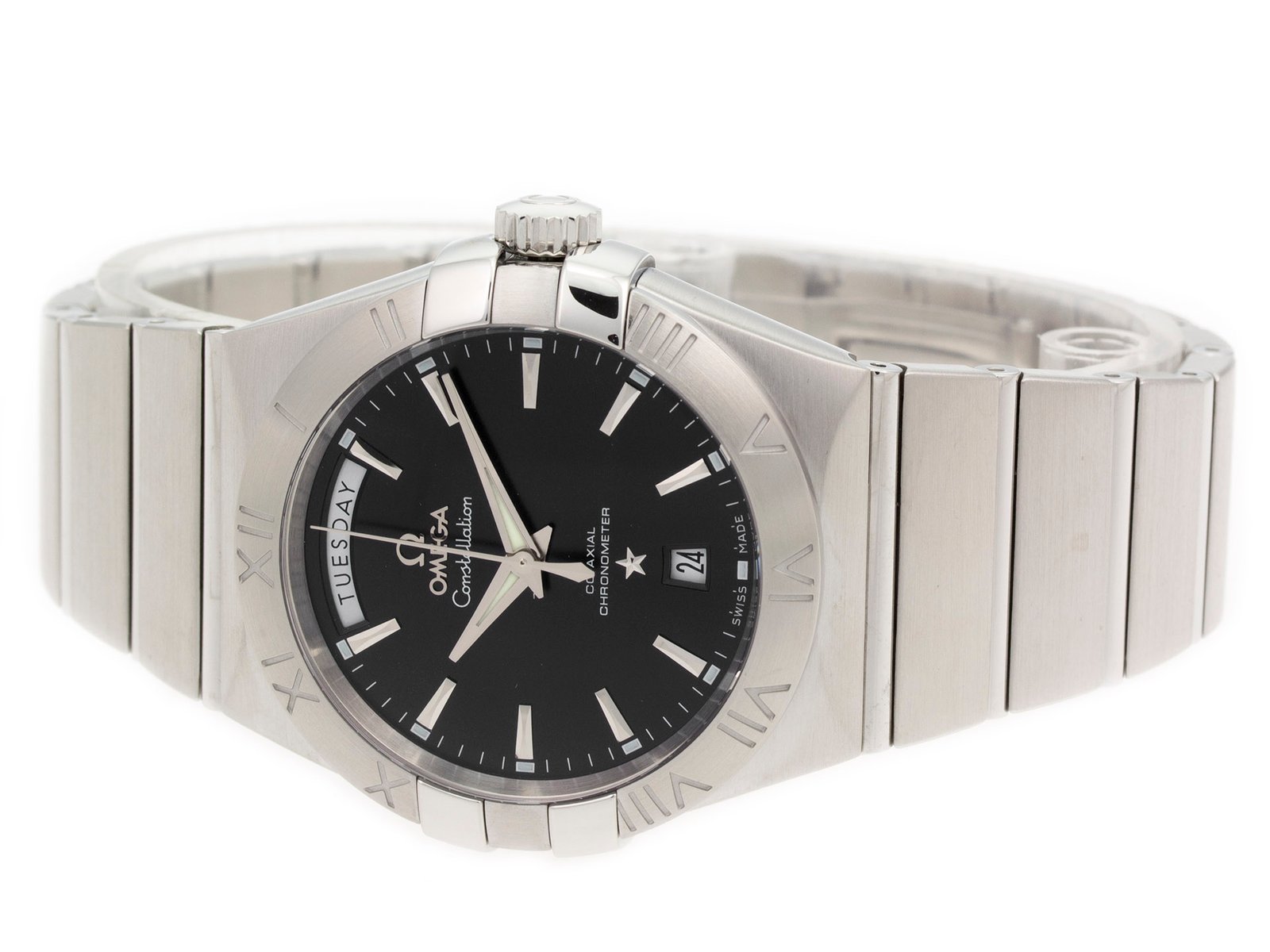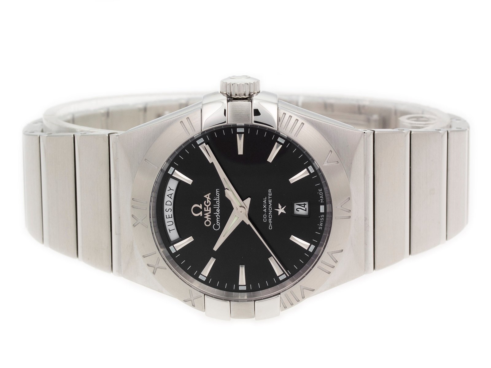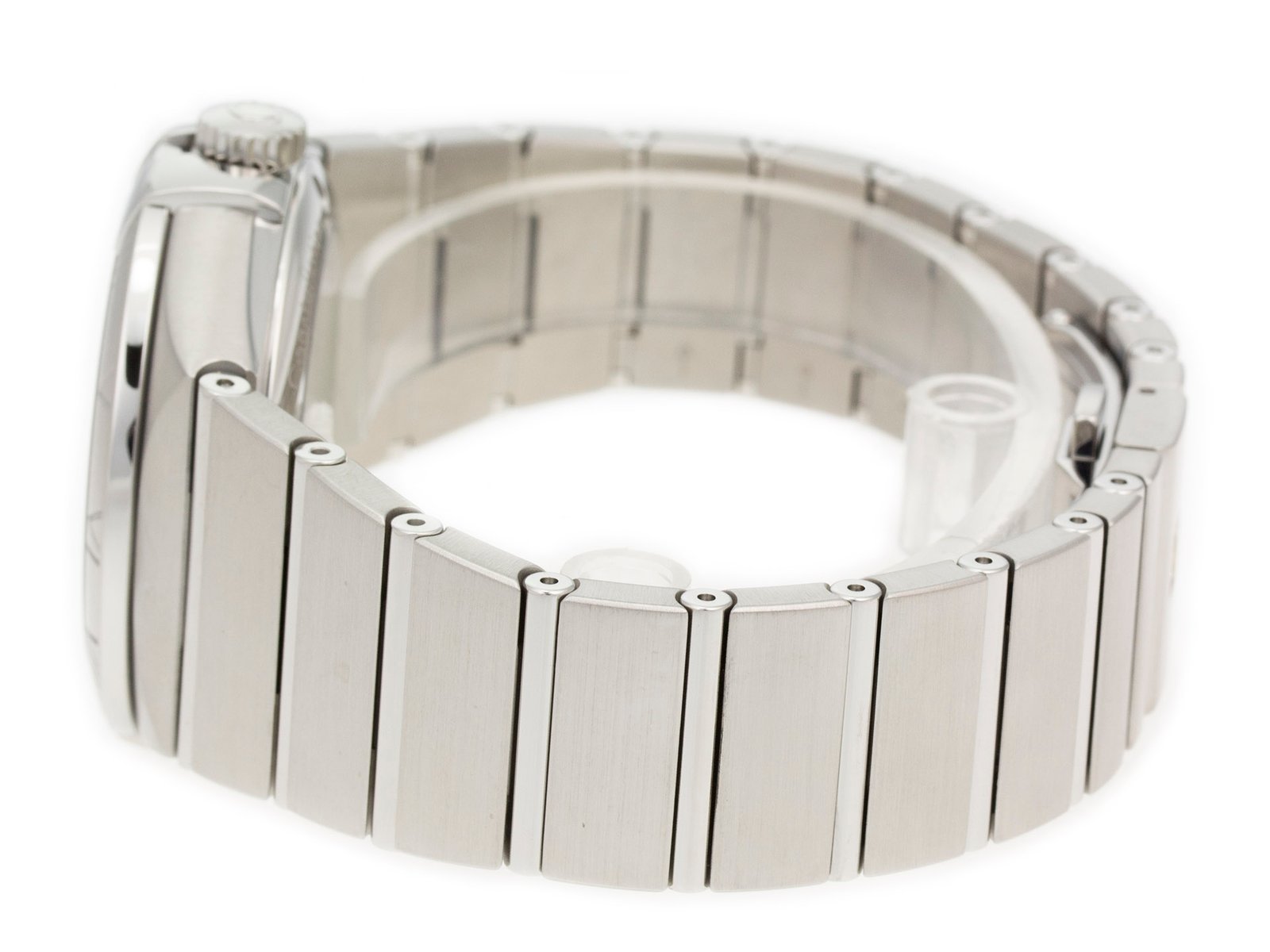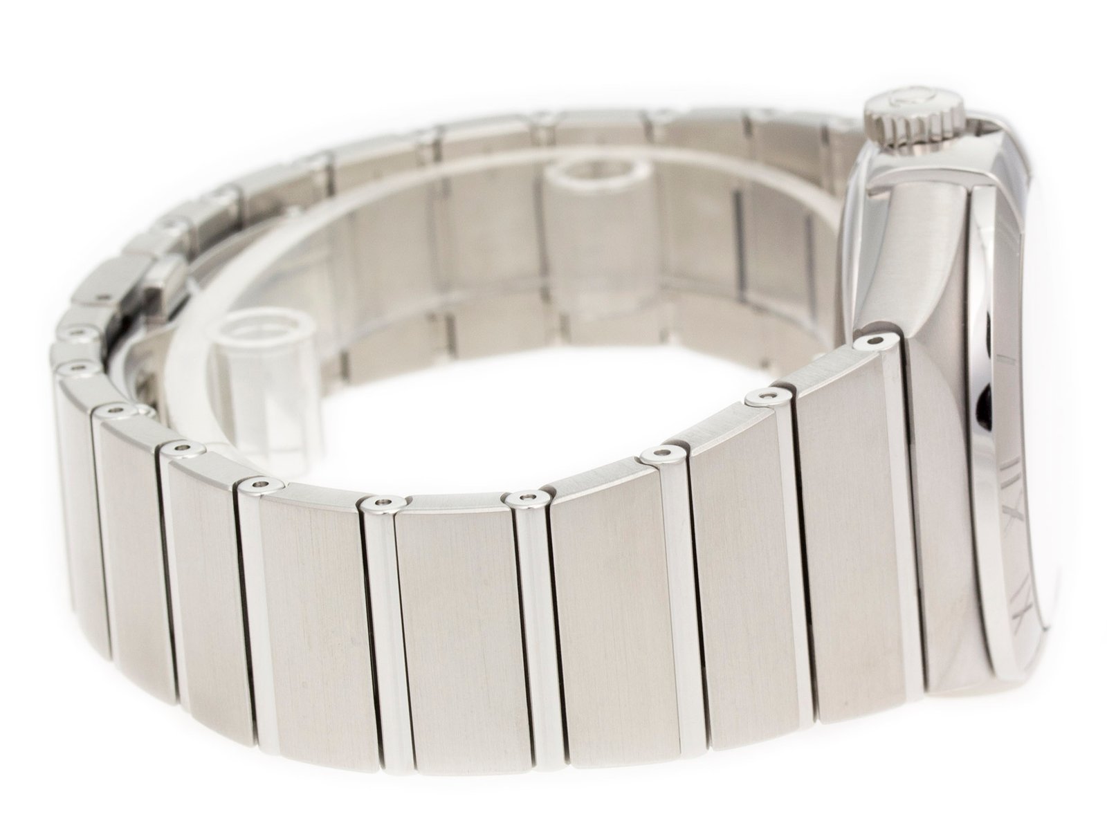 Stainless steel Omega Constellation 123.10.38.22.01.001 watch, water resistant to 100m, with day, date, and bracelet.