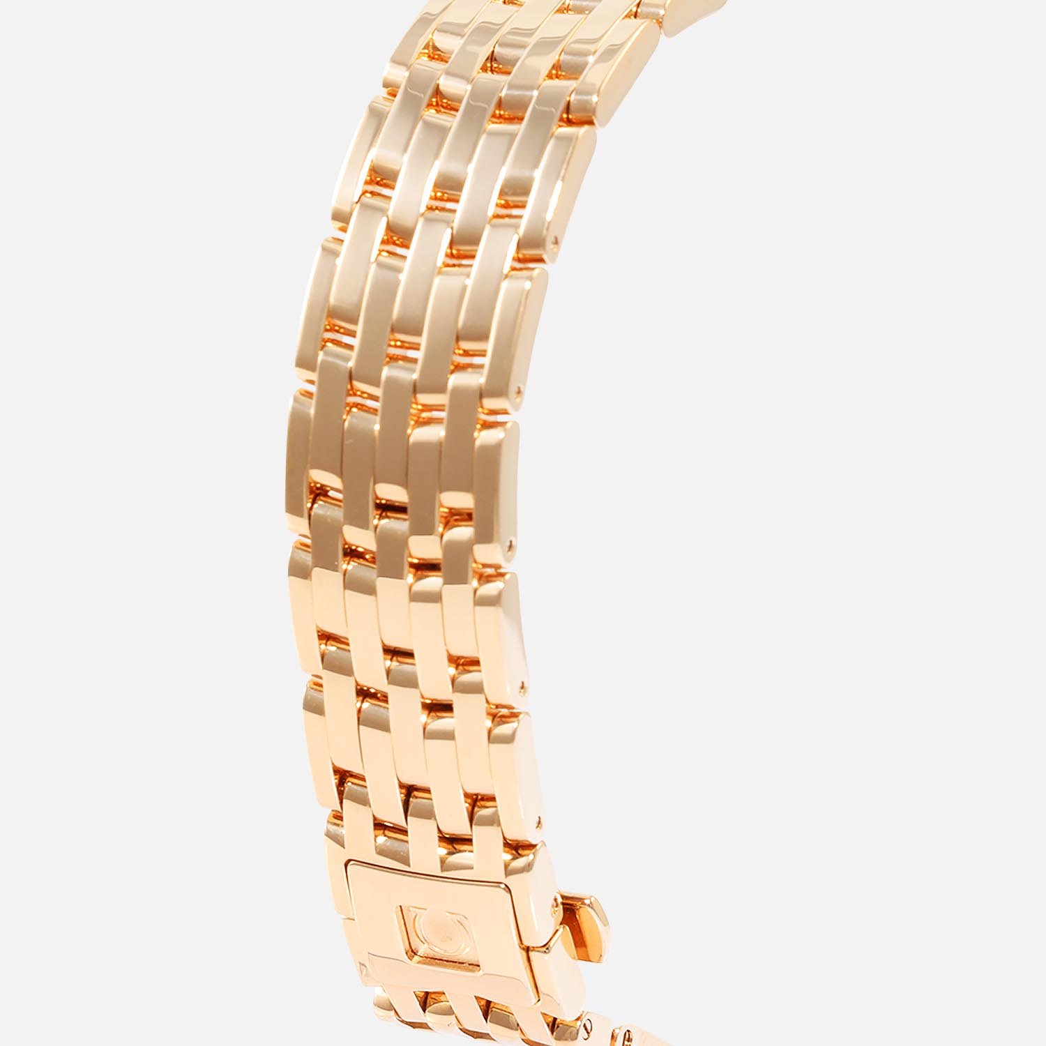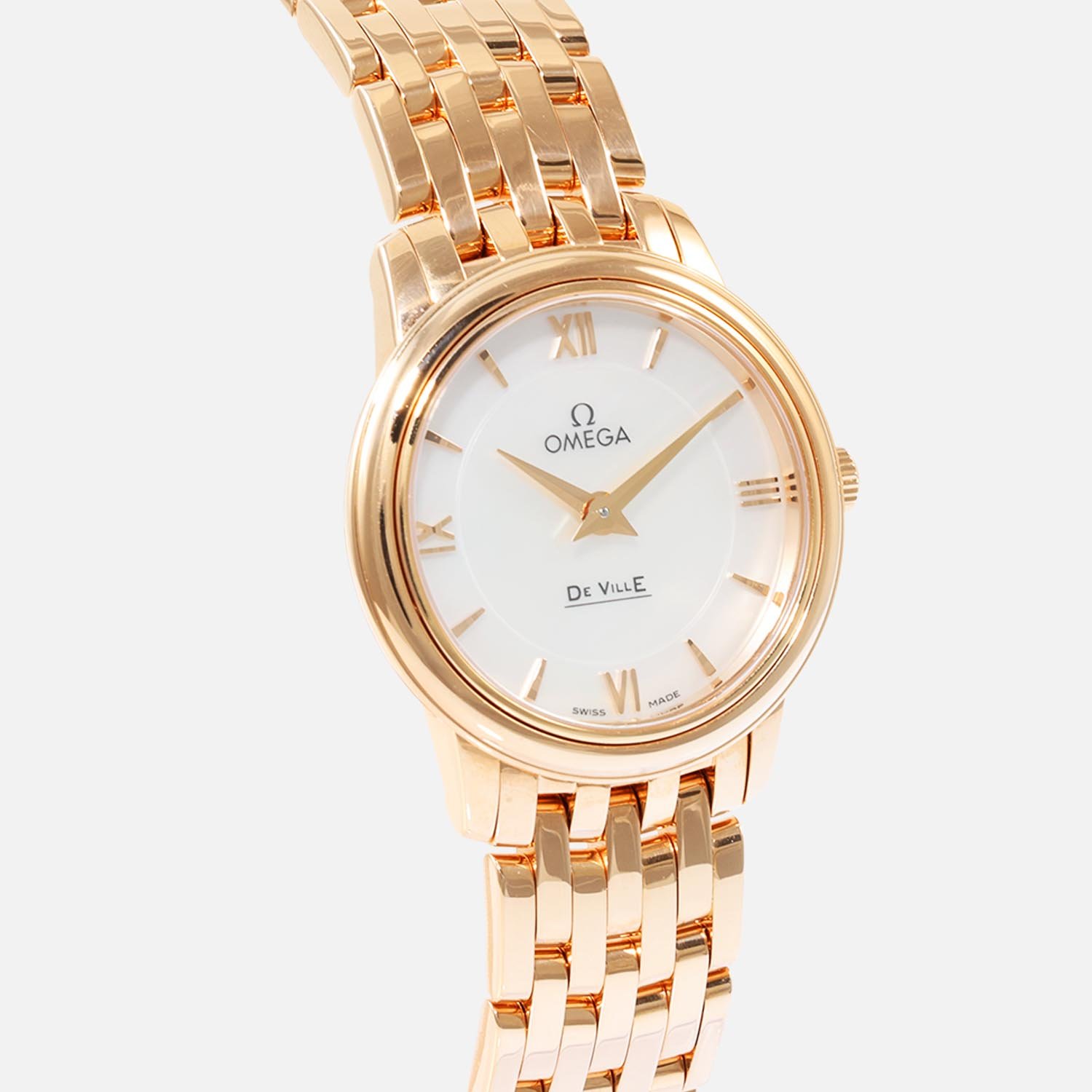 The Omega DeVille Prestige (424.50.27.60.05.002) is a stunning timepiece with a 27.4mm 18K rose gold case and bracelet. It features a quartz movement, a sliding clasp for added security, a mother-of-pearl dial with index and Roman markers, and a smooth bezel.