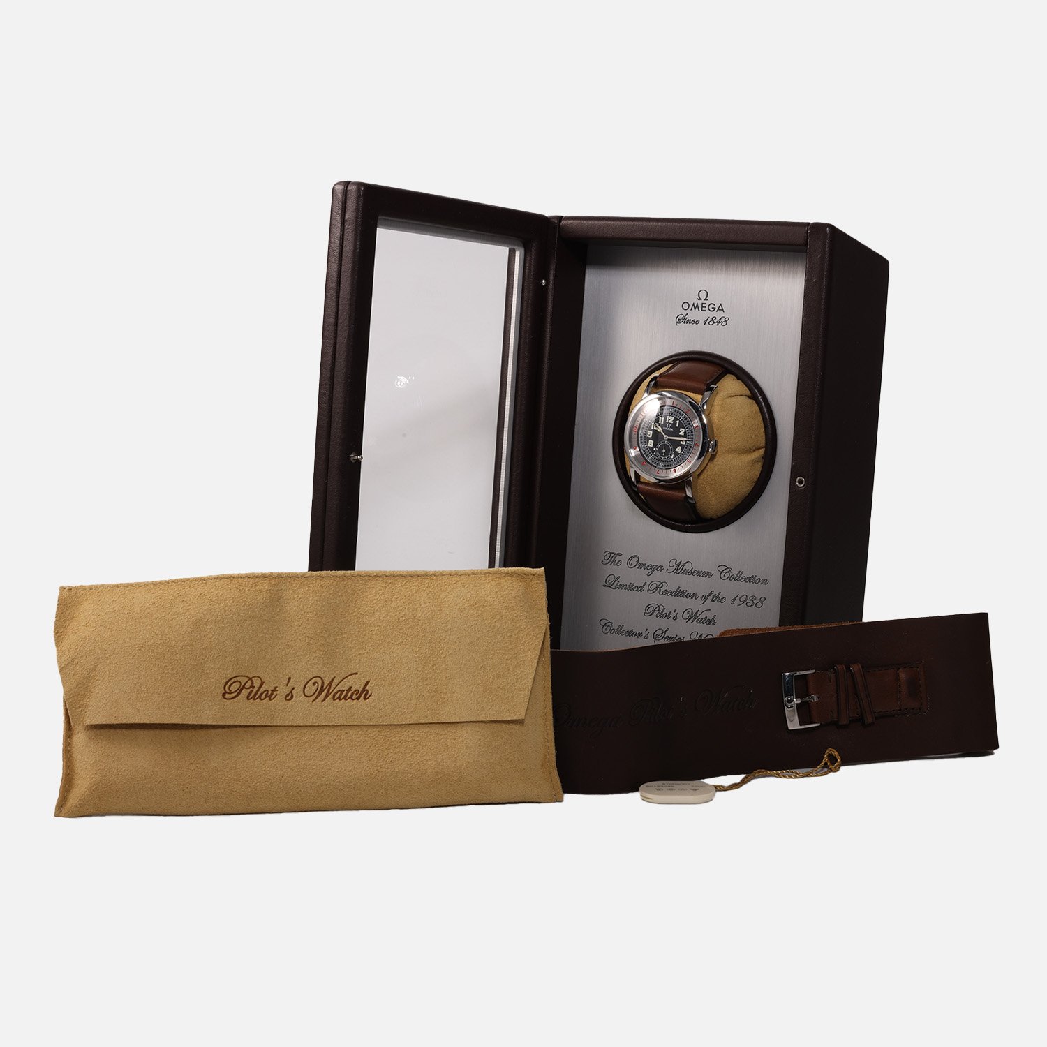 Your purchase includes the Omega Museum Collection Pilot’s Watch Box, along with Omega hang tag, and pilot’s leg strap and pouch. With our 2-year Precision Watches Warranty, you can embrace the heritage of aviation with confidence.
