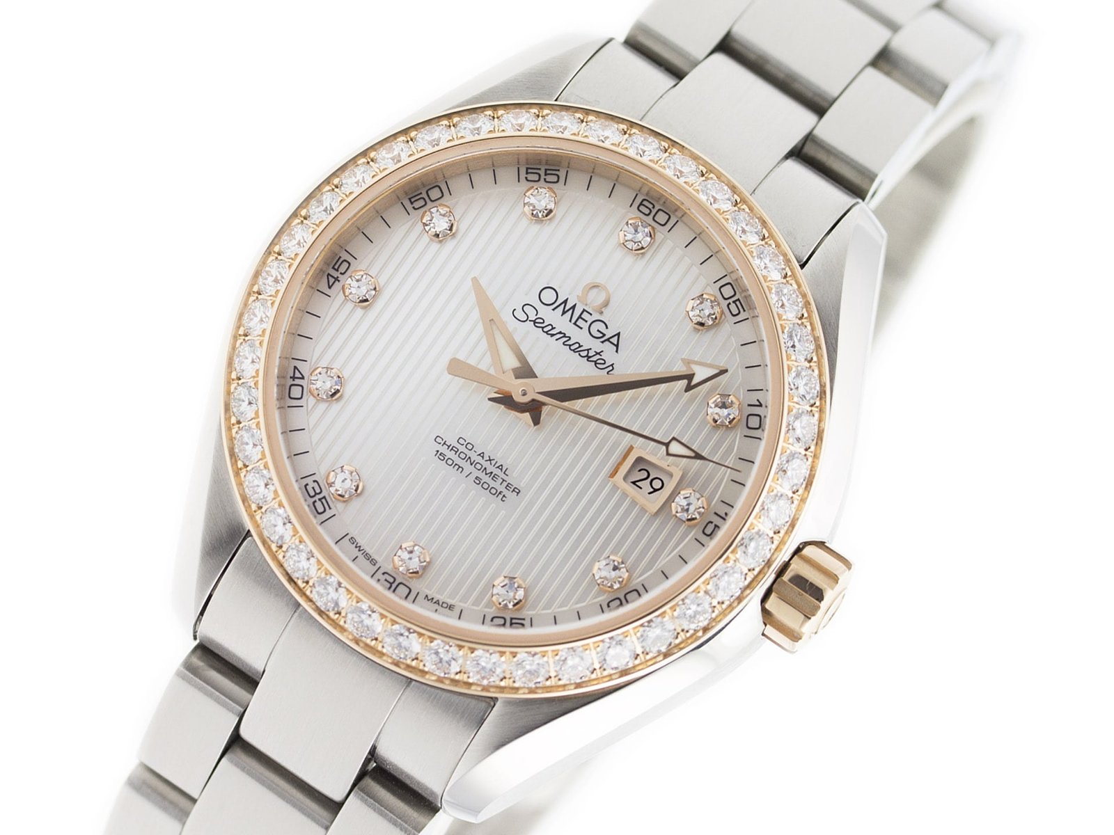 | Crown: | Screwdown, Water Resistant | Key Features: | Automatic, Seamaster, AquaTerra, Ladies, Co-Axial Chronometer, Diamonds, 18K Rose Gold, Mother-of-Pearl | |